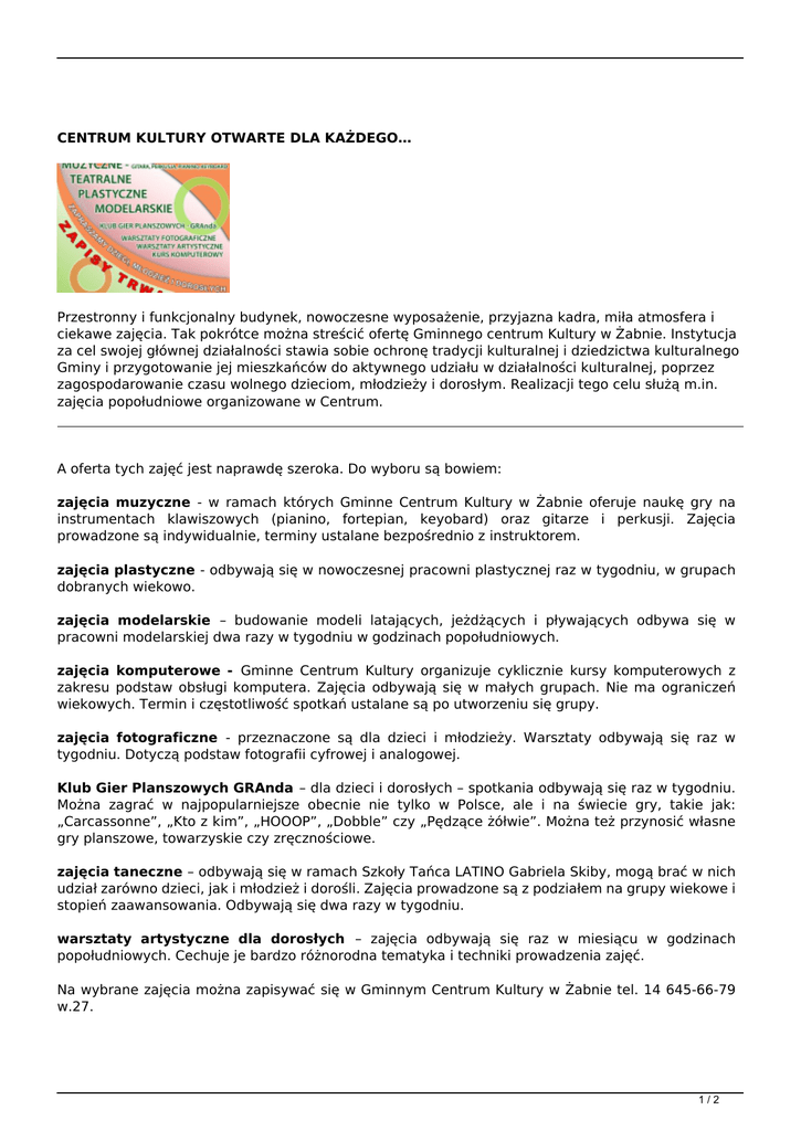 CENTRUM KULTURY OTWARTE DLA KAŻDEGO… Przestronny i funkcjonalny budynek, nowoczesne wyposażenie, przyjazna kadra, miła atmosfera i ciekawe zajęcia. Tak pokrótce można streścić ofertę Gminnego centrum Kultury w Żabnie. Instytucja za cel swojej głównej działalności stawia sobie ochronę tradycji kulturalnej i dziedzictwa kulturalnego Gminy i przygotowanie jej mieszkańców do aktywnego udziału w działalności kulturalnej, poprzez zagospodarowanie czasu wolnego dzieciom, młodzieży i dorosłym. Realizacji tego celu służą m.in. zajęcia popołudniowe organizowane w Centrum. A oferta tych zajęć jest naprawdę szeroka. Do wyboru są bowiem: zajęcia muzyczne - w ramach których Gminne Centrum Kultury w Żabnie oferuje naukę gry na instrumentach klawiszowych (pianino, fortepian, keyobard) oraz gitarze i perkusji. Zajęcia prowadzone są indywidualnie, terminy ustalane bezpośrednio z instruktorem. zajęcia plastyczne - odbywają się w nowoczesnej pracowni plastycznej raz w tygodniu, w grupach dobranych wiekowo. zajęcia modelarskie – budowanie modeli latających, jeżdżących i pływających odbywa się w pracowni modelarskiej dwa razy w tygodniu w godzinach popołudniowych. zajęcia komputerowe - Gminne Centrum Kultury organizuje cyklicznie kursy komputerowych z zakresu podstaw obsługi komputera. Zajęcia odbywają się w małych grupach. Nie ma ograniczeń wiekowych. Termin i częstotliwość spotkań ustalane są po utworzeniu się grupy. zajęcia fotograficzne - przeznaczone są dla dzieci i młodzieży. Warsztaty odbywają się raz w tygodniu. Dotyczą podstaw fotografii cyfrowej i analogowej. Klub Gier Planszowych GRAnda – dla dzieci i dorosłych – spotkania odbywają się raz w tygodniu. Można zagrać w najpopularniejsze obecnie nie tylko w Polsce, ale i na świecie gry, takie jak: „Carcassonne”, „Kto z kim”, „HOOOP”, „Dobble” czy „Pędzące żółwie”. Można też przynosić własne gry planszowe, towarzyskie czy zręcznościowe. zajęcia taneczne – odbywają się w ramach Szkoły Tańca LATINO Gabriela Skiby, mogą brać w nich udział zarówno dzieci, jak i młodzież i dorośli. Zajęcia prowadzone są z podziałem na grupy wiekowe i stopień zaawansowania. Odbywają się dwa razy w tygodniu. warsztaty artystyczne dla dorosłych – zajęcia odbywają się raz w miesiącu w godzinach popołudniowych. Cechuje je bardzo różnorodna tematyka i techniki prowadzenia zajęć. Na wybrane zajęcia można zapisywać się w Gminnym Centrum Kultury w Żabnie tel. 14 645-66-79 w.27. 1/2 2/2 Powered by TCPDF (www.tcpdf.org)