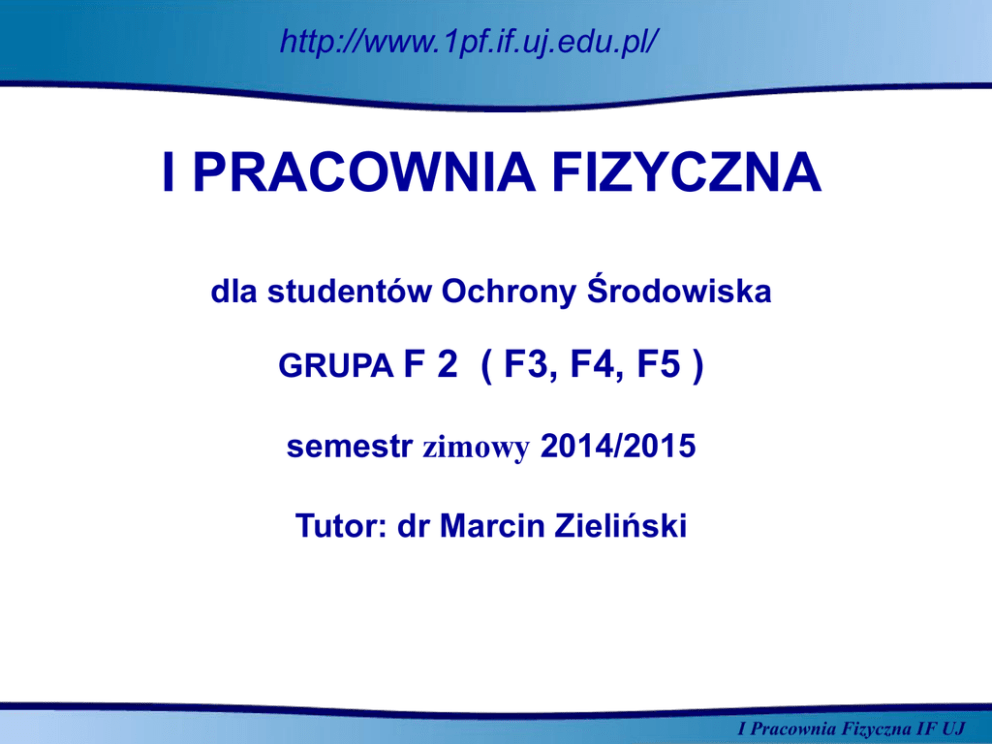 http://www.1pf.if.uj.edu.pl/ I PRACOWNIA FIZYCZNA dla studentów Ochrony Środowiska GRUPA F 2 ( F3, F4, F5 ) semestr zimowy 2014/2015 Tutor: dr Marcin Zieliński I Pracownia Fizyczna IF UJ Zespół I Pracowni Fizycznej prof. dr hab. Paweł MOSKAL e-mail: [email protected] kierownik I Pracowni Fizycznej Pracownicy: Krystyna Grzelak e-mail: [email protected] inż. Andrzej KACZMARSKI e-mail: [email protected] Janusz KONARSKI e-mail: [email protected] tel. 12 664 45 19 http://www.1pf.if.uj.edu.pl/ I Pracownia Fizyczna IF UJ Kalendarz zajęć Ochrona Środowiska Grupa F1 Lp. ćwiczenie data 1. 22 X zebranie organizacyjne 0 2. 29 X Praca własna 3. 5 XI N1 4. 12 XI Praca własna 5. 19 XI 2 6. 26 XI 3 7. 3 XII 4 8. 10 XII 5 9. 17 XII 6 10. 24 XII Przerwa Świąteczna 11. 31 XII Przerwa Świąteczna 12. 7I Pracownia buforowa 7 13. 14 I Pracownia buforowa 8 14. 21 I 15. 28 I 16. 29 I 1 Zajęcia odbywają się w terminie: środa 11:45 – 14:30 Tutor: dr Marcin Zieliński e-mail: [email protected] Należy wykonać i zaliczyć 6 ćwiczeń Ćwiczenie wyznaczane jest na konkretny dzień zajęć. Sesja zimowa W przypadku nieobecności studenta na zajęciach wyznaczone na ten dzień ćwiczenie nie czeka na następny tydzień. Sprawy zdrowotne: – ograniczenia możliwości wykonywania pewnych ćwiczeń, – zwolnienia lekarskie, – możliwość przepisania ćwiczeń wykonywanych na innych uczelniach http://www.1pf.if.uj.edu.pl/ I Pracownia Fizyczna IF UJ Po co jest Pracownia Fizyczna? 1. Obserwacja zjawisk i efektów fizycznych. Samodzielne wykonywanie doświadczeń. 6 ćwiczeń spośród: N1 + N0, C4, ,C15, E3, F6, M16, O2, O10 M21 2. Nauka obsługi prostych i trochę bardziej skomplikowanych przyrządów pomiarowych. 3. Nauka podstaw opracowania wyników pomiarów: – nauka poprawnego wyznaczania wielkości fizycznych, – nauka pomiaru zależności fizycznych i ich opisu, – nauka poprawnej prezentacji wyników. http://www.1pf.if.uj.edu.pl/ I Pracownia Fizyczna IF UJ Przebieg zaliczania ćwiczenia imię i nazwisko studenta .................................................................................................................................. numer grupy: ............................................................................................... kierunek: e-mail: symbol ćwiczenia Sprawozdanie (raport) z wykonanego ćwiczenia powinno zawierać: .............................. ..................................................... – wypełnioną stronę administracyjną – kserokopię wyników pomiarowych – skorygowany plan pracy – część wstępną (część teoretyczną)- nie więcej niż dwie strony A4 – opis eksperymentu – opracowanie wyników włącznie z analizą niepewności pomiarowych – podsumowanie uzyskanych rezultatów temat ćwiczenia ................................... data wykonania ćwiczenia ...................................................................................................... asystent prowadzący ćwiczenie Przebieg zaliczania sprawozdania: Data oddania Uwagi sprawdzającego sprawozdanie: sprawozdania do poprawy: ...................................... Data przyjęcia poprawionego sprawozdania: ...................................... Do poprawy sprawozdanie może być oddane tylko 1 raz Ocena za sprawozdanie przed poprawą: . ……………………………. ............................. data podpis osoby zaliczenia sprawozdania zaliczającej Terminowość oddania sprawozdania oraz końcowa ocena za ćwiczenie: ............................................ data przyjęcia sprawozdania i podpis osoby przyjmującej ............................................ liczba spóźnień lub data regulaminowego oddania sprawozdania ocena końcowa za ćwiczenie (bez obniżenia za spóźnienia) W opracowaniu wyników i analizie niepewności pomiarowych należy podać wzór w postaci z jakiej korzystamy, dokonać pierwszego podstawienia liczb w miejsce symboli, a następnie podać wynik końcowy rachunków Podając wartości z tablic należy podać pełne cytowanie umożliwiające zidentyfikowanie cytowanego źródła tj. autor, tytuł, wydawnictwo, rok wydania Sprawozdanie powinno być oddane na najbliższej pracowni. Opóźnienie oddania sprawozdania o 1 tydzień obniża końcową ocenę o 0.5 punktu. Maksymalnie mogą być dwa spóźnienia. http://www.1pf.if.uj.edu.pl/ I Pracownia Fizyczna IF UJ Przepisy BHP w IPF IF UJ Podczas pracy w I Pracowni Fizycznej mogą wystąpić następujące zagrożenia życia i zdrowia: Porażenie elektryczne. Uszkodzenie wzroku promieniowaniem UV, laserowym i mikrofalowym. Zatrucie drogą pokarmową. Oparzenie odczynnikami. Zranienie w wyniku eksplozji lub implozji aparatury. Zagrożenie pożarowe. W związku z powyższym Studenci przebywający w I Pracowni zobowiązani są do przestrzegania poniższych ustaleń: 1. W pomieszczeniach, w których odbywają się zajęcia laboratoryjne, nie wolno spożywać pokarmów, napojów oraz palić tytoniu. 2. Włączanie urządzeń i zestawionych obwodów elektrycznych do źródeł zasilania może być dokonane jedynie za zgodą prowadzącego. 3. Przy pracy z obwodami elektrycznymi zmontowanymi samodzielnie należy zachować szczególną ostrożność. Modyfikowanie zbudowanego obwodu jest dozwolone jedynie po odłączeniu napięcia zasilającego. 4. Zabronione jest otwieranie obudów oraz manipulacje wewnątrz aparatury. 5. Lampy spektralne Hg, Cd, Zn oraz wyładowania iskrowe są źródłami promieniowania UV. Nie wolno patrzeć bezpośrednio, bez okularów ochronnych na palnik lampy spektralnej lub na wyładowanie iskrowe. 6. Nie wolno patrzeć bezpośrednio w wiązkę promieniowania laserowego i mikrofalowego. Unikać promieniowania rozproszonego i odbitego. 7. Przy pracy z aparaturą próżniową należy zachować szczególną ostrożność. Przy nieodpowiednim postępowaniu może dojść do eksplozji lub implozji elementów aparatury. 8. Należy bardzo ostrożnie obchodzić si
