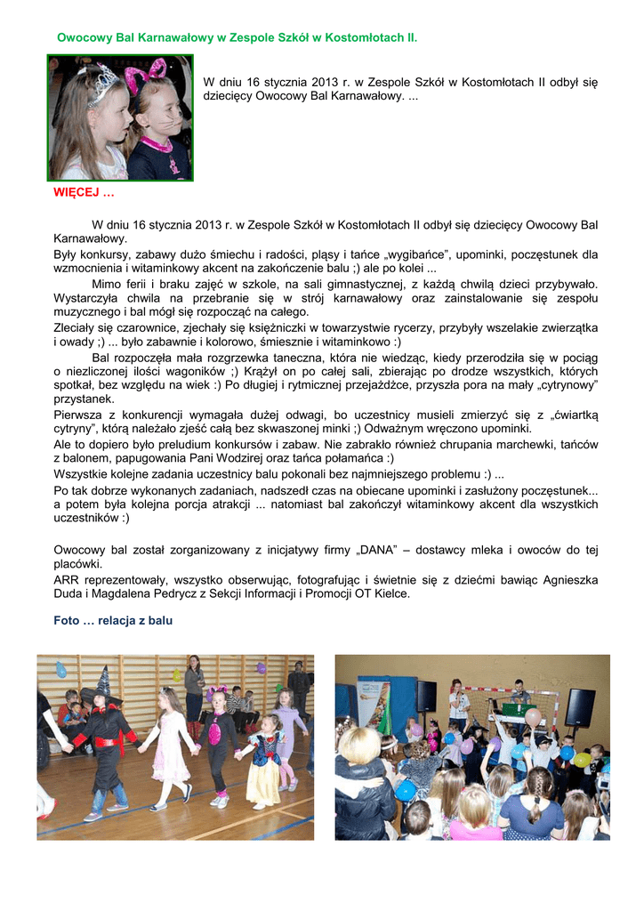 Owocowy Bal Karnawałowy w Zespole Szkół w Kostomłotach II. W dniu 16 stycznia 2013 r. w Zespole Szkół w Kostomłotach II odbył się dziecięcy Owocowy Bal Karnawałowy. ... WIĘCEJ … W dniu 16 stycznia 2013 r. w Zespole Szkół w Kostomłotach II odbył się dziecięcy Owocowy Bal Karnawałowy. Były konkursy, zabawy dużo śmiechu i radości, pląsy i tańce „wygibańce”, upominki, poczęstunek dla wzmocnienia i witaminkowy akcent na zakończenie balu ;) ale po kolei ... Mimo ferii i braku zajęć w szkole, na sali gimnastycznej, z każdą chwilą dzieci przybywało. Wystarczyła chwila na przebranie się w strój karnawałowy oraz zainstalowanie się zespołu muzycznego i bal mógł się rozpocząć na całego. Zleciały się czarownice, zjechały się księżniczki w towarzystwie rycerzy, przybyły wszelakie zwierzątka i owady ;) ... było zabawnie i kolorowo, śmiesznie i witaminkowo :) Bal rozpoczęła mała rozgrzewka taneczna, która nie wiedząc, kiedy przerodziła się w pociąg o niezliczonej ilości wagoników ;) Krążył on po całej sali, zbierając po drodze wszystkich, których spotkał, bez względu na wiek :) Po długiej i rytmicznej przejażdżce, przyszła pora na mały „cytrynowy” przystanek. Pierwsza z konkurencji wymagała dużej odwagi, bo uczestnicy musieli zmierzyć się z „ćwiartką cytryny”, którą należało zjeść całą bez skwaszonej minki ;) Odważnym wręczono upominki. Ale to dopiero było preludium konkursów i zabaw. Nie zabrakło również chrupania marchewki, tańców z balonem, papugowania Pani Wodzirej oraz tańca połamańca :) Wszystkie kolejne zadania uczestnicy balu pokonali bez najmniejszego problemu :) ... Po tak dobrze wykonanych zadaniach, nadszedł czas na obiecane upominki i zasłużony poczęstunek... a potem była kolejna porcja atrakcji ... natomiast bal zakończył witaminkowy akcent dla wszystkich uczestników :) Owocowy bal został zorganizowany z inicjatywy firmy „DANA” – dostawcy mleka i owoców do tej placówki. ARR reprezentowały, wszystko obserwując, fotografując i świetnie się z dziećmi bawiąc Agnieszka Duda i Magdalena Pedrycz z Sekcji Informacji i Promocji OT Kielce. Foto … relacja z balu