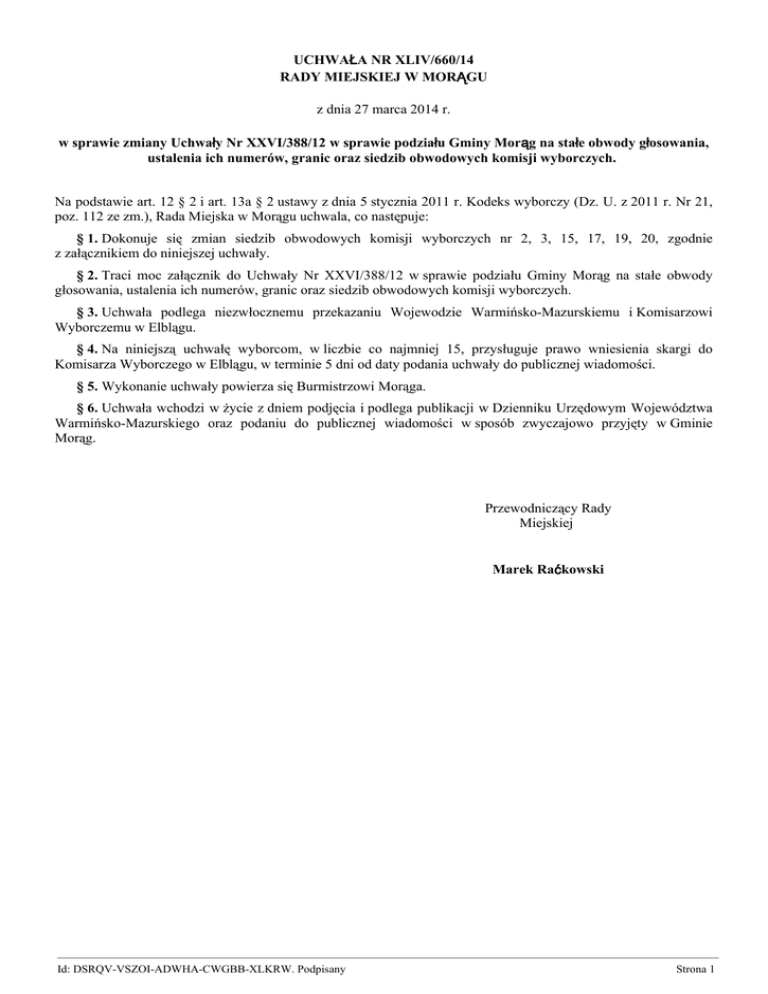 UCHWAŁA NR XLIV/660/14 RADY MIEJSKIEJ W MORĄGU z dnia 27 marca 2014 r. w sprawie zmiany Uchwały Nr XXVI/388/12 w sprawie podziału Gminy Morąg na stałe obwody głosowania, ustalenia ich numerów, granic oraz siedzib obwodowych komisji wyborczych. Na podstawie art. 12 § 2 i art. 13a § 2 ustawy z dnia 5 stycznia 2011 r. Kodeks wyborczy (Dz. U. z 2011 r. Nr 21, poz. 112 ze zm.), Rada Miejska w Morągu uchwala, co następuje: § 1. Dokonuje się zmian siedzib obwodowych komisji wyborczych nr 2, 3, 15, 17, 19, 20, zgodnie z załącznikiem do niniejszej uchwały. § 2. Traci moc załącznik do Uchwały Nr XXVI/388/12 w sprawie podziału Gminy Morąg na stałe obwody głosowania, ustalenia ich numerów, granic oraz siedzib obwodowych komisji wyborczych. § 3. Uchwała podlega niezwłocznemu przekazaniu Wojewodzie Warmińsko-Mazurskiemu i Komisarzowi Wyborczemu w Elblągu. § 4. Na niniejszą uchwałę wyborcom, w liczbie co najmniej 15, przysługuje prawo wniesienia skargi do Komisarza Wyborczego w Elblągu, w terminie 5 dni od daty podania uchwały do publicznej wiadomości. § 5. Wykonanie uchwały powierza się Burmistrzowi Morąga. § 6. Uchwała wchodzi w życie z dniem podjęcia i podlega publikacji w Dzienniku Urzędowym Województwa Warmińsko-Mazurskiego oraz podaniu do publicznej wiadomości w sposób zwyczajowo przyjęty w Gminie Morąg. Przewodniczący Rady Miejskiej Marek Raćkowski ————————————————————————————————————————————————————————— Id: DSRQV-VSZOI-ADWHA-CWGBB-XLKRW. Podpisany Strona 1 Załącznik do uchwały Nr XLIV/660/14 Rady Miejskiej w Morągu z dnia 27. 03. 2014 r. Podział Gminy Morąg na stałe obwody głosowania Numer obwodu głosowania 1. Granice obwodu głosowania Siedziba obwodowej komisji wyborczej Szkoła Podstawowa Nr 2 w Morągu ul. Żeromskiego 26 10. Morąg-ulice: Aleja Wojska Polskiego, Chodkiewicza, Gen.Józefa Bema, Jagiellończyka, Krasińskiego, Mazowiecka, Mazurska, Plac Gdański, Rzemieślnicza, Śląska, Żeromskiego, Morąg-ulice: Akacjowa, Gabriela Narutowicza, Generała Władysława Sikorskiego, Ignacego Daszyńskiego, Jana Kilińskiego, Jodłowa, Lipowa, Łąkowa, Makowa, Malinowa, Marszałka Józefa Piłsudskiego, Świerkowa, Sosnowa, Sowia, Wincentego Witosa, Wronia, Wrzosowa, Morąg-ulice: 3 Maja 1-4,19,21,24, Generała Jana Henryka Dąbrowskiego, Mickiewicza 1-12Z, Kościuszki 1-5, Szpitalna, Wenecka Morąg-ulice: 3 Maja oprócz 1-4,19,21,24, Dworcowa, Kajki, Kolejowa, Kościuszki 6-do końca, Kwiatowa, Plac Kombatantów, Warmińska 14-16 Morąg-ulice: 11 Listopada, Kujawska 4,8,10, Mickiewicza 13,14,1732A, Ogrodowa, Morąg-ulice: Kaszubska, Kujawska-oprócz 4,8,10, Leśna 1-5,7, Przemysłowa , Warmińska 1-13,17-do końca, Morąg-ulice: Herdera, Jagiełły-oprócz nr 1, Kasprowicza, Kościelna, Krzywa, Mickiewicza 15,16, Młyńska, Osińskiego, Plac Jana Pawła II, Rataja, Reymonta, Samulewskiego, Sierakowskiego, Skłodowskiej, Zamkowa, Zawiszy, Zbożowa, Morąg-ulice: Jagiełły 1, Mickiewicza 38A, Pomorska, Pułaskiego 114 (oprócz 6A, 10A), Targowa, Morąg-ulice: Armii Krajowej, Mickiewicza 39, Pułaskiego 15-do końca, Szkolna Morąg-ulice: Leśna 9-do końca, Henryka Sienkiewicza 19-23,32-36 11. Morąg-ulice: Henryka Sienkiewicza 1-18,24-26, Pułaskiego 6A,10A 12. 14. Morąg-ulice: Asnyka, Klonowa, Krańcowa, St.Moniuszki, Ignacego Paderewskiego, Chopina, Radna, Topolowa, Wierzbowa, Zygmunta Wróblewskiego, Bolesława Prusa, Kardynała Wyszyńskiego, Dębowa Gubity, Kadzianka, Kretowiny, Lusajny Małe, Rogowo, Tątławki, Wilnowo, Żabi Róg-oprócz 137-144 Białka, Ruś, Zawroty, Żabi Róg 137-144 15. Bożęcin, Bramka, Lubin, Piłąg, Raj, Silin 16. Bartężek, Morzewko, Prośno, Słonecznik, Szczuplinki, Wenecja 17. Anin, Antoniewo, Dobrocinek, Jędrychówko, Kamionka, Kudypy, Nowy Dwór, Obuchowo, Rolnowo, Szymanowo, Wola Kudypska 18. Chojnik, Kalnik, Kępa Kalnicka, Prętki, Dworek, Królewo 19. Borzymowo, Markowo, Łączno, Zbożne, Złotna 20. Jurki, Jurecki Młyn, Niebrzydowo Małe, Niebrzydowo Wielkie, Plebania Wólka, Stabuniki, Strużyna 21. Bogaczewo, Dury, Gulbity, Kruszewnia, Maliniak, Worytki, Woryty Morąskie, Zwierzyniec 2. 3. 4. 5. 6. 7. 8. 9. 13. MPZN Sp. z o. o. w Morągu ul. Wenecka 1 Szkoła Podstawowa Nr 4 w Morągu ul. Kajki 2 Szkoła Podstawowa Nr 4 w Morągu ul. Kajki 2 Gimnazjum Nr 1 w Morągu ul. Mickiewicza 25 Zespół Szkół Licealnych w Morągu ul. 11 Listopada 7A Ratusz w Morągu ul. Plac Jana Pawła II 1 Szkoła Podstawowa Nr 4 w Morągu ul. Krzywa 2 Przedszkole Nr 2 w Morągu ul. Armii Krajowej 15 Świetlica Spółdzielni Mieszkaniowej „Narie” w Morągu ul. Leśna 22 Przedszkole Nr 6 w Morągu ul. Pomorska 23 Szkoła Podstawowa Nr 3 w Morągu ul. Zygmunta Wróblewskiego 17 Szkoła Podstawowa w Żabim Rogu, Żabi Róg 115A Świetlica w Zawrotach, Zawroty 17A Szkoła Podstawowa w Żabim Rogu Filia w Bramce, Bramka 75 Świetlica w Słoneczniku, Słonecznik 30 Przedsiębiorstwo Oczyszczania Sp. z o.o. w Morągu ul. Wenecka 1 Świetlica w Królewie, Królewo 42 Szkoła Podstawowa w Łącznie, Łączno 48B Niepubliczna Szkoła Podstawowa w Jurkach, Jurki 53 Świetlica w Bogaczewie, Bogaczewo 39A ————————————————————————————————————————————————————————— Id: DSRQV-VSZOI-ADWHA-CWGBB-XLKRW. Podpisany Strona 2