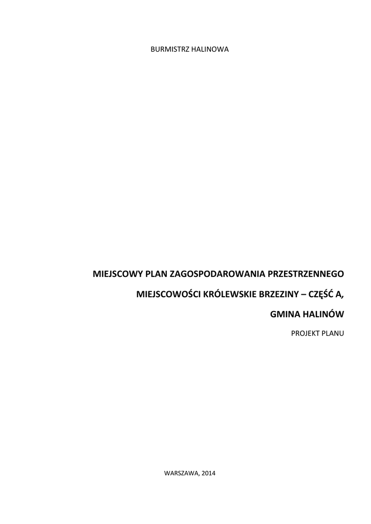 BURMISTRZ HALINOWA MIEJSCOWY PLAN ZAGOSPODAROWANIA PRZESTRZENNEGO MIEJSCOWOŚCI KRÓLEWSKIE BRZEZINY – CZĘŚĆ A, GMINA HALINÓW PROJEKT PLANU WARSZAWA, 2014 MIEJSCOWY PLAN ZAGOSPODAROWANIA PRZESTRZENNEGO MIEJSCOWOŚCI KRÓLEWSKIE BRZEZINY – CZĘŚĆ A, GMINA HALINÓW PROJEKT PLANU – 2014 MIEJSCOWY PLAN ZAGOSPODAROWANIA PRZESTRZENNEGO MIEJSCOWOŚCI KRÓLEWSKIE BRZEZINY – CZĘŚĆ A, GMINA HALINÓW sporządzający: BURMISTRZ HALINOWA wykonawca: BUDPLAN Sp. z o. o. ul. Gen. Ludwika Kickiego 26B/10 04-390 Warszawa główny projektant: mgr inż. Anna Bereś członek OIU w Warszawie – WA-355 mgr inż. arch. Anna Olbromska – Matusiak członek OIU w Warszawie – WA-395 zagospodarowanie przestrzenne: mgr inż. Ilona Musiałek członek OIU w Warszawie – WA-424 inż. Monika Szczypiorska środowisko przyrodnicze: inż. Zuzanna Górecka infrastruktura techniczna: mgr inż. Tomasz Jedynak komunikacja: inż. Monika Szczypiorska 2 MIEJSCOWY PLAN ZAGOSPODAROWANIA PRZESTRZENNEGO MIEJSCOWOŚCI KRÓLEWSKIE BRZEZINY – CZĘŚĆ A, GMINA HALINÓW PROJEKT PLANU – 2014 UCHWAŁA NR ……………………….. RADY MIEJSKIEJ W HALINOWIE z dnia ……………………………… w sprawie miejscowego planu zagospodarowania przestrzennego miejscowości Królewskie Brzeziny – część A, gmina Halinów Na podstawie art. 18 ust. 2 pkt 5 ustawy z dnia 8 marca 1990 roku o samorządzie gminnym (Dz. U. z 2013 roku poz. 594) oraz art. 20 ustawy z dnia 27 marca 2003 roku o planowaniu i zagospodarowaniu przestrzennym (Dz. U. z 2012 roku poz. 647, ze zmianami), w związku z Uchwałą Nr XXXIV/298/2013 Rady Miejskiej w Halinowie z dnia 27 marca 2013 r. w sprawie przystąpienia do sporządzenia miejscowego planu zagospodarowania przestrzennego miejscowości Królewskie Brzeziny, gmina Halinów, zmienionej Uchwałą Nr XLVIII.455.2014 Rady Miejskiej w Halinowie z dnia 30 czerwca 2014 r. w sprawie zmiany uchwały Nr XXXIV.298.2013 Rady Miejskiej w Halinowie z dnia 27 marca 2013 r. w sprawie przystąpienia do sporządzenia miejscowego planu zagospodarowania przestrzennego miejscowości Królewskie Brzeziny, gmina Halinów oraz po stwierdzeniu, że plan nie narusza ustaleń studium uwarunkowań i kierunków zagospodarowania przestrzennego gminy Halinów, przyjętego Uchwałą Nr XXXVIII/333/10 Rady Miejskiej w Halinowie z dnia 11 marca 2010 r., Rada Miejska w Halinowie uchwala, co następuje: Rozdział 1 Ustalenia ogólne §1. Uchwala się miejscowy plan zagospodarowania przestrzennego miejscowości Królewskie Brzeziny – część A, gmina Halinów, zwany dalej planem, składający się z: 1) części tekstowej stanowiącej treść uchwały; 2) części graficznej, na którą składa się rysunek planu sporządzony w skali 1:1000, stanowiący załącznik nr 1 do uchwały; 3) rozstrzygnięcia o sposobie rozpatrzenia uwag wniesionych do projektu planu, stanowiący załącznik nr 2 do uchwały; 4) rozstrzygnięcia o sposobie realizacji, zapisanych w planie, inwestycji z zakresu infrastruktury technicznej, które należą do zadań własnych gminy, oraz zasadach ich finansowania, stanowiący załącznik nr 3 do uchwały. §2. 1. Planem obejmuje się obszar stanowiący część miejscowości Królewskie Brzeziny w gminie Halinów o powierzchni ok. 0,25 ha. 2. Granicę obszaru objętego planem oznaczono na rysunku planu symbolem graficznym. §3. 1. W planie ustala się: 1) przeznaczenie terenów oraz linie rozgraniczające tereny o różnym przeznaczeniu lub różnych zasadach zagospodarowania; 2) zasady ochrony i kształtowania ładu przestrzennego; 3 MIEJSCOWY PLAN ZAGOSPODAROWANIA PRZESTRZENNEGO MIEJSCOWOŚCI KRÓLEWSKIE BRZEZINY – CZĘŚĆ A, GMINA HALINÓW PROJEKT PLANU – 2014 3) szczególne warunki zagospodarowania terenów oraz ograniczenia w ich użytkowaniu, w tym zakaz zabudowy; 4) zasady modernizacji, rozbudowy i budowy systemów komunikacji i infrastruktury technicznej; 5) granice terenów rozmieszczenia inwestycji celu publicznego o znaczeniu lokalnym; 6) granice terenów inwestycji celu publicznego o znaczeniu ponadlokalnym, umieszczonych w planie zagospodarowania przestrzennego województwa. 2. Z powodu braku okoliczności faktycznie uzasadniających dokonanie takich ustaleń, w planie nie ustala się: 1) 2) 3) 4) zasad ochrony środowiska, przyrody i krajobrazu kulturowego; zasad ochrony dziedzictwa kulturowego i zabytków oraz dóbr kultury współczesnej; wymagań wynikających z potrzeb kształtowania przestrzeni publicznych; zasad kształtowania zabudowy oraz wskaźników zagospodarowania terenu, maksymalnej i minimalnej intensywności zabudowy jako wskaźnika powierzchni całkowitej zabudowy w odniesieniu do powierzchni działki budowlanej, minimalnego udziału procentowego powierzchni biologicznie czynnej w odniesieniu do powierzchni działki budowlanej, maksymalnej wysokości zabudowy, minimalnej liczby miejsc do parkowania i sposobu ich realizacji oraz linii zabudowy i gabarytów obiektów; 5) granic i sposobów zagospodarowania terenów górniczych, a także obszarów szczególnego zagrożenia powodzią oraz obszarów usuwania się mas ziemnych; 6) szczegółowych zasad i warunków scalania i podziału nieruchomości objętych planem miejscowym; 7) sposobu i terminu tymczasowego zagospodarowania, urządzania i użytkowania terenów. §4. 1. Ilekroć w uchwale jest mowa o: 1) pas technologiczny napowietrznej linii elektroenergetycznej o napięciu 400 kV – należy przez to rozumieć obszar, którego oś symetrii wyznacza trasa napowietrznej linii elektroenergetycznej, przeznaczony do konserwacji i eksploatacji tej linii i urządzeń infrastruktury technicznej o szerokości 80 metrów (po 40 metrów w obie strony od osi linii); 2) przeznaczeniu dopuszczalnym – należy przez to rozumieć ustalone w planie przeznaczenie inne niż podstawowe, dopuszczone na zasadach określonych planem; 3) przeznaczeniu podstawowym – należy przez to rozumieć ustalone w planie przeznaczenie domin
