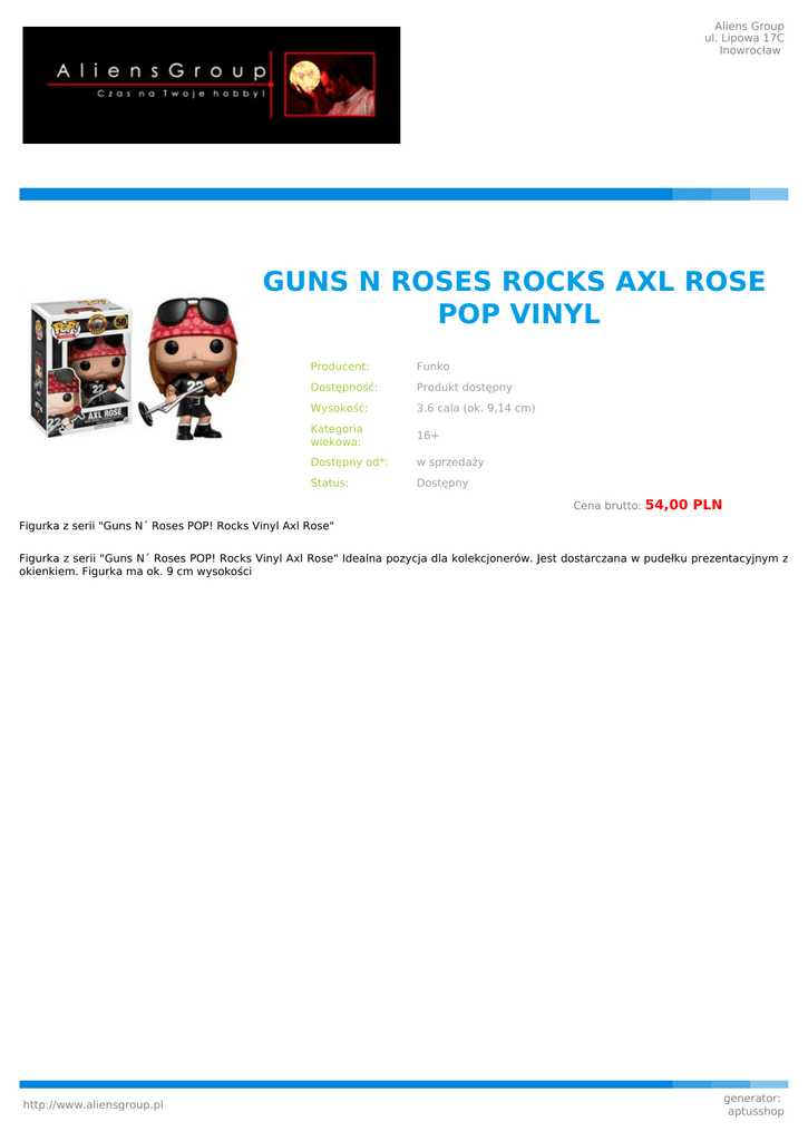 Aliens Group ul. Lipowa 17C Inowrocław GUNS N ROSES ROCKS AXL ROSE POP VINYL Producent: Funko Dostępność: Produkt dostępny Wysokość: 3.6 cala (ok. 9,14 cm) Kategoria wiekowa: 16+ Dostępny od*: w sprzedaży Status: Dostępny Cena brutto: 54,00 PLN Figurka z serii "Guns N´ Roses POP! Rocks Vinyl Axl Rose" Figurka z serii "Guns N´ Roses POP! Rocks Vinyl Axl Rose" Idealna pozycja dla kolekcjonerów. Jest dostarczana w pudełku prezentacyjnym z okienkiem. Figurka ma ok. 9 cm wysokości http://www.aliensgroup.pl generator: aptusshop