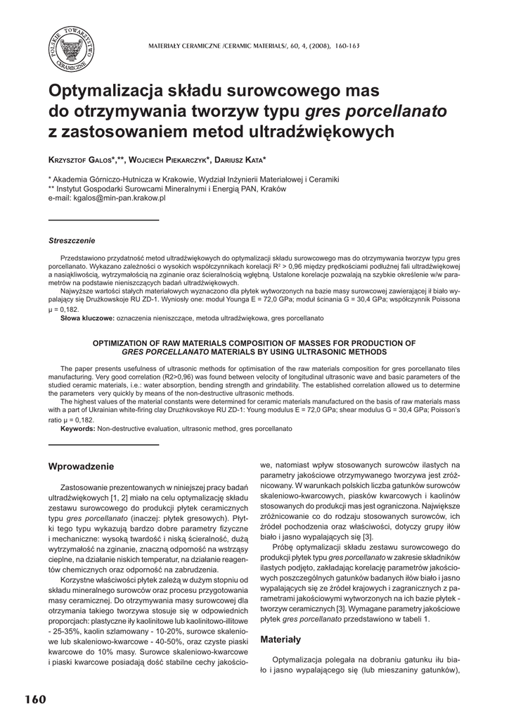 MATERIA£Y CERAMICZNE /CERAMIC MATERIALS/, 60, 4, (2008), 160-163 Optymalizacja skadu surowcowego mas do otrzymywania tworzyw typu gres porcellanato z zastosowaniem metod ultradwikowych KRZYSZTOF GALOS*,**, WOJCIECH PIEKARCZYK*, DARIUSZ KATA* * Akademia Górniczo-Hutnicza w Krakowie, Wydzia Inynierii Materiaowej i Ceramiki ** Instytut Gospodarki Surowcami Mineralnymi i Energi PAN, Kraków e-mail: [email protected] Streszczenie Przedstawiono przydatno metod ultradwikowych do optymalizacji skadu surowcowego mas do otrzymywania tworzyw typu gres porcellanato. Wykazano zalenoci o wysokich wspóczynnikach korelacji R2 > 0,96 midzy prdkociami podunej fali ultradwikowej a nasikliwoci, wytrzymaoci na zginanie oraz cieralnoci wgbn. Ustalone korelacje pozwalaj na szybkie okrelenie w/w parametrów na podstawie nieniszczcych bada ultradwikowych. Najwysze wartoci staych materiaowych wyznaczono dla pytek wytworzonych na bazie masy surowcowej zawierajcej i biao wypalajcy si Drukowskoje RU ZD-1. Wyniosy one: modu Younga E = 72,0 GPa; modu cinania G = 30,4 GPa; wspóczynnik Poissona = 0,182. Sowa kluczowe: oznaczenia nieniszczce, metoda ultradwikowa, gres porcellanato OPTIMIZATION OF RAW MATERIALS COMPOSITION OF MASSES FOR PRODUCTION OF GRES PORCELLANATO MATERIALS BY USING ULTRASONIC METHODS The paper presents usefulness of ultrasonic methods for optimisation of the raw materials composition for gres porcellanato tiles manufacturing. Very good correlation (R2>0,96) was found between velocity of longitudinal ultrasonic wave and basic parameters of the studied ceramic materials, i.e.: water absorption, bending strength and grindability. The established correlation allowed us to determine the parameters very quickly by means of the non-destructive ultrasonic methods. The highest values of the material constants were determined for ceramic materials manufactured on the basis of raw materials mass with a part of Ukrainian white-ring clay Druzhkovskoye RU ZD-1: Young modulus E = 72,0 GPa; shear modulus G = 30,4 GPa; Poisson’s ratio = 0,182. Keywords: Non-destructive evaluation, ultrasonic method, gres porcellanato Wprowadzenie Zastosowanie prezentowanych w niniejszej pracy bada ultradwikowych [1, 2] miao na celu optymalizacj skadu zestawu surowcowego do produkcji pytek ceramicznych typu gres porcellanato (inaczej: pytek gresowych). Pytki tego typu wykazuj bardzo dobre parametry zyczne i mechaniczne: wysok twardo i nisk cieralno , du wytrzymao na zginanie, znaczn odporno na wstrzsy cieplne, na dziaanie niskich temperatur, na dziaanie reagentów chemicznych oraz odporno na zabrudzenia. Korzystne waciwoci pytek zale w duym stopniu od skadu mineralnego surowców oraz procesu przygotowania masy ceramicznej. Do otrzymywania masy surowcowej dla otrzymania takiego tworzywa stosuje si w odpowiednich proporcjach: plastyczne iy kaolinitowe lub kaolinitowo-illitowe - 25-35%, kaolin szlamowany - 10-20%, surowce skaleniowe lub skaleniowo-kwarcowe - 40-50%, oraz czyste piaski kwarcowe do 10% masy. Surowce skaleniowo-kwarcowe i piaski kwarcowe posiadaj do stabilne cechy jakocio- 160 we, natomiast wpyw stosowanych surowców ilastych na parametry jakociowe otrzymywanego tworzywa jest zrónicowany. W warunkach polskich liczba gatunków surowców skaleniowo-kwarcowych, piasków kwarcowych i kaolinów stosowanych do produkcji mas jest ograniczona. Najwiksze zrónicowanie co do rodzaju stosowanych surowców, ich róde pochodzenia oraz waciwoci, dotyczy grupy iów biao i jasno wypalajcych si [3]. Prób optymalizacji skadu zestawu surowcowego do produkcji pytek typu gres porcellanato w zakresie skadników ilastych podjto, zakadajc korelacj parametrów jakociowych poszczególnych gatunków badanych iów biao i jasno wypalajcych si ze róde krajowych i zagranicznych z parametrami jakociowymi wytworzonych na ich bazie pytek tworzyw ceramicznych [3]. Wymagane parametry jakociowe pytek gres porcellanato przedstawiono w tabeli 1. Materiay Optymalizacja polegaa na dobraniu gatunku iu biao i jasno wypalajcego si (lub mieszaniny gatunków), OPTYMALIZACJA SKADU SUROWCOWEGO MAS DO OTRZYMYWANIA TWORZYW TYPU... Tab. 1. Podstawowe parametry technologiczne pytek ceramicznych grupy BIa (pytek gres porcellanato) wg normy PN-EN 14411:20071 Parametr Wymagania Nasikliwo wodna 0,5% Wytrzymao na zginanie 35 N/mm2 Odporno na cieranie wgbne 175 mm Tab. 2. Zestawienie zastosowanych do mas iów biao i jasno wypalajcych si oraz oznaczenia badanych mas ceramicznych z ich udziaem 3 1 badane s take m.in. mrozoodporno, odporno na szok termiczny, odporno na uderzenia, biao, odporno na plamienie i odporno na rodki chemiczne z którego otrzymane tworzywo bdzie miao cechy tworzywa typu gres porcellanato, czyli bdzie speniao wymagania przedstawione w w/w normie (tab. 1). W przygotowanych 11 zestawach surowcowych trzy gówne skadniki masy surowcowej byy stae: 1 - surowce skaleniowo-kwarcowe pochodzce z zakadu krajowego i czeskiego, w cznym udziale w masach pytek wynoszcym 50%; 2 - kaolin szlamowany (tzw. „placek kaolinowy”) z zakadu krajowego, którego udzia w masach wynosi 10%; 3 - piasek kwarcowy z zakadu krajowego, którego udzia w masach wynosi 5%. Zmienny by czwarty gówny skadnik, czyli i biao wypalajcy si. Stanowi on 35% masy zestawu. Nazw gatunku iu oraz oznaczenie masy z udziaem tego iu przedstawiono w tabeli 2. Zestawy surowcowe po rozdrobnieniu do wielkoci ziaren poniej 60 m zostay uformowane w prasie jednoosiowej pod cinieniem 40 MPa i wypalone w standardowym procesie produkcyjnym w piecu rolkowym. czny czas wypalania wynosi 42 minuty, a temperatura maksymalna 1200oC. Po wypaleniu uzyskano pytki tworzyw o wymiarach rednich 103 x 51,7 x 5,5 mm, dla których wyznaczone zostay pozostae podstawowe parametry zgodnie z norm PN-EN 14411:2007: nasikliwo wodna, wytrzymao na zginanie, wytrzymao na cieranie wgbne, biao (tab. 3). W dalszej kolejnoci na wybranych sporód w/w pytek wykonano badania ultradwikowe. Aparatura i metodyka W badaniach ultradwikowych stosow