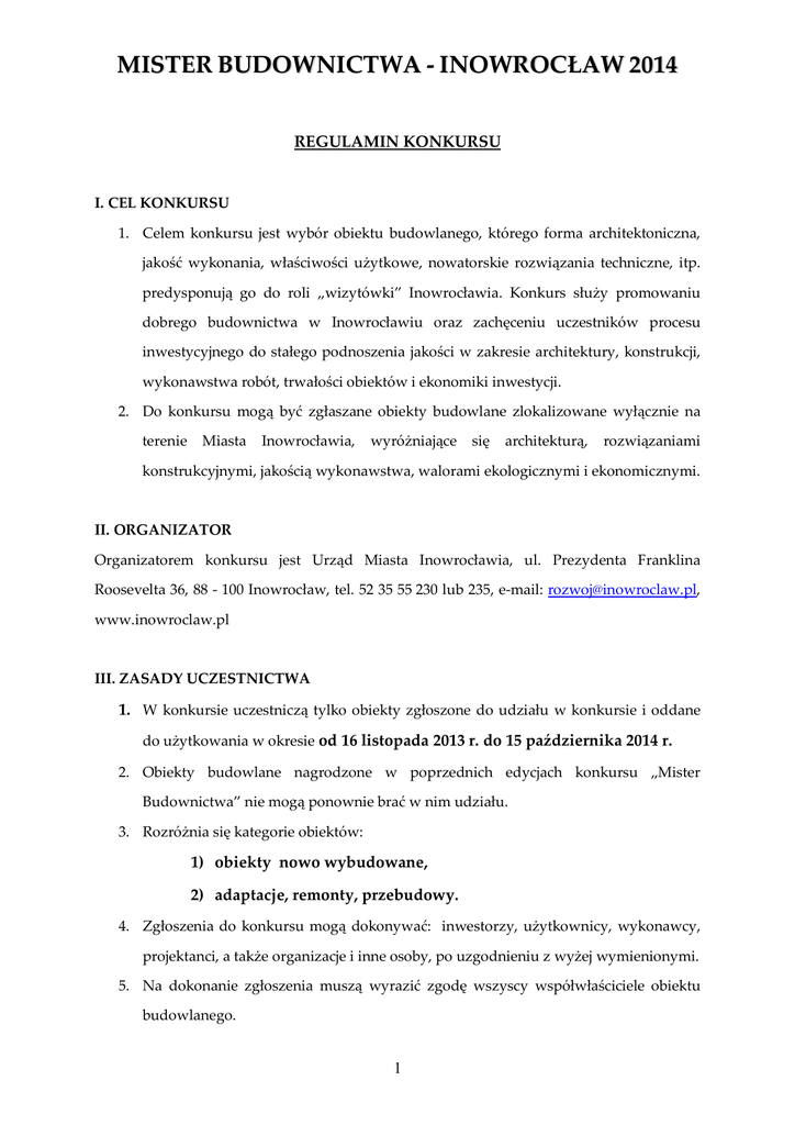 MISTER BUDOWNICTWA - INOWROCŁAW 2014 REGULAMIN KONKURSU I. CEL KONKURSU 1. Celem konkursu jest wybór obiektu budowlanego, którego forma architektoniczna, jakość wykonania, właściwości użytkowe, nowatorskie rozwiązania techniczne, itp. predysponują go do roli „wizytówki” Inowrocławia. Konkurs służy promowaniu dobrego budownictwa w Inowrocławiu oraz zachęceniu uczestników procesu inwestycyjnego do stałego podnoszenia jakości w zakresie architektury, konstrukcji, wykonawstwa robót, trwałości obiektów i ekonomiki inwestycji. 2. Do konkursu mogą być zgłaszane obiekty budowlane zlokalizowane wyłącznie na terenie Miasta Inowrocławia, wyróżniające się architekturą, rozwiązaniami konstrukcyjnymi, jakością wykonawstwa, walorami ekologicznymi i ekonomicznymi. II. ORGANIZATOR Organizatorem konkursu jest Urząd Miasta Inowrocławia, ul. Prezydenta Franklina Roosevelta 36, 88 - 100 Inowrocław, tel. 52 35 55 230 lub 235, e-mail: [email protected], www.inowroclaw.pl III. ZASADY UCZESTNICTWA 1. W konkursie uczestniczą tylko obiekty zgłoszone do udziału w konkursie i oddane do użytkowania w okresie od 16 listopada 2013 r. do 15 października 2014 r. 2. Obiekty budowlane nagrodzone w poprzednich edycjach konkursu „Mister Budownictwa” nie mogą ponownie brać w nim udziału. 3. Rozróżnia się kategorie obiektów: 1) obiekty nowo wybudowane, 2) adaptacje, remonty, przebudowy. 4. Zgłoszenia do konkursu mogą dokonywać: inwestorzy, użytkownicy, wykonawcy, projektanci, a także organizacje i inne osoby, po uzgodnieniu z wyżej wymienionymi. 5. Na dokonanie zgłoszenia muszą wyrazić zgodę wszyscy współwłaściciele obiektu budowlanego. 1 MISTER BUDOWNICTWA - INOWROCŁAW 2014 6. Zgłoszenia do konkursu dokonuje się na druku: „Zgłoszenie do konkursu”, stanowiącym załącznik do niniejszego Regulaminu. Formularze zgłoszeniowe są dostępne na stronie internetowej www.inowroclaw.pl oraz w Wydziale Inwestycji, Rozwoju Gospodarczego i Funduszy Europejskich Urzędu Miasta Inowrocławia, ul. Prezydenta Franklina Roosevelta 33, pokój nr 18. 7. Zgłoszenie do konkursu powinno nastąpić do 21 października 2014 r. 8. Zgłoszenie należy przesłać na adres: Urząd Miasta Inowrocławia Wydział Inwestycji, Rozwoju Gospodarczego i Funduszy Europejskich ul. Prezydenta Franklina Roosevelta 33, 88-100 Inowrocław z dopiskiem: „MISTER BUDOWNICTWA – INOWROCŁAW 2014” 9. Warunkiem przyjęcia zgłoszenia jest dostarczenie wypełnionego formularza zgłoszeniowego. Do ww. dokumentu należy dołączyć dokumentację techniczną, w tym decyzję o pozwoleniu na użytkowanie budynku, bądź zgłoszenie do użytkowania budynku, a w przypadkach przewidzianych prawem (strefa konserwatorska) – uzgodnienie z konserwatorem zabytków. Ponadto należy dołączyć zdjęcia obiektu, a w kategorii „adaptacje, remonty, przebudowy” prezentujące go zarówno przed, jak i po adaptacji, remoncie czy przebudowie, które zostaną wykorzystane do prezentacji multimedialnej podczas rozstrzygnięcia konkursu i w informacjach prasowych. Jednocześnie istnieje możliwość załączenia dowolnych materiałów dokumentujących zasadność zgłoszenia, w tym wizualizacji, fotografii, itp. 10. Organizator nie ponosi odpowiedzialności za przekazane materiały przez zgłaszających. Za ewentualne naruszenie praw autorskich odpowiada zgłaszający i z tego tytułu ponosi pełną odpowiedzialność. 11. Zgłoszenie obiektu do konkursu jest równoznaczne z akceptacją jego Regulaminu. IV. NADANIE TYTUŁU 1. Do nadania tytułu Mister Budownictwa jest uprawniona Kapituła składająca się z osób zaproszonych przez Organizatora. 2. Kapituła jest całkowicie niezależna, niezawisła. 2 MISTER BUDOWNICTWA - INOWROCŁAW 2014 3. Kapitule przewodniczy Prezydent Miasta Inowrocławia. 4. W przypadku, gdy członek Kapituły nie może wziąć udziału w posiedzeniu, ma on prawo (po poinformowaniu Organizatora) do wskazania swojego zastępcy, który przejmuje prawo głosu członka Kapituły. 5. W swoich pracach Kapituła uwzględnia opinię inwestorów i użytkowników ocenianych obiektów, ewentualnie dokonując wizytacji poszczególnych obiektów. 6. Organizator prześle członkom Kapituły materiały informacyjne, stworzone na podstawie formularzy zgłoszeniowych uczestników konkursu na 7 dni przed posiedzeniem Kapituły. 7. Każdemu członkowi Kapituły przysługuje jeden głos. Tytuł “Mister Budownictwa – Inowrocław 2014” w poszczególnych kategoriach otrzyma ten obiekt, który zostanie wybrany bezwzględną większością głosów. W przypadku równej liczby głosów o rozstrzygnięciu zadecyduje Przewodniczący Kapituły. 8. Kapituła zastrzega sobie prawo do nieprzyznania tytułu „Mister Budownictwa Inowrocław 2014”. 9. Werdykt Kapituły wraz z uzasadnieniem przyznania tytułu „Mister Budownictwa Inowrocław 2014” zostaje zapisany w formie protokołu z posiedzenia konkursowego. V. KRYTERIA OCENY Do głównych kryteriów oceny należą: 1) forma architektoniczna, 2) funkcjonalność (walory użytkowe i estetyczne), 3) jakość wykonawstwa, 4) nowoczesność zastosowanych rozwiązań projektowych, 5) zagospodarowanie bezpośredniego otoczenia obiektu budowlanego, 6) wkomponowanie obiektu w otaczający teren. VI. NAGRODY 1. Dla zwycięzcy w każdej kategorii przewidziano: 1) tablicę pamiątkową do umieszczenia na obiekcie, 2) statuetki dla inwestora, głównego projektanta i generalnego wykonawcy, 3) dyplomy dla inwestora, głównego projektanta i generalnego wykonawcy, 3 MISTER BUDOWNICTWA - INOWROCŁAW 2014 4) nagrodę pieniężną w wysokości 5 000,00 złotych brutto dla inwestora, 5) prawo używania tytułu “Mister Budownictwa - Inowrocław 2014” w materiałach promocyjno-reklamowych zwycięzcy. 2. Podsumowanie konkursu, uhonorowanie zwycięzców i wręczenie nagród nastąpi podczas dorocznej gali, w terminie wyznaczonym przez Kapitułę konkursu, nie później 