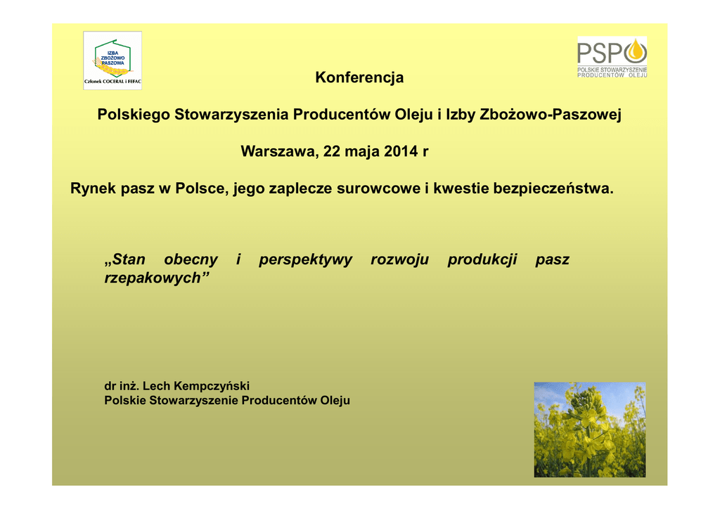 Konferencja Polskiego Stowarzyszenia Producentów Oleju i Izby ZboŜowo-Paszowej Warszawa, 22 maja 2014 r Rynek pasz w Polsce, jego zaplecze surowcowe i kwestie bezpieczeństwa. „Stan obecny rzepakowych” i perspektywy dr inŜ. Lech Kempczyński Polskie Stowarzyszenie Producentów Oleju rozwoju produkcji pasz Wstęp Wobec wzrastającej chłonności rynku chińskiego i innych rynków dalekowschodnich, rynek polski moŜe okazać się w pewnym momencie mało interesujący dla największych na świecie producentów soi nawet jeśli rozpatrywać go jako część unijnego jej rynku dlatego uzasadniona jest wielopłaszczyznowa koncentracja działań wokół zagadnień związanych z produkowanymi w kraju paszami rzepakowymi tym bardziej, Ŝe nasza produkcja zwierzęca jest juŜ w wysokim stopniu zakładnikiem światowych wytwórców soi. Krajowy przemysł olejarski Potencjał przerobowy krajowego przemysłu olejarskiego w zakresie przerobu nasion rzepaku wynosi obecnie ponad 3,2 mln ton nasion rocznie. Zakłady przetwórcze skupione w PSPO przerobiły w roku 2013 około 2,25 mln ton nasion rzepaku i wyprodukowały: • • • ok. 935 tys. ton surowego oleju rzepakowego. ok. 387 tys ton oleju rafinowanego. ok. 1,29 mln. ton pasz rzepakowych. Polski przemysł olejarski charakteryzuje się: • wysokim stopniem koncentracji, • nowoczesnym wyposaŜeniem technicznym 60% - na produkcję biodiesela Produkty przemysłu olejarskiego rafinowany olej rzepakowy na cele spoŜywcze estryfikacja na cele paliwowe surowy olej rzepakowy śruta poekstrakcyjna i makuch nasiona rzepaku Śruty roślin oleistych w sezonie 2013/2014 Bilans śrut roślin oleistych w Unii Europejskiej w sezonie 2013/2014 Lp . Rodzaj śruty Zapas początkowy Produkcja Import Eksport mln ton mln ton mln ton mln ton 1 Rzepakowa 0,1 12,8 0,2 0,3 2 Sojowa 0,5 9,2 21,8 0,5 3 Słonecznikowa 0,1 3,6 3,0 0,1 4 Razem 0,7 25,6 23,0 0,9 W sezonie 2013/14 produkcja śrut oleistych w Unii Europejskiej osiągnie poziom 25,6 mln ton wobec 24,6 mln ton sezon wcześniej (+4,1%). Prognozy zakładają stabilny poziom importu śrut. Wg. FAMMU/FAPA 2014 Śruta rzepakowa w Polsce Obecnie potencjał produkcyjny pasz rzepakowych wynosi około 2,1 mln ton. Podobnie jak we wcześniejszych latach, prawie połowa śruty rzepakowej - około 47 % - wyprodukowanej w Polsce jest eksportowana Główne kierunki eksportu to: Niemcy 20% Hiszpania 19% oraz Dania, Irlandia i Holandia. Łącznie do tych 5 krajów eksportowane jest jej 75%. W kraju pasze rzepakowe – około 53% produkcji- wykorzystywane są w: • przemyśle paszowym, • dietach poza mieszankami paszowymi Struktura eksportu śrut roślin oleistych w Polsce w roku 2012 i 2013 Lp Rodzaj śruty 2012 2013 w mln ton w mln ton 1 Sojowa 0,07 0,06 2 Rzepakowa 0,55 0,6 3 Słonecznikowa bd bd 4 Razem 0,62 0,66 Wg. „Sparks 02 2014 r. Struktura importu śrut roślin oleistych w Polsce w roku 2012 i 2013 Lp Rodzaj śruty 2012 2013 w mln ton w mln ton 1 Sojowa 1,9 1,9 2 Rzepakowa 0,02 0,06 3 Słonecznikowa* 1,1 0,40 4 Razem 3.02 2,36 Wg. „Sparks 02 2014 r. *dane wg Sparks obejmują w kodzie CN 23063000 import śruty słonecznikowej i peletów z łusek słonecznika do celów energetycznych poniewaŜ produkty te importowane są pod tym samym numerem kodu CN Produkcja śruty rzepakowej i import śruty sojowej w Polsce 2002-2011 Rozwój rynku biopaliwowego spowodował istotny wzrost przerobu nasion rzepaku i w konsekwencji wzrost produkcji pasz rzepakowych – śruty poekstrakcyjnej oraz makuchu rzepakowego. 98,5% * 98,2% * W sezonie 2012/13 w UE-28 o 7% do 29,0 mln ton zmalało zuŜycie śruty sojowej a zuŜycie śruty rzepakowej wzrosło o 2,4% do 12,6 mln ton. * produkcja krajowa Opracowanie KIB wg GUS, IERGś Światowy rynek rzepaku w roku 2014 Dane szacunkowe wskazują, ze globalna produkcja rzepaku w roku 2014 nadal pozostanie na wysokim poziomie i wyniesie około 70 mln ton, obecnie nie ma zagroŜenia, Ŝe zapasy rzepaku nie zostaną odbudowane po obecnym sezonie zbiorów. W tym sezonie zostanie zebrane w: Kanadzie 17,9 mln ton, Chinach 11,7 mln ton, Indiach 7,3 mln ton, Australii 3,9 mln ton, w WNP 2,3 mln ton i na Ukrainie około 2,5 mln ton nasion rzepaku. Produkcja rzepaku w Unii Europejskiej powinna ponownie przekroczyć 21 mln ton. Ogólnie, stan upraw rzepaku w krajach UE oceniany jest jako dobry i prognozy wysokich zbiorów są optymistyczne. Wg. Oil World 04 2014 Produkcja rzepaku w UE-28 Zbiory rzepaku w krajach UE-28 w sezonie 2013/14 w porównaniu do sezonu 2012/2013 zwiększą się o 7% do 20,9 mln ton. Niemcy - 5,45 mln ton Francja - 5,2 mln ton Wielka Brytania - 2,3 mln ton Republika Czeska - 1,25 mln ton Polska - ? Udział UE-28 w światowej produkcji rzepaku w sezonie 2013/14 wyniesie 31%. Wg. FAMMU/FAPA 2014 Rzepak w Polsce Obecnie w Polsce rzepak zajmuje około 3 % powierzchni gruntów ornych. W około 90 tysiącach gospodarstw rolnych uprawiany jest: rzepak ozimy zajmujący - 95% powierzchni uprawy, rzepak jary zajmujący - 5% powierzchni uprawy. Potencjalne moŜliwości produkcji rzepaku w Polsce wynoszą 3,2 – 3,5 mln ton ? Według GUS zbiór rzepaku w roku 2013; około 2,6 mln ton Główne czynniki warunkujące wykorzystanie potencjalnych moŜliwości uprawy rzepaku w Polsce Czynniki względnie lub bezwzględnie naturalne Czynniki ludzkie struktura obszarowa gospodarstw jakość gleby właściwy dla regionu uprawy dobór materiału siewnego agrotechnika i ochrona rośłin niebezpieczeństwo wymarzania czynnik względnie naturalny uprawa rzepaku gospodarka płodozmianowa zagospodarowanie produktów dodatkowych warunki ekonomiczne warunki pogodowe i długość okresu wegetacji krajowe oraz zewnętrzne otoczenie prawne Rozwój rynku rzepaku w Polsce Zasadniczy wpływ na rozwój produkcji i rynku rzepaku w Unii Europejskiej oraz po akcesji w 2004 roku w Polsce, wywarła Dyrektywa 2003/30/WE w sprawie wspierania uŜycia w transporcie biopaliw lub innych paliw odnawialnych z dnia 8 maja 2003