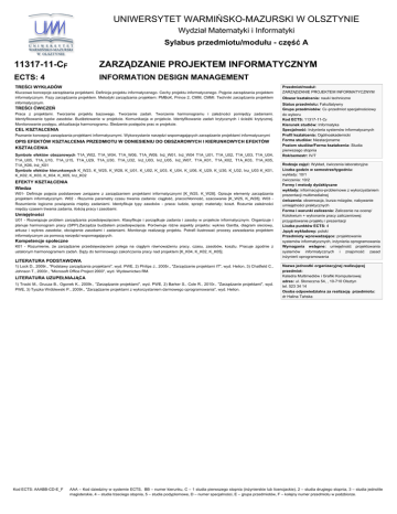 UNIWERSYTET WARMIŃSKO-MAZURSKI W OLSZTYNIE Wydział Matematyki i Informatyki Sylabus przedmiotu/modułu - część A 11317-11-CF ZARZĄDZANIE PROJEKTEM INFORMATYCZNYM ECTS: 4 INFORMATION DESIGN MANAGEMENT TREŚCI WYKŁADÓW Kluczowe koncepcje zarządzania projektami. Definicja projektu informatycznego. Cechy projektu informatycznego. Pojęcie zarządzania projektem informatycznym. Fazy zarządzania projektem. Metodyki zarządzania projektem: PMBoK, Prince 2, CMM, CMMI. Techniki zarządzania projektem informatycznym. TREŚCI ĆWICZEŃ Praca z projektami. Tworzenie projektu bazowego. Tworzenie zadań. Tworzenie harmonogramu i zależności pomiędzy zadaniami. Identyfikowanie typów zasobów. Budżetowanie w projekcie. Komunikacja w projekcie. Identyfikowanie zadań krytycznych i ścieżki krytycznej. Monitorowanie postępu, aktualizacja harmonogramu. Śledzenie postępów prac w projekcie. CEL KSZTAŁCENIA Poznanie koncepcji zarządzania projektami informatycznymi. Wykorzystanie narzędzi wspomagających zarządzanie projektami informatycznymi OPIS EFEKTÓW KSZTAŁCENIA PRZEDMIOTU W ODNIESIENIU DO OBSZAROWYCH I KIERUNKOWYCH EFEKTÓW KSZTAŁCENIA Symbole efektów obszarowych T1A_W02, T1A_W04, T1A_W06, T1A_W09, Inż_W01, Inż_W04 T1A_U01, T1A_U02, T1A_U03, T1A_U04, T1A_U05, T1A_U10, T1A_U15, T1A_U29, T1A_U30, T1A_U32, Inż_U03, Inż_U05, Inż_W07, T1A_K01, T1A_K02, T1A_K03, T1A_K05, T1A_K06, Inż_K01 Symbole efektów kierunkowych K_W23, K_W25, K_W28, K_U01, K_U02, K_U03, K_U04, K_U06, K_U29, K_U30, K_U32, Inz_U03 K_K01, K_K02, K_K03, K_K04, K_K05, Inz_K02 EFEKTY KSZTAŁCENIA Wiedza W01- Definiuje pojęcia podstawowe związane z zarządzaniem projektami informatycznymi [K_W25, K_W28]. Opisuje elementy zarządzania projektem informatycznym. W02 - Rozumie parametry czasu trwania zadania: ciągłość, pracochłonność, szacowanie [K_W25, K_W28]. W03 Rozumienie logiczne powiązania między zadaniami. Identyfikuje typy zasobów - praca: ludzie, sprzęt; materiały; koszt. Rozumie zależności między czasem trwania zadania, ilością pracy i zasobami. Umiejętności U01 - Rozwiązuje problem zarządzania przedsięwzięciem. Klasyfikuje i porządkuje zadania i zasoby w projekcie informatycznym. Organizuje i planuje harmonogram pracy (SPP).Zarządza budżetem przedsięwzięcia. Porównuje różne aspekty projektu: wykres Gantta, diagram sieciowy, arkusz i wykres zasobów, obciążenie zasobami i zadaniami. Monitoruje realizację projektu. Potrafi ilustrować procesy zarzadzania projektem informatycznym za pomocą narzędzi wspomagających. Kompetencje społeczne K01 - Rozumienie, że zarządzanie przedsięwzięciem polega na ciągłym równoważeniu pracy, czasu, zasobów, kosztu. Pracuje zgodnie z ustalonym harmonogramem zadań. Dąży do terminowego zakończenia pracy nad projektem [K_K04, K_K02, K_K05]. Przedmiot/moduł: ZARZĄDZANIE PROJEKTEM INFORMATYCZNYM Obszar kształcenia: nauki techniczne Status przedmiotu: Fakultatywny Grupa przedmiotów: CF-przedmiot specjalnościowy do wyboru Kod ECTS: 11317-11-CF Kierunek studiów: Informatyka Specjalność: Inżynieria systemów informatycznych Profil kształcenia: Ogólnoakademicki Forma studiów: Niestacjonarne Poziom studiów/Forma kształcenia: Studia pierwszego stopnia Rok/semestr: IV/7 Rodzaje zajęć: Wykład, ćwiczenia laboratoryjne Liczba godzin w semestrze/tygodniu: wykłady: 10/1 ćwiczenia: 10/2 Formy i metody dydaktyczne wykłady: informacyjno-problemowe z wykorzystaniem prezentacji multimedialnej ćwiczenia: obserwacja, burza mózgów, nabywanie umiejętności praktycznych Forma i warunki zaliczenia: Zaliczenie na ocenę/ Kolokwium + wykonanie pracy zaliczeniowej: przygotowanie projektu i prezentacji Liczba punktów ECTS: 4 Język wykładowy: polski Przedmioty wprowadzające: projektowanie systemów informatycznych, inżynieria oprogramowania Wymagania wstępne: umiejętność projektowania systemów informatycznych i znajomość zasad inżynierii oprogramowania LITERATURA PODSTAWOWA 1) Lock D., 2009r., "Podstawy zarządzania projektami", wyd. PWE, 2) Philips J., 2005r., "Zarządzanie projektami IT", wyd. Helion, 3) Chatfield C., Johnson T., 2003r., "Microsoft Office Project 2003", wyd. Wydawnictwo RM. LITERATURA UZUPEŁNIAJĄCA 1) Trocki M., Grucza B., Ogonek K., 2009r., "Zarządzanie projektami", wyd. PWE, 2) Barker S., Cole R., 2010r., "Zarządzanie projektami", wyd. PWE, 3) Tyszka Wróblewski P., 2009r., "Zarządzanie projektami z wykorzystaniem darmowego oprogramowania", wyd. Helion. Kod ECTS: AAABB-CD-E_F Nazwa jednostki organizacyjnej realizującej przedmiot: Katedra Multimediów i Grafiki Komputerowej adres: ul. Słoneczna 54, , 10-710 Olsztyn tel. 523 34 14 Osoba odpowiedzialna za realizację przedmiotu: dr Halina Tańska AAA – Kod dziedziny w systemie ECTS, BB – numer kierunku, C – 1 studia pierwszego stopnia (inżynierskie lub licencjackie), 2 – studia drugiego stopnia, 3 – studia jednolite magisterskie, 4 – studia trzeciego stopnia, 5 – studia podyplomowe, D – numer specjalności, E – grupa przedmiotów, F – kolejny numer przedmiotu w podzbiorze. Szczegółowy opis przyznanej punktacji ECTS - część B ZARZĄDZANIE PROJEKTEM INFORMATYCZNYM ECTS: 4 INFORMATION DESIGN MANAGEMENT Na przyznaną liczbę punktów ECTS składają się : 1. Godziny kontaktowe z nauczycielem akademickim: - udział w wykładach 10,0 godz. - udział w ćwiczeniach laboratoryjnych 20,0 godz. - konsultacje 12,0 godz. - omówienie projektu 5,0 godz. 47,0 godz. 2. Samodzielna praca studenta: - przygotowanie do ćwiczeń laboratoryjnych 15,0 godz. - opracowanie sprawozdań z ćwiczeń laboratoryjnych 15,0 godz. - przygotowanie do kolokwiów 5,0 godz. - przygotowanie do zaliczenia 15,0 godz. 50,0 godz. godziny kontaktowe + samodzielna praca studenta OGÓŁEM: 97,0 godz. 1 punkt ECTS = 25,00 godz. pracy przeciętnego studenta, liczba punktów ECTS = 97,00 godz.: 25,00 godz./ECTS = 3,88 ECTS w zaokrągleniu: 4 ECTS - w tym liczba punkt