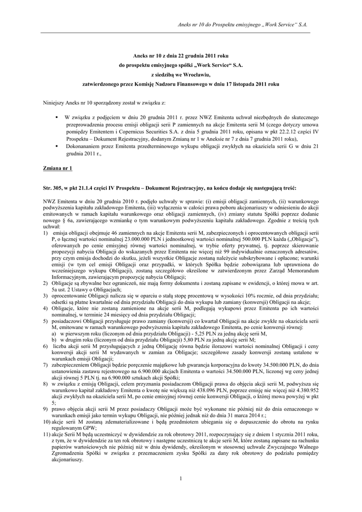 A Aneks nr 10 do Prospektu emisyjnego „Work Service“ S.A. Aneks nr 10 z dnia 22 grudnia 2011 roku do prospektu emisyjnego spółki „Work Service“ S.A. z siedzibą we Wrocławiu, zatwierdzonego przez Komisję Nadzoru Finansowego w dniu 17 listopada 2011 roku Niniejszy Aneks nr 10 sporządzony został w związku z: W związku z podjęciem w dniu 20 grudnia 2011 r. przez NWZ Emitenta uchwał niezbędnych do skutecznego przeprowadzenia procesu emisji obligacji serii P zamiennych na akcje Emitenta serii M (czego dotyczy umowa pomiędzy Emitentem i Copernicus Securities S.A. z dnia 5 grudnia 2011 roku, opisana w pkt 22.2.12 części IV Prospektu – Dokument Rejestracyjny, dodanym Zmianą nr 1 w Aneksie nr 7 z dnia 7 grudnia 2011 roku), Dokonananiem przez Emitenta przedterminowego wykupu obligacji zwykłych na okaziciela serii G w dniu 21 grudnia 2011 r., Zmiana nr 1 Str. 305, w pkt 21.1.4 części IV Prospektu – Dokument Rejestracyjny, na końcu dodaje się następującą treść: NWZ Emitenta w dniu 20 grudnia 2010 r. podjęło uchwały w sprawie: (i) emisji obligacji zamiennych, (ii) warunkowego podwyższenia kapitału zakładowego Emitenta, (iii) wyłączenia w całości prawa poboru akcjonariuszy w odniesieniu do akcji emitowanych w ramach kapitału warunkowego oraz obligacji zamiennych, (iv) zmiany statutu Spółki poprzez dodanie nowego § 6a, zawierającego wzmiankę o tym warunkowym podwyższeniu kapitału zakładowego. Zgodnie z treścią tych uchwał: 1) emisja obligacji obejmuje 46 zamiennych na akcje Emitenta serii M, zabezpieczonych i oprocentowanych obligacji serii P, o łącznej wartości nominalnej 23.000.000 PLN i jednostkowej wartości nominalnej 500.000 PLN każda („Obligacje”), oferowanych po cenie emisyjnej równej wartości nominalnej, w trybie oferty prywatnej, tj. poprzez skierowanie propozycji nabycia Obligacji do wskazanych przez Emitenta nie więcej niż 99 indywidualnie oznaczonych adresatów, przy czym emisja dochodzi do skutku, jeżeli wszystkie Obligacje zostaną należycie subskrybowane i opłacone; warunki emisji (w tym cel emisji Obligacji oraz przypadki, w których Spółka będzie zobowiązana lub uprawniona do wcześniejszego wykupu Obligacji), zostaną szczegółowo określone w zatwierdzonym przez Zarząd Memorandum Informacyjnym, zawierającym propozycję nabycia Obligacji; 2) Obligacje są zbywalne bez ograniczeń, nie mają formy dokumentu i zostaną zapisane w ewidencji, o której mowa w art. 5a ust. 2 Ustawy o Obligacjach; 3) oprocentowanie Obligacji nalicza się w oparciu o stałą stopę procentową w wysokości 10% rocznie, od dnia przydziału; odsetki są płatne kwartalnie od dnia przydziału Obligacji do dnia wykupu lub zamiany (konwersji) Obligacji na akcje; 4) Obligacje, które nie zostaną zamienione na akcje serii M, podlegają wykupowi przez Emitenta po ich wartości nominalnej, w terminie 24 miesięcy od dnia przydziału Obligacji; 5) posiadaczowi Obligacji przysługuje prawo zamiany (konwersji) co kwartał Obligacji na akcje zwykłe na okaziciela serii M, emitowane w ramach warunkowego podwyższenia kapitału zakładowego Emitenta, po cenie konwersji równej: a) w pierwszym roku (liczonym od dnia przydziału Obligacji) - 5,25 PLN za jedną akcję serii M, b) w drugim roku (liczonym od dnia przydziału Obligacji) 5,80 PLN za jedną akcję serii M; 6) liczba akcji serii M przysługujących z jedną Obligację równa będzie ilorazowi wartości nominalnej Obligacji i ceny konwersji akcji serii M wydawanych w zamian za Obligacje; szczegółowe zasady konwersji zostaną ustalone w warunkach emisji Obligacji; 7) zabezpieczeniem Obligacji będzie poręczenie majątkowe lub gwarancja korporacyjna do kwoty 34.500.000 PLN, do dnia ustanowienia zastawu rejestrowego na 6.900.000 akcjach Emitenta o wartości 34.500.000 PLN, liczonej wg ceny jednej akcji równej 5 PLN tj. na 6.900.000 sztukach akcji Spółki; 8) w związku z emisją Obligacji, celem przyznania posiadaczom Obligacji prawa do objęcia akcji serii M, podwyższa się warunkowo kapitał zakładowy Emitenta o kwotę nie większą niż 438.096 PLN, poprzez emisję nie więcej niż 4.380.952 akcji zwykłych na okaziciela serii M, po cenie emisyjnej równej cenie konwersji Obligacji, o której mowa powyżej w pkt 5; 9) prawo objęcia akcji serii M przez posiadaczy Obligacji może być wykonane nie później niż do dnia oznaczonego w warunkach emisji jako termin wykupu Obligacji, nie później jednak niż do dnia 31 marca 2014 r.; 10) akcje serii M zostaną zdematerializowane i będą przedmiotem ubiegania się o dopuszczenie do obrotu na rynku regulowanym GPW; 11) akcje Serii M będą uczestniczyć w dywidendzie za rok obrotowy 2011, rozpoczynający się z dniem 1 stycznia 2011 roku, z tym, że w dywidendzie za ten rok obrotowy i następne uczestniczą te akcje serii M, które zostaną zapisane na rachunku papierów wartościowych nie później niż w dniu dywidendy, określonym w stosownej uchwale Zwyczajnego Walnego Zgromadzenia Spółki w związku z przeznaczeniem zysku Spółki za dany rok obrotowy do podziału pomiędzy akcjonariuszy. 1 A Aneks nr 10 do Prospektu emisyjnego „Work Service“ S.A. Zmiana nr 2 Str. 338, w pkt 22.2 części IV Prospektu – Dokument Rejestracyjny, w punkcie 22.2.12 (dodanym Zmianą nr 1 w Aneksie nr 7 z dnia 7 grudnia 2011 roku) na końcu dodaje się następującą treść: W zakresie objętym przedmiotem powyższej umowy, NWZ Emitenta w dniu 20 grudnia 2010 r. podjęło stosowne uchwały w sprawie: (i) emisji obligacji zamiennych, (ii) warunkowego podwyższenia kapitału zakładowego Emitenta, (iii) wyłączenia w całości prawa poboru akcjonariuszy w odniesieniu do akcji emitowanych w ramach kapitału warunkowego oraz obligacji zamiennych, (iv) zmiany statutu Spółki poprzez dodanie nowego § 6a, zawierającego wzmiankę o tym warunkowym podwyższeniu kapitału zakładowego. Zgodnie z treścią tych uchwał: 1) emisja obejmuje 46 zamienn