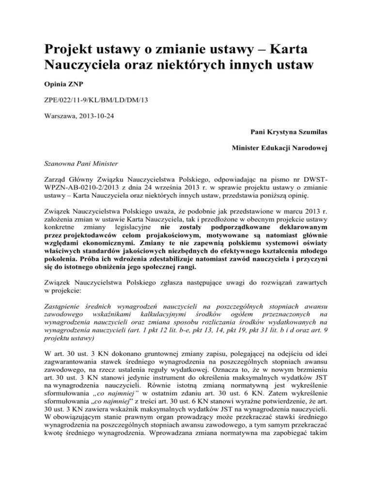 Projekt ustawy o zmianie ustawy – Karta Nauczyciela oraz niektórych innych ustaw Opinia ZNP ZPE/022/11-9/KL/BM/LD/DM/13 Warszawa, 2013-10-24 Pani Krystyna Szumilas Minister Edukacji Narodowej Szanowna Pani Minister Zarząd Główny Związku Nauczycielstwa Polskiego, odpowiadając na pismo nr DWSTWPZN-AB-0210-2/2013 z dnia 24 września 2013 r. w sprawie projektu ustawy o zmianie ustawy – Karta Nauczyciela oraz niektórych innych ustaw, przedstawia poniższą opinię. Związek Nauczycielstwa Polskiego uważa, że podobnie jak przedstawione w marcu 2013 r. założenia zmian w ustawie Karta Nauczyciela, tak i przedłożone w obecnym projekcie ustawy konkretne zmiany legislacyjne nie zostały podporządkowane deklarowanym przez projektodawców celom projakościowym, motywowane są natomiast głównie względami ekonomicznymi. Zmiany te nie zapewnią polskiemu systemowi oświaty właściwych standardów jakościowych niezbędnych do efektywnego kształcenia młodego pokolenia. Próba ich wdrożenia zdestabilizuje natomiast zawód nauczyciela i przyczyni się do istotnego obniżenia jego społecznej rangi. Związek Nauczycielstwa Polskiego zgłasza następujące uwagi do rozwiązań zawartych w projekcie: Zastąpienie średnich wynagrodzeń nauczycieli na poszczególnych stopniach awansu zawodowego wskaźnikami kalkulacyjnymi środków ogółem przeznaczonych na wynagrodzenia nauczycieli oraz zmiana sposobu rozliczania środków wydatkowanych na wynagrodzenia nauczycieli (art. 1 pkt 12 lit. b-e, pkt 13, 14, pkt 19, pkt 31 lit. b i d oraz art. 9 projektu ustawy) W art. 30 ust. 3 KN dokonano gruntownej zmiany zapisu, polegającej na odejściu od idei zagwarantowania stawek średniego wynagrodzenia na poszczególnych stopniach awansu zawodowego, na rzecz ustalenia reguły wydatkowej. Oznacza to, że w nowym brzmieniu art. 30 ust. 3 KN stanowi jedynie instrument do określenia maksymalnych wydatków JST na wynagrodzenia nauczycieli. Równie istotną zmianą normatywną jest wykreślenie sformułowania „co najmniej” w ostatnim zdaniu art. 30 ust. 6 KN. Zatem wykreślenie sformułowania „co najmniej” z treści art. 30 ust. 6 KN stanowi wyraźne potwierdzenie, że art. 30 ust. 3 KN zawiera wskaźnik maksymalnych wydatków JST na wynagrodzenia nauczycieli. W obowiązującym stanie prawnym organ prowadzący może przekraczać stawki średniego wynagrodzenia na poszczególnych stopniach awansu zawodowego, a tym samym przekraczać kwotę średniego wynagrodzenia. Wprowadzana zmiana normatywna ma zapobiegać takim wydatkom. Zmiana ta koresponduje z nowelizacją art. 30 ust. 3 KN i zastąpieniem gwarancji średnich wynagrodzeń regułą wydatkową. Ponadto wprowadzana nowelizacja umożliwia nieosiąganie stawek średniego wynagrodzenia na danym stopniu awansu zawodowego bez konieczności wypłaty dodatku uzupełniającego. W art. 30 ust. 6 KN w zdaniu pierwszym wykreślono bowiem dyspozycję dla organu prowadzącego, aby regulamin wynagradzania określał warunki i wysokość składników wynagrodzenia dla poszczególnych stopni awansu zawodowego. Podobnej zmiany dokonano w treści art. 30 ust. 7 KN w odniesieniu do delegacji ministra do wydania rozporządzenia. Stanowi to kolejny argument na rzecz tezy o normatywnym odejściu od idei średnich wynagrodzeń gwarantowanych na poszczególnych stopniach awansu zawodowego. W opinii ZNP, badanie osiągania średnich stawek wynagrodzenia zasadniczego powinno dotyczyć wszystkich stopni awansu zawodowego. Informacja, czy stawki średniego wynagrodzenia są osiągane, powinna być znana i corocznie monitorowana. Związek Nauczycielstwa Polskiego jest za zachowaniem treści art. 30 ust. 3, ust. 6 i ust. 7 KN w dotychczasowym brzmieniu. Zdaniem Związku, nie ma uzasadnienia dla wprowadzenia tak daleko idącej zmiany w systemie wynagradzania nauczycieli. W art. 30a KN dokonano fundamentalnej zmiany zasad dotyczących sposobu dokonywania analizy osiągania średnich wynagrodzeń nauczycieli, a tym samym ustalania prawa do dodatku uzupełniającego. Na podstawie projektu nowelizacji dodatek uzupełniający byłby wypłacany dopiero w sytuacji nieosiągnięcia średniej wartości wynagrodzeń łącznie na wszystkich stopniach awansu zawodowego. Odnośnie tej zmiany, ZNP – kierując się przesłanką odpowiedzialności i dobra wspólnego – nie wnosi uwag, pod warunkiem zmiany dotychczasowego sposobu dokonywania analizy średnich wynagrodzeń poprzez niewliczanie godzin ponadwymiarowych do średnich, a także wprowadzenia obowiązku ustalania analizy średnich wynagrodzeń w szkołach rządowych, jak również uregulowania obowiązku corocznej kontroli przez regionalne izby obrachunkowe sprawozdania dotyczącego analizy średnich wynagrodzeń. W przypadku godzin ponadwymiarowych, zgodnie z treścią § 3 ust. 5 zdanie drugie rozporządzenia Ministra Edukacji Narodowej z dnia 13 stycznia 2010 r.w sprawie sposobu opracowywania sprawozdania z wysokości średnich wynagrodzeń nauczycieli na poszczególnych stopniach awansu zawodowego w szkołach prowadzonych przez jednostki samorządu terytorialnego (Dz.U. Nr 6 poz. 35 ze zm.), przydzielone nauczycielowi godziny ponad tygodniowy obowiązkowy wymiar godzin zajęć, o którym mowa w art. 42 ust. 2 pkt 1 KN, stanowią godziny ponadwymiarowe, które nie są przeliczane na etaty. Powyższa norma umożliwia nieprzeliczanie liczby godzin ponadwymiarowych na pełne etaty. W związku z tym, że wynagrodzenie z tytułu godzin ponadwymiarowych jest niższe, istnieje tendencja do zawyżania wielkości tychże godzin w organizacji pracy szkoły. Jest to praktyka niezgodna z treścią art. 35 ust. 1 KN, na podstawie którego godziny ponadwymiarowe mogą być wyodrębniane spośród innych godzin dydaktycznych jedynie „(…) w szczególnych wypadkach, podyktowanych wyłącznie koniecznością realizacji programu nauczania (…)”. Na skutekprzyjętych regulacji w wyżej wymienionym rozporządzeniuwynagrodzenie z tytułu 
