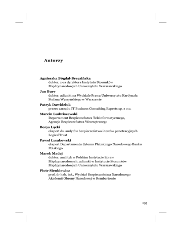 Autorzy Agnieszka Bógda³-Brzeziñska doktor, z-ca dyrektora Instytutu Stosunków Miêdzynarodowych Uniwersytetu Warszawskiego Jan Bury doktor, adiunkt na Wydziale Prawa Uniwersytetu Kardyna³a Stefana Wyszyñskiego w Warszawie Patryk Dawidziuk prezes zarz¹du IT Business Consulting Experts sp. z o.o. Marcin Ludwiszewski Departament Bezpieczeñstwa Teleinformatycznego, Agencja Bezpieczeñstwa Wewnêtrznego Borys £¹cki ekspert ds. audytów bezpieczeñstwa i testów penetracyjnych LogicalTrust Pawe³ £ysakowski ekspert Departamentu Sytemu P³atniczego Narodowego Banku Polskiego Marek Madej doktor, analityk w Polskim Instytucie Spraw Miêdzynarodowych, adiunkt w Instytucie Stosunków Miêdzynarodowych Uniwersytetu Warszawskiego Piotr Sienkiewicz prof. dr hab. in¿., Wydzia³ Bezpieczeñstwa Narodowego Akademii Obrony Narodowej w Rembertowie 255 Autorzy Krzysztof Silicki dyrektor ds. technicznych NASK, pe³nomocnik ds. CERT Polska, przedstawiciel Polski w Radzie Zarz¹dzaj¹cej Europejskiej Agencji Bezpieczeñstwa Sieci i Informacji (ENISA) Marek Piotr Stolarski szef zespo³u audytorskiego LogicalTrust, ekspert ds. bezpieczeñstwa informacji. Halina Œwieboda Wydzia³ Bezpieczeñstwa Narodowego Akademii Obrony Narodowej w Rembertowie Rafa³ Tarnogórski analityk w Polskim Instytucie Spraw Miêdzynarodowych Marcin Terlikowski analityk w Polskim Instytucie Spraw Miêdzynarodowych 256