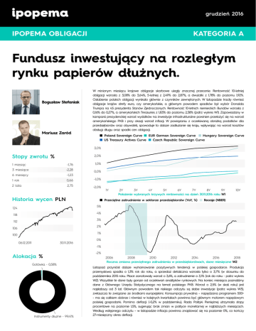 grudzień 2016 IPOPEMA OBLIGACJI KATEGORIA A Fundusz inwestujący na rozległym rynku papierów dłużnych. Bogusław Stefaniak Mariusz Zaród W minionym miesiącu krajowe obligacje skarbowe uległy znacznej przecenie. Rentowność 10-letniej obligacji wzrosła z 3,08% do 3,64%, 5-letniej z 2,49% do 2,87%, a dwulatki z 1,78% do poziomu 1,92%. Osłabienie polskich obligacji wynikało głównie z czynników zewnętrznych. W listopadzie traciły również obligacje krajów strefy euro, czy amerykańskie, a głównym powodem spadków był wybór Donalda Trumpa na 45 prezydenta Stanów Zjednoczonych. Rentowność 10-letnich niemieckich Bundów wzrosła z 0,16% do 0,27%, a amerykańskich Treasuries z 1,83% do poziomu 2,38% (patrz wykres W1). Zapowiadany w kampanii prezydenckiej wzrost wydatków na inwestycje infrastrukturalne powinien przełożyć się na wzrost amerykańskiego PKB i przy okazji wzrost inflacji. W powiązaniu z oczekiwaną obniżką podatków dla przedsiębiorstw oraz obywateli, spowoduje to dalsze zadłużanie się kraju, wpływając na wzrost kosztów obsługi długu oraz spadki cen obligacji. Poland Sovereign Curve EUR German Sovereign Curve Hungary Sovereign Curve US Treasury Actives Curve Czech Republic Sovereign Curve 3,0% Stopy zwrotu % 2,0% 1,0% 1 miesiąc -1,76 3 miesiące -2,28 6 miesięcy -1,23 1 rok 0,66 -1,0% 2 lata 2,75 -2,0% 0,0% Historia wycen PLN 1Y 2Y 3Y 4Y 5Y 6Y 7Y 8Y 9Y Położenie wybranych krzywych rentowności na dzień 30.11.2016 roku W1 Przeciętne zatrudnienie w sektorze przedsiębiorstw (YoY, %) 10Y Recesje (NBER) 5% 124 421 118 811 112 211 106 601 100 001 06.12.2011 30.11.2016 Alokacja % obligacji Gotówka - 0,58% Instrumenty dłużne - 99,41% 4% 3% 2% 1% 0% -1% -2% 2006 2008 2010 2012 2014 2016 2018 Roczna zmiana przeciętnego zatrudnienia w przedsiębiorstwach, dane miesięczne W2 Listopad przyniósł dalsze wyhamowanie pozytywnych tendencji w polskiej gospodarce. Produkcja przemysłowa spadła o 1,3% rok do roku, a sprzedaż detaliczna wzrosła tylko o 3,7% (w stosunku do października 2015 roku. Płace zanotowały wzrost o 3,6%, a zatrudnienie o 3,1% (rok do roku - patrz wykres W2). Wszystkie te dane były gorsze od oczekiwań analityków rynkowych. Na koniec miesiąca poznaliśmy dane z Głównego Urzędu Statystycznego na temat polskiego PKB. Wzrost o 2,5% (w skali roku) jest najsłabszy od 3 lat. Głównym powodem tak niskiego odczytu są słabe inwestycje (patrz wykres W3), zwłaszcza te związane ze środkami europejskimi. Konsumpcja prywatna – napędzana programem 500+ - ma się całkiem dobrze i również w kolejnych kwartałach powinna być głównym motorem napędowym polskiej gospodarki. Pomimo deflacji (-0,2% w październiku), Rada Polityki Pieniężnej utrzymała stopy procentowe na poziomie 1,5%, sugerując brak zmian w polityce monetarnej w najbliższych miesiącach. Według wstępnego odczytu – w listopadzie inflacja powinna znajdować się na poziomie 0%, co kończy 27-miesięczny okres deflacji. grudzień 2016 IPOPEMA OBLIGACJI Waluty % KATEGORIA A Po tak dużych wyprzedażach, które miały miejsce w 3 ostatnich miesiącach spodziewamy się znacznego umocnienia na krajowym rynku obligacji. Rentowności polskich obligacji skarbowych są na poziomach niewidzianych od 2014 roku, a stromość krzywej (różnica pomiędzy rentownościami obligacji 10 i 2-letnich) nigdy nie była tak duża. Finanse budżetu państwa nie powinny stanowić problemu, ani w 2016 roku, ani w przyszłych latach. Wyższe dochody podatkowe w obecnym roku pozwoliły na przesunięcie części wydatków przyszłorocznych do tegorocznego budżetu. Ten zabieg księgowy sprawił, że ani w 2016, ani w 2017 roku nie zostanie przekroczony poziom 3% deficytu w stosunku do PKB. Nie spodziewamy się również dalszych obniżek ratingów, co powinno pozwolić polskim obligacjom umocnić się znacznie i zarazem zmniejszyć spread do Bunda (patrz wykres W4). A wysokie zaspokojenie potrzeb pożyczkowych w 2016 roku tylko ten scenariusz potwierdza. EUR - 6,32% USD - 34,22% Wydatki rządowe Eksport netto Konsumpcja prywatna Inwestycje prywatne brutto 6 5 0,9 1,1 4 PLN - 59,46% 0,0 3 1,5 1,3 1,8 1,0 0,3 2 0,2 1,4 Struktura części dłużnej % 1 Obligacje Korporacyjne 22,91 0 1,2 Zagraniczne Obligacje Skarbowe 24,81 -1 -0,3 Polskie Obligacje Skarbowe 51,69 Gotówka i depozyty 0,59 2,8 2,3 1,6 0,5 0,1 -1,0 -0,2 -2 -1,7 0,0 2,1 1,2 2,3 1,9 3,1 2,6 0,5 -1,4 0,6 -2,2 0,2 1,6 0,7 0,4 1,0 0,5 1,9 1,9 0,9 0,9 1,5 1,3 -0,1 -1,2 -2,1 0,8 2,0 1,9 2,3 1,0 -0,7 -0,3 -0,5 -2,2 -0,1 -3 0,7 2,0 -0,4 -1,4 -2,2 0,8 0,2 1,7 0,3 0,1 0,1 1,5 0,5 0,2 3,0 1,5 0,6 0,3 -0,3 -0,4 2012 2013 2014 2015 2016 Skala wpływu (kontrybucje) poszczególnych kategorii na wzrost realny PKB (w pkt. proc.) W3 POL 10Y obligacja skarbowa GER 10Y obligacja skarbowa Spread 4 3 2 1 0 -1 3 2 1 styczeń 2015 grudzień 2016 Różnica rentowności polskich obligacji 10-letnich do 10-letnich obligacji niemieckich W4 Niniejszy dokument służy wyłącznie celom informacyjnym, nie stanowi rekomendacji czy doradztwa inwestycyjnego i nie może stanowić podstawy do podjęcia decyzji inwestycyjnej. Wszelkie informacje dotyczące planów, oczekiwań, strategii, czy polityki inwestycyjnej co do przyszłości, stanowią odzwierciedlenie wiedzy i oczekiwań zarządzającego na moment sporządzenia niniejszego dokumentu, w związku z czym mogą one ulec wielokrotnej zmianie w zależności od rozwoju sytuacji na rynkach finansowych. W skrajnym przypadku może to oznaczać, że oczekiwania te mogą ulec zmianie, także zanim niniejszy dokument dotrze do jego adresata. IPOPEMA Towarzystwo Funduszy Inwestycyjnych S.A., ul. Próżna 9, 00-107 Warszawa, Sąd Rejonowy dla m. st. Warszawy, XII Wydział Gospodarczy nr KRS 0000278264, NIP 108-000-30-69, kapitał zakładowy 10.599.441 zł w całości opłacony. IPOPEMA TFI posiada zezwolenie na prowadzenie działalności udzielone przez Komisję Nadzoru Finansowego. Organem nadzoru dla IPOP