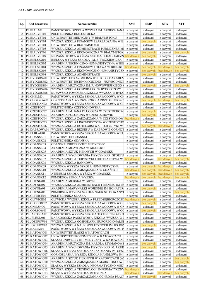 KA1 - SW, konkurs 2014 r. Lp. Kod Erasmusa Nazwa uczelni SMS
