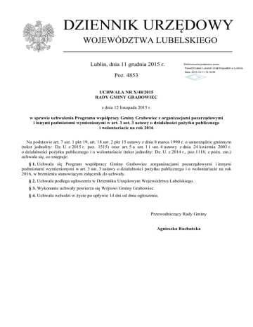 DZIENNIK URZĘDOWY WOJEWÓDZTWA LUBELSKIEGO Lublin, dnia 11 grudnia 2015 r. Elektronicznie podpisany przez: Paweł Chruściel; Lubelski Urząd Wojewódzki w Lublinie Data: 2015-12-11 15:18:59 Poz. 4853 UCHWAŁA NR X/48/2015 RADY GMINY GRABOWIEC z dnia 12 listopada 2015 r. w sprawie uchwalenia Programu współpracy Gminy Grabowiec z organizacjami pozarządowymi i innymi podmiotami wymienionymi w art. 3 ust. 3 ustawy o działalności pożytku publicznego i wolontariacie na rok 2016 Na podstawie art. 7 ust. 1 pkt 19, art. 18 ust. 2 pkt 15 ustawy z dnia 8 marca 1990 r. o samorządzie gminnym (tekst jednolity: Dz. U. z 2015 r. poz. 1515) oraz art. 5 a ust. 1 i ust. 4 ustawy z dnia 24 kwietnia 2003 r. o działalności pożytku publicznego i o wolontariacie (tekst jednolity: Dz. U. z 2014 r., poz.1118, z późn. zm.) uchwala się, co nstępuje: § 1. Uchwala się Program współpracy Gminy Grabowiec zorganizacjami pozarządowymi i innymi podmiotami wymienionymi w art. 3 ust. 3 ustawy o działalności pożytku publicznego i o wolontariacie na rok 2016, w brzmieniu stanowiącym załącznik do uchwały. § 2. Uchwała podlega ogłoszeniu w Dzienniku Urzędowym Województwa Lubelskiego. § 3. Wykonanie uchwały powierza się Wójtowi Gminy Grabowiec. § 4. Uchwała wchodzi w życie po upływie 14 dni od dnia ogłoszenia. Przewodniczący Rady Gminy Agnieszka Rachańska Dziennik Urzędowy Województwa Lubelskiego –2– Poz. 4853 _______________________________________________________________________________________________________________ Załącznik do Uchwały Nr X/48/2015 Rady Gminy Grabowiec z dnia 12 listopada 2015r. Program współpracy Gminy Grabowiec z organizacjami pozarządowymi oraz podmiotami wymienionymi w art. 3 ust. 3 ustawy o działalności pożytku publicznego i wolontariacie na rok 2016 Dziennik Urzędowy Województwa Lubelskiego –3– Poz. 4853 _______________________________________________________________________________________________________________ 1. Wprowadzenie 1) Organizacje pozarządowe są sektorem działającym na rzecz dobra publicznego. Stanowią one bazę dla rozwoju lokalnych społeczności i skupiają najaktywniejszych obywateli danego środowiska. Są istotnymi partnerami samorządu lokalnego w realizacji działań mających na celu zaspokojenie różnorodnych potrzeb mieszkańców. 2) Współpraca Gminy Grabowiec z organizacjami pozarządowymi oraz podmiotami, o których mowa w art. 3 ust. 3 ustawy z dnia 24 kwietnia 2003 r. o działalności pożytku publicznego i o wolontariacie (tekst jednolity Dz. U. z 2014 r., poz. 1118, z późn. zm.), służy umacnianiu uprawnień mieszkańców gminy w procesie tworzenia więzi społecznych, odpowiedzialności za swoje otoczenie oraz zaspokajaniu potrzeb różnych grup społeczności lokalnej. Jest wyrazem polityki władz gminy wobec organizacji pozarządowych i innych podmiotów prowadzących działalność pożytku publicznego, która zmierza do zapewnienia im jak najlepszych możliwości do działania, rozwoju i współpracy. 3) Ilekroć w programie jest mowa o: a) „ustawie” rozumie się przez to ustawę z 24 kwietnia 2003 r. o działalności pożytku publicznego i o wolontariacie (tekst jednolity Dz. U. z 2014 r., poz. 1118, z późn. zm.; b) „Programie” rozumie się przez to „Program współpracy Gminy Grabowiec z organizacjami pozarządowymi oraz podmiotami wymienionymi w art. 3 ust. 3 ustawy o działalności pożytku publicznego i o wolontariacie na rok 2016 ”; c) „zadaniu publicznym” rozumie się przez to zadanie określone w art. 4 ust.1 ustawy; d) „Gminie” rozumie się przez to Gminę Grabowiec; e) „Radzie Gminy” rozumie się przez to Radę Gminy Grabowiec; f) „Wójcie” rozumie się przez to Wójta Gminy Grabowiec; g) „organizacjach pozarządowych” rozumie się przez to organizacje pozarządowe i inne podmioty wymienione w art. 3 ust. 3 ustawy o działalności pożytku publicznego i o wolontariacie; 2. Cel główny i cele szczegółowe Programu 1) Celem głównym Programu jest zaspokojenie potrzeb mieszkańców Gminy, wzmocnienie rozwoju społeczeństwa obywatelskiego, budowanie partnerstwa oraz wspieranie organizacji pozarządowych w realizacji ważnych celów społecznych. 2) Celami szczegółowymi Programu są: a) Podniesienie jakości życia i zaspokojenie potrzeb mieszkańców Gminy poprzez zwiększenie aktywności organizacji, b) Stworzenie warunków do powstania inicjatyw i struktur funkcjonujących na rzecz społeczności lokalnej, c) Wykorzystanie potencjału organizacji pozarządowych i integracja organizacji realizujących zadania publiczne, d) Otwarcie na innowacyjność i konkurencyjność w wykonaniu zadań publicznych, e) Racjonalne wykorzystanie publicznych środków finansowych. 3. Zasady współpracy Współpraca Gminy Grabowiec z organizacjami odbywa się na zasadach: Dziennik Urzędowy Województwa Lubelskiego –4– Poz. 4853 _______________________________________________________________________________________________________________ Pomocniczości: Gmina powierza organizacjom realizację zadań własnych, a organizacje zapewniają ich wykonanie w sposób ekonomiczny i terminowy; Suwerenności stron: stosunki pomiędzy Gminą a organizacjami z poszanowaniem wzajemnej autonomii w swojej działalności statutowej; kształtowane będą Partnerstwa: dobrowolna współpraca równorzędnych sobie podmiotów w rozwiązywaniu wspólnie zdefiniowanych problemów i osiąganiu razem wytyczonych celów; Efektywności: wspólne dążenie do osiągnięcia możliwie największych efektów realizacji zadań publicznych; Uczciwej konkurencji: wymóg udzielenie tych samych informacji odnośnie wykonywanych działań przez podmioty publiczne i niepubliczne oraz obowiązek stosowania tych samych kryteriów przy dokonywaniu oceny tych działań oraz podejmowaniu decyzji dotyczących ich finansowania; Jawności: możliwości współpracy Gminy z organizacjami są powszechnie 