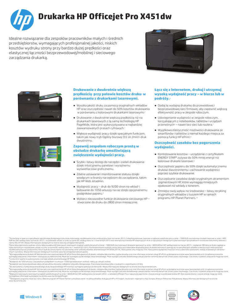 Drukarka HP Officejet Pro X451dw Idealne rozwiązanie dla zespołów pracowników małych i średnich przedsiębiorstw, wymagających profesjonalnej jakości, niskich kosztów wydruku strony przy bardzo dużej prędkości oraz elastycznej łączności bezprzewodowej/mobilnej i sieciowego zarządzania drukarką. Drukowanie z dwukrotnie większą prędkością przy połowie kosztów druku w porównaniu z drukarkami laserowymi. Łącz się z Internetem, drukuj i utrzymuj wysoką wydajność pracy – w biurze lub w podróży. ● Wysoka jakość druku za pomocą oryginalnych wkładów HP oraz oszczędność nawet do 50% kosztów drukowania w porównaniu z kolorowymi drukarkami laserowymi.2 ● Dodaj tę wydajną drukarkę do przewodowej i bezprzewodowej sieci firmowej, aby zapewnić większą efektywność pracy w zespole roboczym. ● Drukowanie z dwukrotnie większą prędkością niż na drukarkach laserowych z tą samą technologią HP PageWide, która jest wykorzystywana w najbardziej zaawansowanych prasach cyfrowych.1 ● Udostępnianie wydajności w zespole roboczym, korzystającym z notebooków, tabletów i urządzeń przenośnych6 – nawet bez sieci lub routera.7 1 2 ● Większa wydajność pracy dzięki specjalnym funkcjom, takim jak nowy tryb Ogólny biurowy (55 str./min) i druk dwustronny. Zapewnij zespołom roboczym prostą w obsłudze drukarkę umożliwiającą zwiększenie wydajności pracy. ● Szybki i łatwy dostęp do narzędzi i zadań drukowania dzięki intuicyjnemu panelowi i wyraźnemu wyświetlaczowi graficznemu. ● Zdalne ustawianie i monitorowanie statusu dzięki wiodącym w branży narzędziom do zarządzania, takim jak HP Web Jetadmin. ● Wydajność pracy – druk do 9200 stron na wkład4 i ładowanie do 1050 arkuszy na raz dzięki opcjonalnemu podajnikowi papieru.5 ● Wybierz niezawodne funkcje drukowania sieciowego HP – stworzone do druku do 2800 stron miesięcznie. 3 ● Wyjątkowa elastyczność możliwości drukowania ze smartfonów i tabletów z niemal każdego miejsca za pomocą funkcji HP ePrint.8 Oszczędność zasobów bez pogorszenia wydajności. ● Kontrolowanie kosztów – urządzenie z certyfikatem ENERGY STAR® zużywa do 50% mniej energii niż kolorowe drukarki laserowe.9 ● Oszczędność papieru do 50% dzięki automatycznemu drukowi dwustronnemu i zachowanie wydajności poprzez szybkie drukowanie. ● Oszczędzanie zasobów dzięki oryginalnym atramentom pigmentowym HP, które wymagają mniejszych opakowań niż wkłady z tonerem. ● Zmniejsz swój wpływ na środowisko – łatwy recykling oryginalnych wkładów z tuszem HP w ramach programu HP Planet Partners.10 1Porównanie w oparciu o specyfikacje najszybszego dostępnego trybu druku kolorowego opublikowane przez producentów (stan na marzec 2012 r.) obejmują kolorowe, laserowe urządzenia wielofunkcyjne w cenie < 1000 EUR oraz kolorowe drukarki laserowe w cenie < 800 EUR bez VAT według stanu na marzec 2012 r. na podstawie udziału w rynku w ocenie IDC według stanu na 1. kwartał (Q1) 2012 oraz wewnętrznych testów HP obejmujących druk w najszybszym dostępnym trybie kolorowym (przykładowe 4-stronicowe dokumenty testowe z normy ISO 24734). Więcej informacji jest dostępnych na stronie www.hp.com/go/printerspeeds. 2Dane dotyczące kosztu wydruku strony dotyczą większości kolorowych, laserowych urządzeń wielofunkcyjnych w cenie < 1000 EUR oraz kolorowych drukarek laserowych w cenie < 800 EUR bez VAT według stanu na marzec 2012 r.; wydajność ISO dotyczy druku ciągłego w trybie domyślnym na podstawie udziału w rynku w ocenie IDC według stanu na 1. kwartał (Q1) 2012. Porównania kosztu wydruku strony dotyczące materiałów eksploatacyjnych drukarek laserowych opierają się na specyfikacjach wkładów o identycznych właściwościach opublikowanych przez producentów. Koszt wydruku strony oparto na szacowanej cenie rynkowej wkładów atramentowych HP 970XL/971XL. Rzeczywiste ceny mogą być inne. Rzeczywista wydajność może być inna w zależności od drukarki, rodzaju drukowanych obrazów i innych czynników. Więcej informacji jest dostępnych na stronie www.hp.com/go/learnaboutsupplies. 3Wymaga podłączenia drukarki HP do Internetu oraz rejestracji konta HP ePrint (lista obsługiwanych drukarek, rodzajów dokumentów i typów obrazów oraz inne informacje na temat usługi HP ePrint są dostępne na stronie www.hpconnected.com). Urządzenia przenośne wymagają połączenia z Internetem i obsługi poczty elektronicznej. Może być wymagany punkt dostępu bezprzewodowego. Może wystąpić potrzeba dodatkowego zakupu planów transmisji danych lub zmiany planu taryfowego. Czas druku i szybkość połączenia mogą się różnić. 4Liczba stron oparta na wykorzystaniu czarnego wkładu atramentowego HP 970XL. 5Wydajność do 1050 arkuszy z opcjonalnym podajnikiem na arkusze 1x500 (sprzedawanym osobno); należy go zakupić osobno. 6Wydajność sieci bezprzewodowej zależy od warunków otoczenia i odległości od punktu dostępowego. Praca bezprzewodowa tylko z routerami o częstotliwości 2,4 GHz. 7Do skorzystania z funkcji bezprzewodowego druku bezpośredniego HP może być wymagana aplikacja lub sterownik. Więcej informacji jest dostępnych na stronie www.hpconnected.com. 8Wymaga podłączenia drukarki HP do Internetu oraz rejestracji konta HP ePrint (lista obsługiwanych drukarek, rodzajów dokumentów i typów obrazów oraz inne informacje na temat usługi HP ePrint są dostępne na stronie www.hpconnected.com). Urządzenia przenośne wymagają połączenia z Internetem i obsługi poczty elektronicznej. Może być wymagany punkt dostępu bezprzewodowego. Może wystąpić potrzeba dodatkowego zakupu planów transmisji danych lub zmiany planu taryfowego. Czas druku i szybkość połączenia mogą się różnić. 9Większość kolorowych, laserowych urządzeń wielofunkcyjnych w cenie < 800 EUR bez VAT według stanu na sierpień 2012 r. z wkładami Officejet Pro