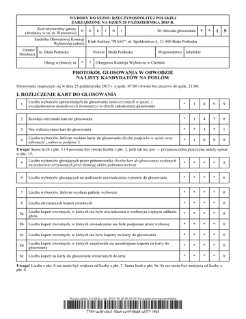 WYBORY DO SEJMU RZECZYPOSPOLITEJ POLSKIEJ ZARZĄDZONE NA DZIEŃ 25 PAŹDZIERNIKA 2015 R. Kod terytorialny gminy (dzielnicy w m. st. Warszawie) 0 6 6 1 0 1 Nr obwodu głosowania * * 1 9 Siedziba Obwodowej Komisji Klub Kultury "PIAST", ul. Spółdzielcza 4, 21-500 Biała Podlaska Wyborczej (adres) Gmina/ m. Biała Podlaska Dzielnica Powiat Biała Podlaska Okręg wyborczy nr * 7 Województwo lubelskie Okręgowa Komisja Wyborcza w Chełmie PROTOKÓŁ GŁOSOWANIA W OBWODZIE NA LISTY KANDYDATÓW NA POSŁÓW Głosowanie rozpoczęło się w dniu 25 października 2015 r. o godz. 07:00 i trwało bez przerwy do godz. 21:00. I. ROZLICZENIE KART DO GŁOSOWANIA 1 Liczba wyborców uprawnionych do głosowania (umieszczonych w spisie, z uwzględnieniem dodatkowych formularzy) w chwili zakończenia głosowania * 1 8 9 9 2 Komisja otrzymała kart do głosowania * 1 4 7 0 3 Nie wykorzystano kart do głosowania * * 3 7 1 4 Liczba wyborców, którym wydano karty do głosowania (liczba podpisów w spisie oraz adnotacje „odmowa podpisu”) * 1 0 9 9 Uwaga! Suma liczb z pkt. 3 i 4 powinna być równa liczbie z pkt. 2, jeśli tak nie jest — przypuszczalną przyczynę należy opisać w pkt. 15. 5 Liczba wyborców głosujących przez pełnomocnika (liczba kart do głosowania wydanych na podstawie otrzymanych przez komisję aktów pełnomocnictwa) * * * * 5 6 Liczba wyborców głosujących na podstawie zaświadczenia o prawie do głosowania * * * * 6 7 Liczba wyborców, którym wysłano pakiety wyborcze * * * * 0 8 Liczba otrzymanych kopert zwrotnych * * * * 0 8a Liczba kopert zwrotnych, w których nie było oświadczenia o osobistym i tajnym oddaniu głosu * * * * 0 8b Liczba kopert zwrotnych, w których oświadczenie nie było podpisane przez wyborcę * * * * 0 8c Liczba kopert zwrotnych, w których nie było koperty na karty do głosowania * * * * 0 8d Liczba kopert zwrotnych, w których znajdowała się niezaklejona koperta na karty do głosowania * * * * 0 8e Liczba kopert na karty do głosowania wrzuconych do urny * * * * 0 Uwaga! Liczba z pkt. 8 nie może być większa od liczby z pkt. 7. Suma liczb z pkt. 8a–8e nie może być mniejsza od liczby z pkt. 8. Wersja online 2.0 KLK z dn. 2015-10-26 00:55:58 Tworzenie nowego protokołu 7769-aef6-e0e5-30a4-ee44-0bd8-a557-14b5 -2- II. USTALENIE WYNIKÓW GŁOSOWANIA Komisja stwierdziła, że pieczęcie na urnie pozostały nienaruszone. Po wyjęciu kart z urny Komisja ustaliła na ich podstawie następujące wyniki głosowania: 9 Liczba kart wyjętych z urny * 1 0 9 8 9a w tym liczba kart wyjętych z kopert na karty do głosowania * * * * 0 Uwaga! Liczba z pkt. 9 pomniejszona o liczbę z pkt. 9a powinna być równa liczbie z pkt. 4. Dodatkowo liczba z pkt. 9a nie powinna być większa od liczby z pkt. 8e; jeśli tak nie jest — przypuszczalną przyczynę należy opisać w pkt. 16. 10 Liczba kart nieważnych (innych niż urzędowo ustalone lub nieopatrzonych pieczęcią obwodowej komisji wyborczej) * * * * 0 11 Liczba kart ważnych * 1 0 9 8 Uwaga! Suma liczb z pkt. 10 i 11 musi być równa liczbie z pkt. 9. Jeśli w pkt. 10 liczba jest większa niż 0, przyczynę należy opisać w pkt. 17. 12 Liczba głosów nieważnych (z kart ważnych) * * * 1 6 12a w tym z powodu postawienia znaku „X” obok nazwiska dwóch lub większej liczby kandydatów z różnych list * * * * 9 12b w tym z powodu niepostawienia znaku „X” obok nazwiska żadnego kandydata z którejkolwiek z list * * * * 7 12c w tym z powodu postawienia znaku „X” wyłącznie obok nazwiska kandydata z listy, której rejestracja została unieważniona (art. 227 § 3 Kodeksu) * * * * 0 * 1 0 8 2 Uwaga! Suma liczba z pkt. 12a do 12c musi być równa lub mniejsza od liczby z pkt. 12. 13 Liczba głosów ważnych oddanych łącznie na wszystkie listy kandydatów (z kart ważnych) Uwaga! Suma liczb z pkt. 12 i 13 musi być równa liczbie z pkt. 11. 14. Na poszczególne listy kandydatów na posłów i umieszczonych na nich kandydatów na posłów oddano następujące liczby głosów ważnych: Lista nr 1 - KW Prawo i Sprawiedliwość Liczba głosów ważnych oddanych na listę: * * 4 2 3 Na poszczególnych kandydatów z tej listy oddano następujące liczby głosów ważnych: 1. MAZUREK Beata * * * 2 1 2. ZAWIŚLAK Sławomir * * * * 6 3. SZEWCZAK Jan Włodzimierz * * * 9 4 4. DUSZEK Marcin Kamil * * * 5 5 5. HAŁAS Teresa * * * * 2 6. HOLACZUK Wiesław Roman * * * * 1 7. GMYZ Maria * * * * 0 Wersja online 2.0 KLK z dn. 2015-10-26 00:55:58 Tworzenie nowego protokołu 7769-aef6-e0e5-30a4-ee44-0bd8-a557-14b5 -38. OLSZÓWKA Piotr * * * * 0 9. BOROWIEC Agata * * * * 5 10. CICHOSZ Lucjan * * * * 2 11. ZIELIŃSKI Tomasz Andrzej * * * * 0 12. SZOPIŃSKI Lech Stanisław * * * * 0 13. SZWAJ Jerzy Ryszard * * * * 3 14. BANASZEK Jakub Michał * * * * 3 15. BARSZCZEWSKA Barbara Aldona * * * 2 0 16. MAZUREK Robert * * * * 0 17. CZARNECKA Halina * * * * 2 18. KWIATKOWSKI Jerzy * * * * 1 19. SUBOCZ-CHACHUŁA Anna Maria * * * * 0 20. SKUBIS-RAFALSKA Agnieszka * * * * 0 21. SZWED Zdzisław * * * * 2 22. KAWA Franciszek Wiesław * * * * 0 23. SUSZCZYŃSKA Małgorzata Sylwia * * * * 8 24. ABRAMOWICZ Adam Krzysztof * * 1 9 8 * * 4 2 3 Razem Uwaga! Suma głosów oddanych na wszystkich kandydatów z danej listy (rubryka „Razem”) równa się liczbie głosów ważnych oddanych na tę listę. Wyjątek od tej zasady może dotyczyć listy, na której znajduje się nazwisko kandydata skreślonego z listy. Lista nr 2 - KW Platforma Obywatelska RP Liczba głosów ważnych oddanych na listę: * * 2 1 3 Na poszczególnych kandydatów z tej listy oddano następujące liczby głosów ważnych: 1. RANIEWICZ Grzegorz Artur * * * 1 5 2. ŻMIJAN Stanisław * * * 3 3 3. GRAD Mariusz * * * * 2 4. FYK Marta Ewa * * * * 1 Wersja online 2.0 KLK z dn. 2015-10-26 00:55:58 Tworzenie nowego protokołu 7769-aef6-e0e5-30a4-ee44-0bd8-a557-14b5 -45. PĘDZIŃSKA Małgorzata * * * * 0 6. SOSNOWSKI Wojciech Grzegorz * * * 3 2 7. POZNAŃSKI Marek * * * * 2 8