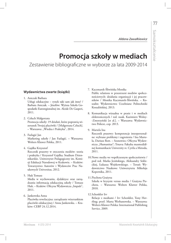 77 Promocja szkoły w mediach 6DPRNV]WDğFHQLH $OGRQD=DZDğNLHZLF] Zestawienie bibliograficzne w wyborze za lata 2009-2014 Wydawnictwa zwarte (książki) 1. Antczak Barbara Usługi edukacyjne – rynek taki sam jak inne? / Barbara Antczak. – Józefów: Wyższa Szkoła Gospodarki Euroregionalnej im. Alcide De Gasperi, 2011. 2. Celuch Małgorzata Promocja szkoły: 19 działań, które poprawią wizerunek Twojej placówki / [Małgorzata Celuch]. – Warszawa: „Wiedza i Praktyka”, 2014. 3. Fazlagić Jan Marketing szkoły / Jan Fazlagić. – Warszawa: Wolters Kluwer Polska, 2011. 4. Gajdka Krzysztof Rzecznik prasowy w otoczeniu mediów: teoria i praktyka / Krzysztof Gajdka; Studium Dziennikarskie. Uniwersytet Pedagogiczny im. Komisji Edukacji Narodowej w Krakowie. – Kraków: Towarzystwo Autorów i Wydawców Prac Naukowych Universitas, 2012. 7. Kaczmarek-Śliwińska Monika Public relations w przestrzeni mediów społecznościowych: działania organizacji i jej pracowników / Monika Kaczmarek-Śliwińska. – Koszalin: Wydawnictwo Uczelniane Politechniki Koszalińskiej, 2013. 8. Komunikacja wizualna w prasie i w mediach elektronicznych / red. nauk. Kazimierz Wolny-Zmorzyński [et al.]. – Warszawa: Wydawnictwo Poltext, cop. 2013. 9. Martela Ina Rzecznik prasowy: kompetencje interpersonalne: wybrane problemy i zagrożenia / Ina Martela, Dariusz Rott. – Sosnowiec: Oficyna Wydawnicza „Humanitas”; Trnava: Fakulta masmediálnej komunikacie Univerzity sv. Cyrila a Metoda, 2011. 10. Nowe media we współczesnym społeczeństwie / pod red. Marka Jezińskiego, Aleksandry Sekleckiej, Łukasza Wojtkowskiego. – Toruń: Wydawnictwo Naukowe Uniwersytetu Mikołaja Kopernika, 2011. 5. Huk Tomasz Media w wychowaniu, dydaktyce oraz zarządzaniu informacją edukacyjną szkoły / Tomasz Huk. – Kraków: Oficyna Wydawnicza „Impuls”, 2011. 11. Piechota Grażyna Szkoła w kryzysie versus media / Grażyna Piechota. – Warszawa: Wolters Kluwer Polska, 2010. 6. Jankowska Anna Placówka rewelacyjna: zarządzanie wizerunkiem placówki edukacyjnej / Anna Jankowska. – Kraków: CEBP 24.12.2014. 12. Schenkler Irv Relacje z mediami / Irv Schenkler, Tony Herrling; przeł. Marta Werbanowska. – Warszawa: Wolters Kluwer Polska: International Publishing Service, 2009. Meritum 4 (35) 2014 Mazowiecki Kwartalnik Edukacyjny 78 3URPRFMDV]NRğ\ZPHGLDFK=HVWDZLHQLHELEOLRJUDILF]QHZZ\ERU]H]DODWD 6DPRNV]WDğFHQLH Fragmenty prac autorskich i zbiorowych 1. Koc Remigiusz Promocja szkoły i jej współpraca ze środowiskiem lokalnym / Remigiusz Koc // W: Psychologia ucznia i nauczyciela. – Warszawa: Wydaw. Naukowe PWN, 2011. – s. 303-333 2. Kaczmarek-Śliwińska Monika Wizerunek szkoły w nowych mediach / Monika Kaczmarek-Śliwińska // W: Szkoła w perspektywie jej realnych przeobrażeń / red. Roman Uździcki, Vojtech Korim. – Toruń: Wydawnictwo Adam Marszałek; Leszno: Wyższa Szkoła Humanistyczna im. Króla Stanisława Leszczyńskiego, 2013. – s. 13-24 3. Przybysz Monika Rola rzecznika prasowego w budowaniu wzajemnego zrozumienia między instytucją a jej otoczeniem w sytuacji kryzysowej: wykorzystanie narzędzi public relations w zarządzaniu kryzysem medialnym / Monika Marta Przybysz // W: Komunikacja, (po)rozumienie, obecność społeczna. / red. nauk. Małgorzata Biedroń, Mirosława Wawrzak-Chodaczek. – Toruń: Adam Marszałek, 2012. – s. 252-273 Artykuły z czasopism 1. Elementy szkolnej strony internetowej / Marcin Kuczyński // Monitor Prawny Dyrektora: miesięcznik dyrektora szkoły. – 2012, nr 4, s. 8 2. Internetowa wizytówka szkoły / Maciej J. Klimowicz // Dyrektor Szkoły. – 2014, nr 5, s. 41-48 3. Jak cię widzą, czyli kreowanie wizerunku w sieci / Katarzyna Potasznik // Doradca Zawodowy. – 2013, nr 2, s. 12-13 4. Jak nas widzą... Kontakt z mediami / Dorota Oleksiak // Wychowanie w Przedszkolu: miesięcznik instrukcyjny dla wychowawczyń przedszkoli. – 2012, nr 4, dod. Poradnik Prawny Nauczyciela i Dyrektora Przedszkola, s. 13-14 5. Jak promować szkołę? / Marzena Tyl // Biblioteka w Szkole . – 2012, [nr] 1, s. 9-11 6. Media społecznościowe / Karolina Zioło-Pużuk // Dyrektor Szkoły. – 2014, nr 4, s. 50-53 Mazowiecki Kwartalnik Edukacyjny 7. Media społecznościowe a edukacja / Tatiana Kremień // Ruch Pedagogiczny. – 2013, nr 4, s. 173-178 8. Media w kreowaniu wizerunku instytucji systemu zarządzania kryzysowego / Franciszek Mroczek // Prace Naukowe Wałbrzyskiej Wyższej Szkoły Zarządzania i Przedsiębiorczości . – T. 20 (2012), s. [235]-246 9. Mistrzowskie prezentacje dyrektora szkoły / Marta Chrabąszcz // Dyrektor Szkoły. – 2014, nr 2, s. 28-30 10. Moja szkoła jest medialna: (działalność Fundacji Media Evolution) / Lidia Pokrzycka // Nowa Szkoła . – 2012, nr 3, s. 40-43 11. Nowoczesne technologie: wykorzystanie Internetu w komunikacji szkoły z otoczeniem / Szymon Kuszak // Doradca Dyrektora Szkoły. – 2012, nr 25, dod. Szkoła XXI wieku s. [47]-50 12. Patronat medialny / Anna Jankowska // Bliżej Przedszkola: wychowanie i edukacja. – 2012, nr 1, s. 77-81 13. Po co szkole współpraca z mediami / Maria Buszman-Witańska // Dyrektor Szkoły. – 2012, nr 11, s. 28-31 14. Planujemy projekt graficzny: identyfikacja wizualna placówki edukacyjnej / Wojciech Wolak // Bliżej Przedszkola. – 2010, nr 12, s. 77-79, bibliogr. 15. Portale społecznościowe miejscem promocji / Przemysław Włodarski // Biblioteka: szkolne centrum informacji. – 2010, nr 6, s. 8-11 16. Poznawajmy narzędzia, wyznaczajmy cele i twórzmy własne zasady! / Mirosław Usidus; rozm. przepr. Zbigniew Brzeziński // Doradca Zawodowy. – 2013, nr 2, s. 14-16 17. Promocja placówki niepublicznej w środowisku lokalnym // Doradca Dyrektora Szkoły. – 2011, marzec, s. 55-57 18. „Promocyjna sprzedaż” szkoły / Marek Kazimierowicz // Nowa Szkoła. – 2010, nr 9, s. 23-29 19. Promować szkołę czy nie – oto jest pytanie / Maria Buszman-Wityńska // Dyrektor Szkoły. 