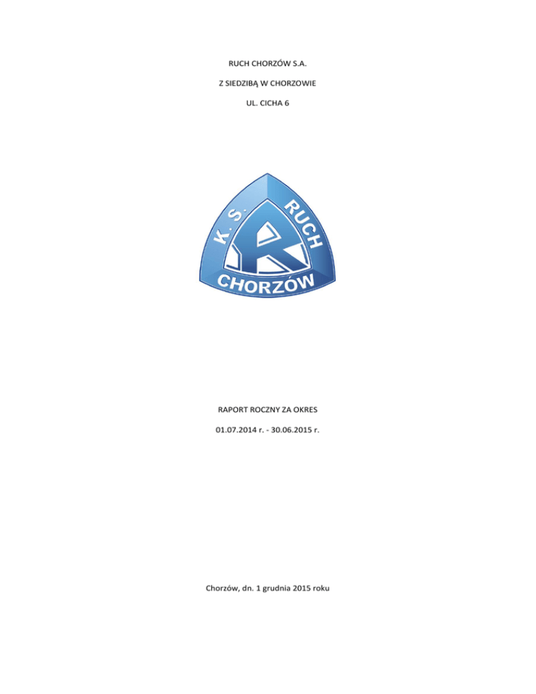 RUCH CHORZÓW S.A. Z SIEDZIBĄ W CHORZOWIE UL. CICHA 6 RAPORT ROCZNY ZA OKRES 01.07.2014 r. - 30.06.2015 r. Chorzów, dn. 1 grudnia 2015 roku Spis Treści 1.Pismo Zarządu ............................................................................................................................................... 3 2.Wybrane dane finansowe ............................................................................................................................. 4 3.Roczne sprawozdanie finansowe ................................................................................................................... 6 3.1. Wprowadzenie do sprawozdania finansowego ................................................................................. 6 3.2. Bilans .............................................................................................................................................. 11 3.3. Rachunek zysków i strat. ................................................................................................................ 16 3.4. Zestawienie zmian w kapitale własnym ......................................................................................... 19 3.5 Rachunek przepływów pieniężnych ................................................................................................ 22 3.6. Informacja dodatkowa ................................................................................................................... 25 3.7 Sprawdzenie poprawności sporządzenia not księgowych z Rachunkiem Zysków i Strat .................. 41 3.8 Istotne zdarzenia dotyczące roku obrotowego i lat ubiegłych ujęte w sprawozdaniu finansowym ... 46 3.9 Informacje dotyczące połączenia spółek .......................................................................................... 46 3.10 Wyjaśnienie powaznych zagrożeń dla kontynuacji działalności ...................................................... 46 4. Sprawozdanie Zarządu z działalności .......................................................................................................... 49 5. Oświadczenia Zarządu ................................................................................................................................ 87 6. Informacje o stosowaniu zasad ładu korporacyjnego ................................................................................. 88 RAPORT ROCZNY – OKRES OBRACHUNKOWY OD 01.07.2014 r. DO 30.06.2015 r. str. 2 1. Pismo Zarządu Szanowni Akcjonariusze, W imieniu Zarządu „Ruchu” Chorzów S.A. pragniemy przedstawić Państwu raport podsumowujący działalność „Ruchu” Chorzów S.A. z/s w Chorzowie ( zw. dalej „Spółką” ) począwszy od 01 lipca 2014 r. do 30 czerwca 2015 r. Ubiegły rok obrotowy obfitował w wiele ważnych dla Spółki wydarzeń, które przyczyniły się do jej intensywnego rozwoju. W części zatytułowanej „Sprawozdanie”, Zarząd wybrał najważniejsze wydarzenia ostatniego roku obrotowego, istotne dla Spółki i jej akcjonariuszy. Z poważaniem, Prezes Zarządu „Ruchu” Chorzów S.A. Dariusz Smagorowicz Wiceprezes Zarządu „Ruchu” Chorzów S.A. Mirosław Mosór RAPORT ROCZNY – OKRES OBRACHUNKOWY OD 01.07.2014 r. DO 30.06.2015 r. str. 3 2. Wybrane dane finansowe Wybrane dane finansowe Stan na 30.06.2014 Stan na 30.06.2015 PLN Kapitał własny Stan na 30.06.2014 Stan na 30.06.2015 EUR -22 611 299,19 -24 193 827,96 -5 434 232,78 -5 768 126,06 Kapitał podstawowy 18 676 695,00 21 676 695,00 4 488 619,05 5 168 008,53 Zobowiązania i rezerwy na zobowiązania 43 068 599,39 48 894 954,80 10 350 789,35 11 657 198,84 0,00 0,00 0,00 0,00 Zobowiązania krótkoterminowe 41 245 297,81 47 089 341,70 9 912 590,50 11 226 716,98 Aktywa razem 20 457 300,20 24 701 126,84 4 916 556,56 5 889 072,77 16 504,22 46 504,22 3 966,50 11 087,22 6 300 915,82 7 926 402,05 1 514 315,61 1 889 758,26 124 650,67 153 045,87 29 957,62 36 488,14 Zobowiązania długoterminowe Należności długoterminowe Należności krótkoterminowe Środki pieniężne i inne aktywa pieniężne Wybrane dane finansowe okres od 01.01.2013 do 30.06.2014 okres od 01.07.2014 do 30.06.2015 PLN okres od 01.01.2013 do 30.06.2014 okres od 01.07.2014 do 30.06.2015 EUR Przychody netto ze sprzedaży produktów, towarów i materiałów 16 985 102,16 17 909 199,02 4 082 074,11 4 269 788,06 Zysk (strata) ze sprzedaży -3 214 274,40 -1 869 486,66 -772 494,99 -445 710,15 1 052 879,14 561 323,92 253 041,20 133 826,99 Zysk (strata) z działalności operacyjnej -4 546 895,02 -460 490,70 -1 092 767,19 -109 787,03 Zysk (strata) brutto -8 751 129,83 -8 082 528,76 -2 103 181,96 -1 926 980,92 Zysk (strata) netto -8 740 913,43 -8 082 528,76 -2 100 726,63 -1 926 980,92 -10 460 092,83 -9 482 628,18 -2 513 901,52 -2 260 782,99 -66 519,72 -401 135,00 -15 986,86 -95 635,85 10 641 870,13 9 912 158,38 2 557 588,53 2 363 188,63 Przepływy pieniężne netto, razem 115 257,58 28 395,20 27 700,16 6 769,79 Liczba akcji (w szt.) 18 676 695 21 676 695 -0,4681 -0,3729 Amortyzacja Przepływy pieniężne netto z działalności operacyjnej Przepływy pieniężne netto z działalności inwestycyjnej Przepływy pieniężne netto z działalności finansowej Zysk (strata) na jedną akcję zwykłą RAPORT ROCZNY – OKRES OBRACHUNKOWY OD 01.07.2014 r. DO 30.06.2015 r. str. 4 Wartość księgowa na jedną akcję Przeliczenia kursu -1,2107 -1,1162 30.06.2014 30.06.2015 Kurs euro na dzień bilansowy 4,1609 4,1944 Średni kurs euro w okresie 01.07 do 30.06 4,2311 4,1670 RAPORT ROCZNY – OKRES OBRACHUNKOWY OD 01.07.2014 r. DO 30.06.2015 r. str. 5 3. ROCZNE SPRAWOZDANIE FINANSOWE 3.1. Wprowadzenie do sprawozdania finansowego 1. Sprawozdanie finansowe dotyczy: „RUCH” CHORZÓW SPÓŁKA AKCYJNA z siedzibą w Chorzowie, ul. Cicha 6 Spółka wpisana jest do Krajowego Rejestru Sądowego prowadzonego przez Sąd Rejonowy Katowice – Wschód Wydział VIII Gospodarczy Krajowego Rejestru Sądowego pod numerem KRS: 0000224