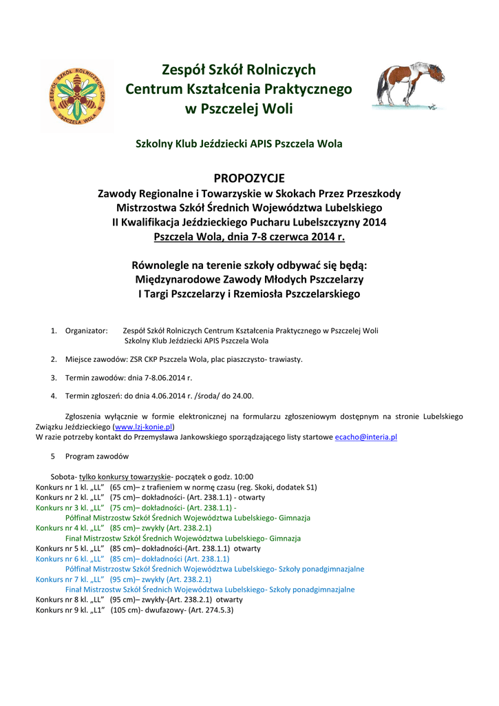 Zespół Szkół Rolniczych Centrum Kształcenia Praktycznego w Pszczelej Woli Szkolny Klub Jeździecki APIS Pszczela Wola PROPOZYCJE Zawody Regionalne i Towarzyskie w Skokach Przez Przeszkody Mistrzostwa Szkół Średnich Województwa Lubelskiego II Kwalifikacja Jeździeckiego Pucharu Lubelszczyzny 2014 Pszczela Wola, dnia 7-8 czerwca 2014 r. Równolegle na terenie szkoły odbywać się będą: Międzynarodowe Zawody Młodych Pszczelarzy I Targi Pszczelarzy i Rzemiosła Pszczelarskiego 1. Organizator: Zespół Szkół Rolniczych Centrum Kształcenia Praktycznego w Pszczelej Woli Szkolny Klub Jeździecki APIS Pszczela Wola 2. Miejsce zawodów: ZSR CKP Pszczela Wola, plac piaszczysto- trawiasty. 3. Termin zawodów: dnia 7-8.06.2014 r. 4. Termin zgłoszeń: do dnia 4.06.2014 r. /środa/ do 24.00. Zgłoszenia wyłącznie w formie elektronicznej na formularzu zgłoszeniowym dostępnym na stronie Lubelskiego Związku Jeździeckiego (www.lzj-konie.pl) W razie potrzeby kontakt do Przemysława Jankowskiego sporządzającego listy startowe [email protected] 5 Program zawodów Sobota- tylko konkursy towarzyskie- początek o godz. 10:00 Konkurs nr 1 kl. „LL” (65 cm)– z trafieniem w normę czasu (reg. Skoki, dodatek S1) Konkurs nr 2 kl. „LL” (75 cm)– dokładności- (Art. 238.1.1) - otwarty Konkurs nr 3 kl. „LL” (75 cm)– dokładności- (Art. 238.1.1) Półfinał Mistrzostw Szkół Średnich Województwa Lubelskiego- Gimnazja Konkurs nr 4 kl. „LL” (85 cm)– zwykły (Art. 238.2.1) Finał Mistrzostw Szkół Średnich Województwa Lubelskiego- Gimnazja Konkurs nr 5 kl. „LL” (85 cm)– dokładności-(Art. 238.1.1) otwarty Konkurs nr 6 kl. „LL” (85 cm)– dokładności (Art. 238.1.1) Półfinał Mistrzostw Szkół Średnich Województwa Lubelskiego- Szkoły ponadgimnazjalne Konkurs nr 7 kl. „LL” (95 cm)– zwykły (Art. 238.2.1) Finał Mistrzostw Szkół Średnich Województwa Lubelskiego- Szkoły ponadgimnazjalne Konkurs nr 8 kl. „LL” (95 cm)– zwykły-(Art. 238.2.1) otwarty Konkurs nr 9 kl. „L1” (105 cm)- dwufazowy- (Art. 274.5.3) W konkursach mistrzowskich można startować na jednym koniu, w finale zawodnicy startują w kolejności odwrotnej do liczby punktów karnych z półfinału, o miejscach w końcowej klasyfikacji decyduje suma punktów karnych z obu konkursów, a w drugiej kolejności czas konkursu finałowego. W sobotę w czasie do 30 minut po zakończeniu ostatniego konkursu można odbyć trening na przeszkodach stałych przewidzianych do konkursu Derby. Niedziela- początek o godz. 9:00 Konkurs nr 10 kl. „LL” (70 cm) – z trafieniem w normę czasu- (reg. Skoki, dodatek S1) towarzyski Konkurs nr 11 kl. „LL” (80 cm)– dwufazowy- (Art. 274.5.3)- towarzyski Konkurs kwalifikacyjny zaliczany do rankingu Jeździeckiego Pucharu Lubelszczyzny- Runda Otwarta Konkurs nr 12 kl. „LL” (90 cm) – zwykły (Art. 238.2.1)- towarzyski Konkurs nr 13 kl. „L” (100 cm) – licencyjny (reg. skoki, tabela III, L) Konkurs nr 14 kl. „L” (100 cm)– dwufazowy- (Art. 274.5.3) Konkurs kwalifikacyjny zaliczany do rankingu Jeździeckiego Pucharu Lubelszczyzny- Runda Średnia Konkurs nr 15 kl. „P” (110 cm) – o wzrastającym stopniu trudności z Jokerem – art. 269.5 Konkurs nr 16 kl. „N” (120 cm) – zwykły z rozgrywką- art. 238.2.2 Konkurs kwalifikacyjny zaliczany do rankingu Jeździeckiego Pucharu Lubelszczyzny– Runda Duża Konkurs nr 17 kl. „C” (130 cm) – zwykły z rozgrywką- art. 238.2.2 - /w przypadku zgłoszenia minimum 4 koni/ Konkurs nr 18 kl. „L” .(100 cm)- Derby Pszczelej Woli- specjalny, szybkości-(Art. 277)- towarzyski- przeszkody stałe do 90.cm 6 Komisja Sędziowska w składzie : Sędzia Główny - Jerzy Mełgieś Sędzia WZJ - Przemysław Jankowski Sędzia WZJ - Agnieszka Mełgieś Komisarz - Katarzyna Ziemińska-Milanowska Gospodarz toru - Krzysztof Bocian Lekarz weterynarii - Jarosław Karcz 7 Nagrody : Flot’s - dla 25% najlepszych koni. Puchary - w konkursach mistrzowskich i JPL. Dyplomy dla czołowych zawodników Mistrzostw Szkół Średnich Województwa Lubelskiego- przesłane po zawodach na adres szkoły. Nagrody rzeczowe, w tym talony na zakupy- w konkursach towarzyskich. Łączna planowana pula nagród finansowych 5000 PLN, zależna od liczby startujących w konkursach, nie licząc środków do puli Jeździeckiego Pucharu Lubelszczyzny. Podział nagród finansowych: Konkurs nr 14 - 700PLN (300, 200, 100, 100) Konkurs nr 15 - 1000PLN (400, 300, 200, 100) Konkurs nr 16 - 1650PLN (750, 400, 300, 200) Konkurs nr 17 - 1650PLN (750, 400, 300, 200) Nagrody finansowe w konkursach nr 14-17 przyznawane będą za: 4 pierwsze miejsca jeżeli w konkursie wystartuje co najmniej 14 koni, 3 pierwsze miejsca- co najmniej 10 koni, 2 pierwsze miejsca- co najmniej 6 koni, dla zwycięzcy- co najmniej 4 konie. 8 Opłaty. Wpisowe : sobota 40 PLN, niedziela 60 PLN od konia. Startowe : Konkursy 1-1010 PLN od startu Konkursy 11-13, 18 20 PLN od startu Konkursy 14-1730 PLN od startu Powyższe opłaty startowe zawierają w sobie środki, które organizator przekaże do puli Jeździeckiego Pucharu Lubelszczyzny. 9 Organizator informuje, że dysponuje ograniczoną liczbą boksów- /w tym tylko 4 dla ogierów/ koszt 50 PLN za jeden dzień zawodów, pierwszeństwo mają konie zgłoszone na dwa dni, konieczna wcześniejsza rezerwacja- Wojciech Jachymek 601-749-133, dla części koni dostępne będą nieodpłatnie stanowiska w krytej ujeżdżalni. 10 Organizator nie odpowiada za ewentualne wypadki i kradzieże zaistniałe w czasie transportu i podczas trwania zawodów. Uczestnicy, także w konkursach towarzyskich powinni posiadać ubezpieczenie NNW. 11 W niedzielę z okazji równolegle odbywającego się na głównym boisku szkoły festynu pszczelarskiego mogą wystąpić utrudnienia komunikacyjne, prosimy o cierpliwość- dołożymy starań by były mało dolegliwe. 12 Dokumentacja zgodnie z przepisami PZJ i LZJ- dostarczona do biura zawod