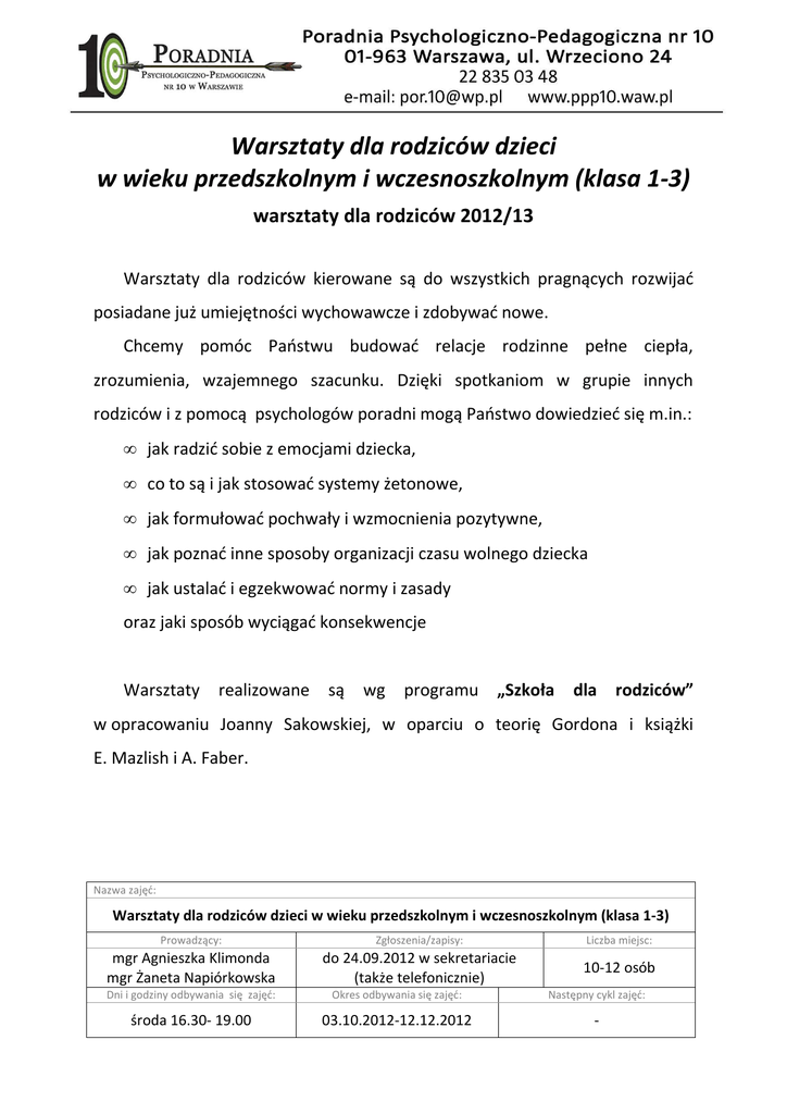 Warsztaty dla rodziców dzieci w wieku przedszkolnym i wczesnoszkolnym (klasa 1-3) warsztaty dla rodziców 2012/13 I Warsztaty dla rodziców kierowane są do wszystkich pragnących rozwijać posiadane już umiejętności wychowawcze i zdobywać nowe. Chcemy pomóc Państwu budować relacje rodzinne pełne ciepła, zrozumienia, wzajemnego szacunku. Dzięki spotkaniom w grupie innych rodziców i z pomocą psychologów poradni mogą Państwo dowiedzieć się m.in.: • jak radzić sobie z emocjami dziecka, • co to są i jak stosować systemy żetonowe, • jak formułować pochwały i wzmocnienia pozytywne, • jak poznać inne sposoby organizacji czasu wolnego dziecka • jak ustalać i egzekwować normy i zasady oraz jaki sposób wyciągać konsekwencje Warsztaty realizowane są wg programu „Szkoła dla rodziców” w opracowaniu Joanny Sakowskiej, w oparciu o teorię Gordona i książki E. Mazlish i A. Faber. Nazwa zajęć: Warsztaty dla rodziców dzieci w wieku przedszkolnym i wczesnoszkolnym (klasa 1-3) Prowadzący: Zgłoszenia/zapisy: Liczba miejsc: mgr Agnieszka Klimonda mgr Żaneta Napiórkowska do 24.09.2012 w sekretariacie (także telefonicznie) 10-12 osób Dni i godziny odbywania się zajęć: Okres odbywania się zajęć: Następny cykl zajęć: środa 16.30- 19.00 03.10.2012-12.12.2012 - Mediacje rodzinne spotkania dla rodzin 2012/13 I Mediacja rodzinna to jeden ze sposobów rozwiązywania konfliktów między członkami rodziny. Mediacja pozwala wypracować rozwiązania satysfakcjonujące wszystkie strony konfliktu. W mediacji nie ma przegranych. Z oferty warto skorzystać, jeśli zauważycie Państwo, że nie możecie się porozumieć, mimo, że próbujecie ze sobą rozmawiać. Mediacja jest skuteczna, jeśli obie strony konfliktu chcą wspólnie wypracować porozumienie. Proponujemy mediacje: • Konfliktów małżeńskich np. ustalenie zasad wychowania dzieci, podziału obowiązków domowych. • Konfliktów w relacjach rodzic- dorastające dziecko np. ustalenie zakresu swobód i obowiązków. Podczas spotkania wstępnego uczestnicy dowiadują się szczegółowo, co to jest mediacja, poznają jej zasady i przebieg. Jeśli strony zdecydują się na mediacje, zaplanowane zostają terminy kolejnych spotkań. Podczas sesji mediacyjnej najpierw każdy z uczestników prezentuje swoją perspektywę widzenia sytuacji problemowej. Dalsze etapy mediacji to wybór obszarów do pracy i poszukiwanie rozwiązań. W fazie końcowej strony wypracowują porozumienie i zostaje ono spisane w formie ugody. Mediacje prowadzą psychologowie z przygotowaniem do prowadzenia mediacji oraz terapii rodzin. Nazwa zajęć: Mediacje rodzinne Prowadzący: Zgłoszenia/zapisy: Liczba miejsc: mgr Danuta Walczak mgr Stanisława Wasilewska indywidualnie, u prowadzących spotkania (także telefonicznie) - Dni i godziny odbywania się zajęć: Okres odbywania się zajęć: Następny cykl zajęć: środy w godz. 15.00-19.00 piątki w godz. 16.00-18.00 09.2012 – 06.2013 - Warsztaty dla rodziców mających problemy z trudnymi zachowaniami dzieci (kontynuacja) warsztaty dla rodziców 2012/13 I Warsztaty kierowane są do rodziców, którzy uczestniczyli w pierwszej edycji spotkań (rok szkolny 2011\2012) prowadzonych przez Aleksandrę Grzechowiak oraz Kingę Taraszewską-Budytę i w dalszym ciągu są zainteresowani utrwalaniem nowych umiejętności wychowawczych, a także pogłębianiem wiedzy o sposobach rozwiązywania trudnych sytuacji przebiegających z udziałem dzieci. Celem spotkań jest dalsze podnoszenie kompetencji wychowawczych rodziców oraz wzmacnianie w nich poczucia własnej siły i możliwości wpływania na swoje dziecko, a także udzielanie sobie wzajemnego wsparcia przez uczestników grupy. Ofertę kierujemy wyłącznie do rodziców, którzy uczestniczyli w pierwszej części warsztatów. Nazwa zajęć: Warsztaty dla rodziców mających problemy z trudnymi zachowaniami dzieci (kontynuacja) Prowadzący: Zgłoszenia/zapisy: Liczba miejsc: mgr Aleksandra Grzechowiak mgr Kinga Taraszewska-Budyta indywidualnie, u prowadzących spotkania (także telefonicznie) 12 osób Dni i godziny odbywania się zajęć: Okres odbywania się zajęć: Następny cykl zajęć: 1 raz w miesiącu, np. sobota (do uzgodnienia z uczestnikami) 09.2012 – 06.2013 - „Czy moje dziecko jest nadpobudliwe? Jak mogę mu pomóc?” warsztaty dla rodziców 2012/13 Udział w warsztatach pozwoli Państwu inaczej spojrzeć na problemy Waszego dziecka, wprowadzi do Państwa domu więcej spokoju i radości, ułatwi zdobywanie nowych umiejętności wychowawczych oraz ułatwi kontakty z nauczycielami i innymi osobami pracującymi z Państwa dzieckiem. Podczas zajęć omówione zostaną m.in. następujące tematy: 1. Czy moje dziecko jest nadpobudliwe, czyli podstawowe wiadomości na temat ADHD. 2. Porządkujemy świat naszych dzieci, czyli o normach, zasadach, granicach konsekwencjach. 3. Podstawy dobrej komunikacji z dzieckiem nadpobudliwym, czyli jak skutecznie wydawać polecenia. 4. Wzmacnianie zachowań pożądanych, czyli jak skutecznie chwalić i nagradzać dziecko. 5. Jak reagować na niewłaściwe zachowania dziecka? 6. Jak pomóc dzieciom, aby radziły sobie z własnymi uczuciami? (bariery komunikacyjne) 7. Jak radzić sobie z niechcianymi emocjami, które wzbudzają w nas dzieci nadpobudliwe? 8. Współpraca rodziców ze szkołą, nowe perspektywy. Zajęcia skierowane są dla rodziców dzieci w wieku przedszkolnym i szkolnym, przejawiających cechy zespołu nadpobudliwości psychoruchowej. Nazwa zajęć: „Czy moje dziecko jest nadpobudliwe? Jak mogę mu pomóc?” Prowadzący: Zgłoszenia/zapisy: Liczba miejsc: mgr Anna Łukaszewicz mgr Olimpia Romanowska indywidualnie, u prowadzących spotkania lub poprzez psychologów 10-12 osób Dni i godziny odbywania się zajęć: Okres odbywania się zajęć: Następny cykl zajęć: poniedziałki 17.15- 19.00 12 tygodni tak, w II semestrze Punkt Informacyjno-Konsultacyjny dla Rodzic