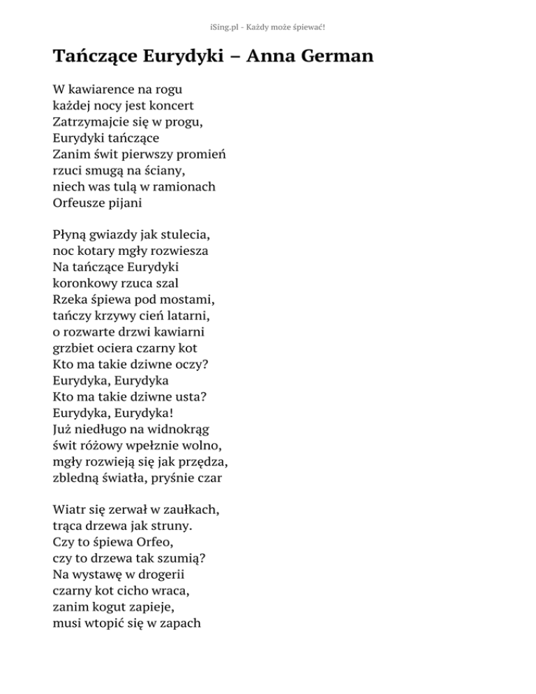 iSing.pl - Każdy może śpiewać! Tańczące Eurydyki – Anna German W kawiarence na rogu każdej nocy jest koncert Zatrzymajcie się w progu, Eurydyki tańczące Zanim świt pierwszy promień rzuci smugą na ściany, niech was tulą w ramionach Orfeusze pijani Płyną gwiazdy jak stulecia, noc kotary mgły rozwiesza Na tańczące Eurydyki koronkowy rzuca szal Rzeka śpiewa pod mostami, tańczy krzywy cień latarni, o rozwarte drzwi kawiarni grzbiet ociera czarny kot Kto ma takie dziwne oczy? Eurydyka, Eurydyka Kto ma takie dziwne usta? Eurydyka, Eurydyka! Już niedługo na widnokrąg świt różowy wpełznie wolno, mgły rozwieją się jak przędza, zbledną światła, pryśnie czar Wiatr się zerwał w zaułkach, trąca drzewa jak struny. Czy to śpiewa Orfeo, czy to drzewa tak szumią? Na wystawę w drogerii czarny kot cicho wraca, zanim kogut zapieje, musi wtopić się w zapach Rzeka szemrze pod mostami, znikł już szary cień latarni, wchodzą ludzie do kawiarni, na ulicy zwykły gwar A wiatr tańczy ulicami, wiatr kołuje jak pijany, i rozwiesza na gałęziach z pajęczyny tkany szal Kto ma takie dziwne oczy? Eurydyka, Eurydyka Kto ma takie dziwne usta? Eurydyka, Eurydyka! A wiatr tańczy ulicami, wiatr kołuje jak pijany, mgły rozwiały się jak przędza, został tylko, został tylko czarny kot Słowa: Katarzyna Gaertner Muzyka: Ewa Rzemieniecka Rok wydania: brak danych Płyta: brak danych
