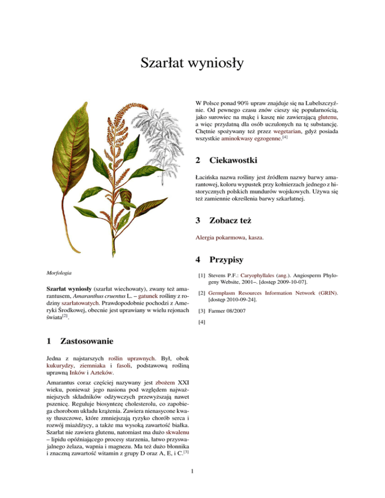 Szarłat wyniosły W Polsce ponad 90% upraw znajduje się na Lubelszczyźnie. Od pewnego czasu znów cieszy się popularnością, jako surowiec na mąkę i kaszę nie zawierającą glutenu, a więc przydatną dla osób uczulonych na tę substancję. Chętnie spożywany też przez wegetarian, gdyż posiada wszystkie aminokwasy egzogenne.[4] 2 Ciekawostki Łacińska nazwa rośliny jest źródłem nazwy barwy amarantowej, koloru wypustek przy kołnierzach jednego z historycznych polskich mundurów wojskowych. Używa się też zamiennie określenia barwy szkarłatnej. 3 Zobacz też Alergia pokarmowa, kasza. 4 Przypisy Morfologia [1] Stevens P.F.: Caryophyllales (ang.). Angiosperm Phylogeny Website, 2001–. [dostęp 2009-10-07]. Szarłat wyniosły (szarłat wiechowaty), zwany też amarantusem, Amaranthus cruentus L. – gatunek rośliny z rodziny szarłatowatych. Prawdopodobnie pochodzi z Ameryki Środkowej, obecnie jest uprawiany w wielu rejonach świata[2] . 1 [2] Germplasm Resources Information Network (GRIN). [dostęp 2010-09-24]. [3] Farmer 08/2007 [4] Zastosowanie Jedna z najstarszych roślin uprawnych. Był, obok kukurydzy, ziemniaka i fasoli, podstawową rośliną uprawną Inków i Azteków. Amarantus coraz częściej nazywany jest zbożem XXI wieku, ponieważ jego nasiona pod względem najważniejszych składników odżywczych przewyższają nawet pszenicę. Reguluje biosyntezę cholesterolu, co zapobiega chorobom układu krążenia. Zawiera nienasycone kwasy tłuszczowe, które zmniejszają ryzyko chorób serca i rozwój miażdżycy, a także ma wysoką zawartość białka. Szarłat nie zawiera glutenu, natomiast ma dużo skwalenu – lipidu opóźniającego procesy starzenia, łatwo przyswajalnego żelaza, wapnia i magnezu. Ma też dużo błonnika i znaczną zawartość witamin z grupy D oraz A, E, i C.[3] 1 2 5 TEXT AND IMAGE SOURCES, CONTRIBUTORS, AND LICENSES 5 Text and image sources, contributors, and licenses 5.1 Text • Szarłat wyniosły Source: http://pl.wikipedia.org/wiki/Szar%C5%82at%20wynios%C5%82y?oldid=40673754 Contributors: Borkowsk, Tawbot, Olafbot, Robbot, Siałababamak, Ma'ame Michu, Tsca.bot, Chrumps, Aki, Julo, Zwobot, YurikBot, Mchpro, Konradr, MalarzBOT, Selso, Slaweks, DodekBot, Wicki, Idioma-bot, TXiKiBoT, A.bot, MatmaBot, KamikazeBot, AlohaBOT, JackieBot, EmausBot, ZéroBot, Rezabot, Addbot oraz Anonymous: 8 5.2 Images • Plik:Amaranthus_cruentus1.jpg Source: http://upload.wikimedia.org/wikipedia/commons/0/05/Amaranthus_cruentus1.jpg License: CC-BY-SA-3.0 Contributors: caliban.mpiz-koeln.mpg.de/mavica/index.html part of www.biolib.de Original artist: Kurt Stüber [1] • Plik:Amaranthus_cruentus_Blanco2.430-cropped.jpg Source: http://upload.wikimedia.org/wikipedia/commons/a/a7/Amaranthus_ cruentus_Blanco2.430-cropped.jpg License: Public domain Contributors: Flora de Filipinas [...] Gran edicion [...] [Atlas II].[1] Original artist: Francisco Manuel Blanco (O.S.A.) • Plik:Commons-logo.svg Source: http://upload.wikimedia.org/wikipedia/commons/4/4a/Commons-logo.svg License: Public domain Contributors: This version created by Pumbaa, using a proper partial circle and SVG geometry features. (Former versions used to be slightly warped.) Original artist: SVG version was created by User:Grunt and cleaned up by 3247, based on the earlier PNG version, created by Reidab. 5.3 Content license • Creative Commons Attribution-Share Alike 3.0
