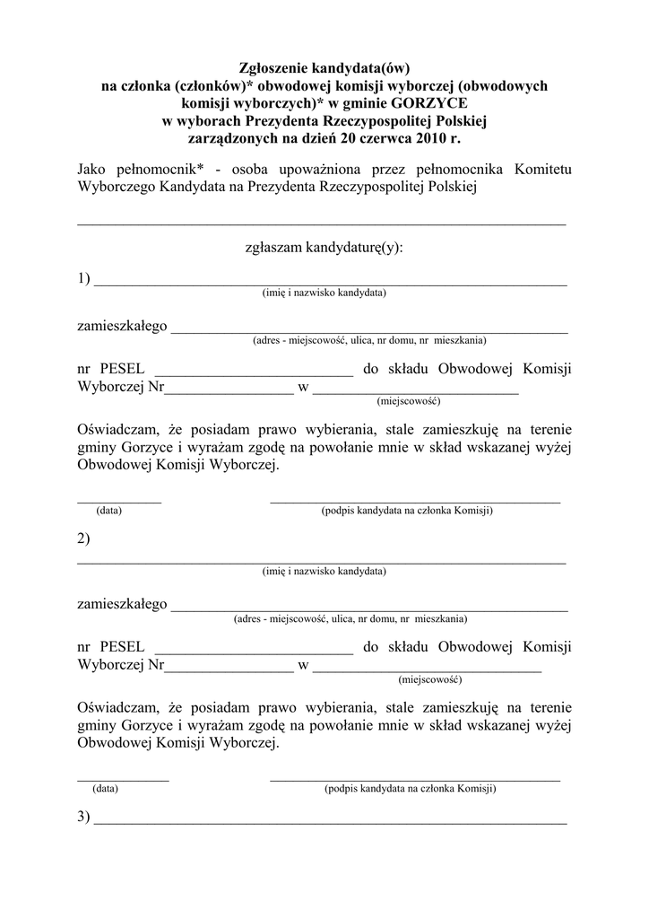 Zgłoszenie kandydata(ów) na członka (członków)* obwodowej komisji wyborczej (obwodowych komisji wyborczych)* w gminie GORZYCE w wyborach Prezydenta Rzeczypospolitej Polskiej zarządzonych na dzień 20 czerwca 2010 r. Jako pełnomocnik* - osoba upowaŜniona przez pełnomocnika Komitetu Wyborczego Kandydata na Prezydenta Rzeczypospolitej Polskiej ________________________________________________________________ zgłaszam kandydaturę(y): 1) ______________________________________________________________ (imię i nazwisko kandydata) zamieszkałego ____________________________________________________ (adres - miejscowość, ulica, nr domu, nr mieszkania) nr PESEL __________________________ do składu Obwodowej Komisji Wyborczej Nr_________________ w ___________________________ (miejscowość) Oświadczam, Ŝe posiadam prawo wybierania, stale zamieszkuję na terenie gminy Gorzyce i wyraŜam zgodę na powołanie mnie w skład wskazanej wyŜej Obwodowej Komisji Wyborczej. ___________ (data) ______________________________________ (podpis kandydata na członka Komisji) 2) ________________________________________________________________ (imię i nazwisko kandydata) zamieszkałego ____________________________________________________ (adres - miejscowość, ulica, nr domu, nr mieszkania) nr PESEL __________________________ do składu Obwodowej Komisji Wyborczej Nr_________________ w ______________________________ (miejscowość) Oświadczam, Ŝe posiadam prawo wybierania, stale zamieszkuję na terenie gminy Gorzyce i wyraŜam zgodę na powołanie mnie w skład wskazanej wyŜej Obwodowej Komisji Wyborczej. ____________ (data) ______________________________________ (podpis kandydata na członka Komisji) 3) ______________________________________________________________ (imię i nazwisko kandydata) zamieszkałego ____________________________________________________ (adres - miejscowość, ulica, nr domu, nr mieszkania) nr PESEL __________________________ do składu Obwodowej Komisji Wyborczej Nr_________________ w ______________________________ (miejscowość) Oświadczam, Ŝe posiadam prawo wybierania, stale zamieszkuję na terenie gminy Gorzyce i wyraŜam zgodę na powołanie mnie w skład wskazanej wyŜej Obwodowej Komisji Wyborczej. ___________ ______________________________________ (data) (podpis kandydata na członka Komisji) 4) ______________________________________________________________ (imię i nazwisko kandydata) zamieszkałego ____________________________________________________ (adres - miejscowość, ulica, nr domu, nr mieszkania) nr PESEL __________________________ do składu Obwodowej Komisji Wyborczej Nr_________________ w ______________________________ (miejscowość) Oświadczam, Ŝe posiadam prawo wybierania, stale zamieszkuję na terenie gminy Gorzyce i wyraŜam zgodę na powołanie mnie w skład wskazanej wyŜej Obwodowej Komisji Wyborczej. ___________ (data) ______________________________________ (podpis kandydata na członka Komisji) _______________________________________ (podpis zgłaszającego) ____________ (data) _________________________ * Niepotrzebne skreślić. _______________________________________ (czytelnie imię, nazwisko, funkcja)