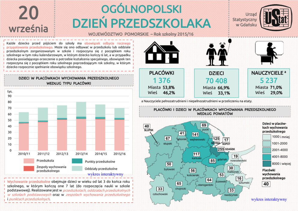 20 OGÓLNOPOLSKI Urząd Statystyczny w Gdańsku DZIEŃ PRZEDSZKOLAKA września WOJEWÓDZTWO POMORSKIE – Rok szkolny 2015/16 Każde dziecko przed pójściem do szkoły ma obowiązek odbycia rocznego przygotowania przedszkolnego. Może się ono odbywać w przedszkolu lub oddziale przedszkolnym zorganizowanym w szkole i rozpoczyna się z początkiem roku szkolnego w tym roku kalendarzowym, w którym dziecko kończy 6 lat, a w przypadku dziecka posiadającego orzeczenie o potrzebie kształcenia specjalnego, obowiązek ten rozpoczyna się z początkiem roku szkolnego poprzedzającym rok szkolny, w którym dziecko rozpocznie spełnianie obowiązku szkolnego. DZIECI W PLACÓWKACH WYCHOWANIA PRZEDSZKOLNEGO WEDŁUG TYPU PLACÓWKI tys. 90 PLACÓWKI DZIECI NAUCZYCIELE a 1 376 70 408 5 237 Miasta 53,8% Wieś 46,2% Miasta 66,9% Wieś 33,1% Miasta 71,0% Wieś 29,0% a Nauczyciele pełnozatrudnieni i niepełnozatrudnieni w przeliczeniu na etaty. 80 70 PLACÓWKI I DZIECI W PLACÓWKACH WYCHOWANIA PRZEDSZKOLNEGO WEDŁUG POWIATÓW 60 50 40 SŁUPSK 30 pucki 41 20 67 10 słupski 0 Dzieci w placówkach wychowania przedszkolnego 69 40 lęborski 141 wejherowski 125 1000 i mniej 17 GDYNIA SOPOT 1001-2000 255 GDAŃSK 2010/11 2011/12 2012/13 2013/14 2014/15 2015/16 Przedszkola Punkty przedszkolne Zespoły wychowania przedszkolnego Oddziały przedszkolne 117 kartuski 50 bytowski człuchowski chojnicki 4001-8000 malborski 53 64 65 19 nowodworski 30 kościerski 33 gdański 56 wykres interaktywny Wychowanie przedszkolne obejmuje dzieci w wieku od lat 3 do końca roku szkolnego, w którym kończą one 7 lat (do rozpoczęcia nauki w szkole podstawowej). Realizowane jest w przedszkolach, oddziałach przedszkolnych w szkołach podstawowych oraz w zespołach wychowania przedszkolnego i punktach przedszkolnych. 85 2001-4000 16 tczewski sztumski starogardzki 8000 i więcej Placówki wychowania przedszkolnego 40 33 kwidzyński wykres interaktywny PLACÓWKI WYCHOWANIA PRZEDSZKOLNEGO WEDŁUG TYPU PLACÓWKI W MIASTACH I NA WSI DZIECI W PLACÓWKACH WYCHOWANIA PRZEDSZKOLNEGO WEDŁUG WIEKU DZIECI W PLACÓWKACH WYCHOWANIA PRZEDSZKOLNEGO WEDŁUG TYPU PLACÓWKI W MIASTACH I NA WSI tys. 30 25 wykres interaktywny 20 15 WIEŚ MIASTO MIASTO 10 5 Przedszkola Przedszkola 0 2 lata i mniej 470 222 3 lata 4 lata pucki lęborski 4 5 lat 6 lat SŁUPSK GDYNIA SOPOT wejherowski GDAŃSK gdański bytowski Trzy malborski Dzieci korzystające z posiłków 1000 i mniej tczewski starogardzki chojnicki Oddziały przedszkolne w szkołach podstawowych człuchowski 334 sztumski 1001-2000 43 kwidzyński 1 804 1 372 Oddziały przedszkolne w szkołach podstawowych 4001-8000 8000 i więcej Przedszkola publiczne zapewniają bezpłatne nauczanie, wychowanie i opiekę w czasie ustalonym przez organ prowadzący, nie krótszym niż 5 godzin dziennie. Opłaty są wnoszone za dodatkowe godziny (nie więcej niż 1 zł za godzinę zajęć) oraz za wyżywienie. 84 Punkty przedszkolne 2001-4000 wykres interaktywny 165 Jeden nowodworski kościerski 76 12 185 Otrzymywane posiłki (w %) Dwa kartuski 38 472 Zespoły wychowania przedszkolnego słupski Punkty przedszkolne 103 7 lat i więcej DZIECI KORZYSTAJĄCE Z POSIŁKÓW W PLACÓWKACH WYCHOWANIA PRZEDSZKOLNEGO WEDŁUG POWIATÓW I OTRZYMYWANYCH POSIŁKÓW Zespoły wychowania przedszkolnego 2 WIEŚ 6 786 Ź r ó d ł o: System Informacji Oświatowej. Opracowanie merytoryczne: Anna Żochowska – Ośrodek Statystyki Edukacji i Kapitału Ludzkiego Redakcja i skład komputerowy: Wiesława Brylowska, Monika Kowalewska – Pomorski Ośrodek Badań Regionalnych, Referat Analiz Zbiorczych 9 662 Przy publikowaniu danych US prosimy o podanie źródła.