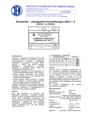 INSTYTUT ENERGETYKI Oddział Gdańsk Jednostka Badawczo-Rozwojowa ul. Mikołaja Reja 27, 80-870 Gdańsk tel. (48 58) 349 82 00, fax: (48 58) 349 76 85 e-mail: [email protected] http://www.ien.gda.pl ZAKŁAD URZĄDZEŃ ENERGOELEKTRONICZNYCH tel. (48 58) 349 81 00, fax: (48 58) 349 76 85, GSM: 602 639 079, e-mail: [email protected] Konwerter – przełącznik komunikacyjny ASa-1 / 2 (RS232 / 2 x RS232) Przeznaczenie Konwerter – przełącznik komunikacyjny AS-1/2 jest urządzeniem służącym do zestawiania połączenia komunikacyjnego pomiędzy urządzeniem nadrzędnym, wyposażonym w interfejs RS232 a jednym z dwóch (lub więcej) urządzeń podrzędnych, wyposażonych w interfejsy szeregowe w standardzie RS232. Może być wykorzystywany w przypadku gdy: • urządzenia podrzędne nie są adresowalne na poziomie zaimplementowanego w nich protokołu, • istnieje potrzeba zestawienia wielu kanałów łączności szeregowej przy użyciu jednego portu szeregowego w komputerze, • istnieje potrzeba zdalnej łączności z różnymi typami urządzeń za pomocą jednego zdalnego modemu (dostępna jedna linia telefoniczna). Typowym zastosowaniem jest realizacja łączności z jednego stanowiska komputerowego pomiędzy programami użytkowymi a odpowiadającymi im urządzeniami (lub zespołami urządzeń). Budowa AS-1 jest montowany w obudowie serii MODULBOX wykonanej z niepalnego materiału NORYL UL 94VO. Obudowa umożliwia montaż na listwie TS35. Rozdzielacz wyposażony jest w zaciski śrubowe do podłączenia linii interfejsów szeregowych i zasilania. Na płycie czołowej umieszczono mikroprzełącznik do ustawiania adresu rozdzielacza (poz. 1-5) oraz prędkości transmisji (poz. 6-7). „1” na przełączniku – pozycja ON ustawianie adresu szybkość 1 2 3 4 5 adres 6 7 Bd 0 0 0 0 0 0 0 0 1200 0 0 0 0 1 1 0 1 2400 ... ... ... ... ... ... 1 0 4800 1 1 1 1 1 31 1 1 9600 Funkcje Schemat logiczny urządzenia przedstawiono na rys. 1. Konwerter – przełącznik komunikacyjny AS1/2 zestawia połączenie między wejściem (zaciski 3 ÷ 5) a wyjściem 1 (zaciski 14 ÷ 16) lub między wejściem a wyjściem 2 (zaciski 9 ÷ 11). Po zestawieniu połączenia można prowadzić właściwą komunikację między połączonymi urządzeniami. Dla wszystkich wersji zapewniona jest separacja galwaniczna. Na życzenie udostępniany jest protokół zastosowany w rozdzielaczu. Dane techniczne: Zasilanie 230 V AC Maksymalny pobór mocy 6 VA Adres rozdzielacza 32 wartości ustawiane mikroprzełącznikiem Prędkość transmisji 1200, 2400, 4800 lub 9600 Bd lub inna, zależnie od zamówienia Wymiary 160 x 90 x 58 Temperatura: • magazynowania - 25 °C ÷ + 85 °C • pracy 0 ÷ 50 °C Wilgotność względna max 80 % średnio w roku Zapylenie brak pyłów i gazów agresywnych Rys. 1. Schemat logiczny konwertera – przełącznika komunikacyjnego AS-1/2. Rys. 2. Wymiary konwertera – przełącznika komunikacyjnego AS-1/2.