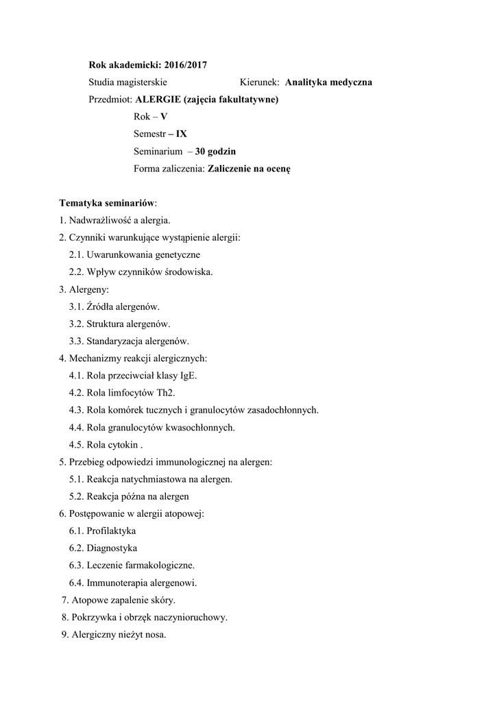 Rok akademicki: 2016/2017 Studia magisterskie Kierunek: Analityka medyczna Przedmiot: ALERGIE (zajęcia fakultatywne) Rok – V Semestr – IX Seminarium – 30 godzin Forma zaliczenia: Zaliczenie na ocenę Tematyka seminariów: 1. Nadwrażliwość a alergia. 2. Czynniki warunkujące wystąpienie alergii: 2.1. Uwarunkowania genetyczne 2.2. Wpływ czynników środowiska. 3. Alergeny: 3.1. Źródła alergenów. 3.2. Struktura alergenów. 3.3. Standaryzacja alergenów. 4. Mechanizmy reakcji alergicznych: 4.1. Rola przeciwciał klasy IgE. 4.2. Rola limfocytów Th2. 4.3. Rola komórek tucznych i granulocytów zasadochłonnych. 4.4. Rola granulocytów kwasochłonnych. 4.5. Rola cytokin . 5. Przebieg odpowiedzi immunologicznej na alergen: 5.1. Reakcja natychmiastowa na alergen. 5.2. Reakcja późna na alergen 6. Postępowanie w alergii atopowej: 6.1. Profilaktyka 6.2. Diagnostyka 6.3. Leczenie farmakologiczne. 6.4. Immunoterapia alergenowi. 7. Atopowe zapalenie skóry. 8. Pokrzywka i obrzęk naczynioruchowy. 9. Alergiczny nieżyt nosa. 10. Astma oskrzelowa. 11. Choroby alergiczne płuc wywołane pyłami organicznymi. 12. Alergiczne zapalenie spojówek. 13. Rośliny wywołujące alergie. 13.1. Kalendarz pylenia. 14. Rola zwierząt w powstawaniu alergii. 15. Alergia na leki. 16. Alergie pokarmowe. 17. Immunoprofilaktyka i immunoterapia alergii. 18. Diagnostyka alergii. Zalecane podręczniki: 1. Gołąb J., Jakóbisiak M., Lasek W., Stokłosa T. (red.) : Immunologia. PWN, Warszawa 2012. 2. Gravers G., Bocken M: Ilustrowany podręcznik chorób alergicznych. Wyd. Urban & Partner, Wrocław 2002. 3. Kowalski M. (red.): Immunologia kliniczna. Mediton, Łódź 2000. 4. Lasek W.: Immunologia. Podstawowe zagadnienia i aktualności. PWN, Warszawa 2005. 5. Zembala M., Górski A. (red): Zarys immunologii klinicznej. PZWL, Warszawa 2001. 6. Żeromski J. (red.): Immunologia. PZWL, Warszawa 2000.