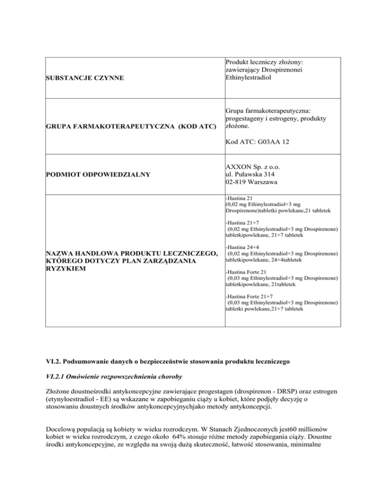SUBSTANCJE CZYNNE Produkt leczniczy złożony: zawierający Drospirenonei Ethinylestradiol GRUPA FARMAKOTERAPEUTYCZNA (KOD ATC) Grupa farmakoterapeutyczna: progestageny i estrogeny, produkty złożone. Kod ATC: G03AA 12 PODMIOT ODPOWIEDZIALNY AXXON Sp. z o.o. ul. Puławska 314 02-819 Warszawa -Hastina 21 (0,02 mg Ethinylestradiol+3 mg Drospirenone)tabletki powlekane,21 tabletek -Hastina 21+7 (0,02 mg Ethinylestradiol+3 mg Drospirenone) tabletkipowlekane, 21+7 tabletek NAZWA HANDLOWA PRODUKTU LECZNICZEGO, KTÓREGO DOTYCZY PLAN ZARZĄDZANIA RYZYKIEM -Hastina 24+4 (0,02 mg Ethinylestradiol+3 mg Drospirenone) tabletkipowlekane, 24+4tabletek -Hastina Forte 21 (0,03 mg Ethinylestradiol+3 mg Drospirenone) tabletkipowlekane, 21tabletek -Hastina Forte 21+7 (0,03 mg Ethinylestradiol+3 mg Drospirenone) tabletki powlekane,21+7 tabletek VI.2. Podsumowanie danych o bezpieczeństwie stosowania produktu leczniczego VI.2.1 Omówienie rozpowszechnienia choroby Złożone doustneśrodki antykoncepcyjne zawierające progestagen (drospirenon - DRSP) oraz estrogen (etynyloestradiol - EE) są wskazane w zapobieganiu ciąży u kobiet, które podjęły decyzję o stosowaniu doustnych środków antykoncepcyjnychjako metody antykoncepcji. Docelową populacją są kobiety w wieku rozrodczym. W Stanach Zjednoczonych jest60 millionów kobiet w wieku rozrodczym, z czego około 64% stosuje różne metody zapobiegania ciąży. Doustne środki antykoncepcyjne, ze względu na swoją dużą skuteczność, łatwość stosowania, minimalne działania niepożądane oraz właściwą kontrolę cyklu menstruacyjnego są najpopularniejszą odwracalną metodą zapobiegania ciąży. VI.2.2 Omówienie korzyści wynikających z leczenia Złożone doustne środki antykoncepcyjne hamują miesiączkowanie i są przeznaczone do stosowania u kobiet w celu zapobiegania nieplanowanej ciąży. Charakterystyczne dlaantykoncepcji hormonalnej są: samokontrola użytkownika, wysoka skuteczność w połączeniu z niewielkim odsetkiem niepowodzeń w stosowaniu. VI.2.3. Brakujące dane odnoszące się do korzyści wynikających z leczenia Profil bezpieczeństwa doustnych hormonalnych środków antykoncepcyjnych zawierającychprogestagen(drospirenon - DRSP) oraz estrogen (etynyloestradiol - EE) jest dobrze znany i podobny do innych hormonalnych środków antykoncepcyjnych.Hormonalne środki antykoncepcyjne są dobrze tolerowane i przeprowadzono wystarczającą liczbę badań klinicznych, do których właczono docelową populację pacjentek (kobiety w wieku rozrodczym). Złożone doustne środki antykoncepcyjne zawierające progestagen(drospirenon - DRSP) oraz estrogen (etynyloestradiol - EE) są przeciwwskazane u kobiet z ciężkimi schorzeniami wątroby lub nerek. W odniesieniu do wieku pacjentek, złożone doustne środki antykoncepcyjnenie są wskazane do stosowania tylko u kobiet przed okresem pokwitania oraz po menopauzie. W odniesieniu do różnych grup etnicznych, nie stwierdzono istotnych klinicznie różnic we właściwościach farmakokinetycznych złożonych doustnych środków antykoncepcyjnychzawierającychprogestagen(drospirenon - DRSP)) oraz estrogen (etynyloestradiol EE)pomiędzy kobietami pochodzącymi z Japonii i kobietami rasy kaukaskiej, w związku z tym nie należy się spodziewać różnic w skuteczności tych produktów leczniczych. VI.2.4Podsumowanie zagadnień dotyczących kwestii bezpieczeństwa RYZYKO CO WIADOMO MOŻLIWOŚCI ZAPOBIEGANIA Zator naczyń żylnych i tętniczych (zakrzepica żylna i tętnicza) Ryzyko wystąpienia zakrzepu krwi Jeśli pacjentka zauważy (zakrzepica żylna i tętnicza) zwiększa się u którykolwiek z tych objawów, kobiet stosujących złożone tabletki powinna natychmiast przerwać antykoncepcyjne, w porównaniu do kobiet, przyjmowanie leku i które nie stosują takich leków. niezwłocznie skontaktować się z - Na100 000 kobiet, które nie stosują tabletek lekarzem: antykoncepcyjnych i które nie są w ciąży, u - ostry ból i (lub) obrzęk jednej około 5-10 kobiet może w ciągu roku wystąpić kończyny dolnej zakrzep krwi. - ból i uczucie ucisku w klatce - Na 100 000 kobiet, które stosują tabletki piersiowej, mogące antykoncepcyjne, u około 30-40 kobiet może promieniować do lewego w ciągu roku wystąpić zakrzep krwi, chociaż ramienia dokładna liczba nie jest znana. - nagła duszność - Na 100 000 kobiet, które są w ciąży, u około - nagły nieuzasadniony kaszel 60 kobiet może w ciągu roku wystąpić zakrzep - nietypowy, silny lub krwi. długotrwały ból głowy lub Zakrzep krwi, który utworzy się w naczyniach nasilenie migreny żylnych może się przemieścić do płuc i - częściowa lub całkowita utrata zablokować naczynia (tak zwany zator wzroku lub podwójne widzenie Rak piersi płucny). - trudności w mówieniu lub utrata Tworzenie się zakrzepów w naczyniach zdolności mowy, żylnych może w 1-2% przypadów zakończyć - zawroty głowy lub omdlenie, się zgonem. - osłabienie, dziwne Ryzyko tworzenia się zatorów w naczyniach samopoczucie lub drętwienie żylnych zwiększa się: jakiejkolwiek części ciała. - wraz z wiekiem Nie należy zażywać tabletek i - w przypadku otyłości skonsultować się z lekarzem, jeśli - jeśli ktokolwiek z bliskich krewnych przebył u pacjentki występują zaburzenia kiedykolwiek w młodości zakrzep w krzepnięcia krwi (np. niedobór naczyniach nóg, naczyniach płucnych (zator białka C). płucny) lub w innym narządzie - jeśli pacjent ma mieć zabieg operacyjny, doznał ciężkiego wypadku lub jest unieruchomiony przez długi czas. Stosowanie złożonych tabletek antykoncepcyjnych jest powiązane ze zwiększeniem ryzyka wystąpienia zakrzepu w naczyniach tętniczych (zakrzepica tętnicza), np. w naczyniach serca (atak serca) lub mózgu (udar). Ryzyko tworzenia się zatorów w naczyniach tętniczych zwiększa się: - u osób palących tytoń - w przypadku zwiększonego stężenia tłuszczu we krwi (cholesterolu lub trigl