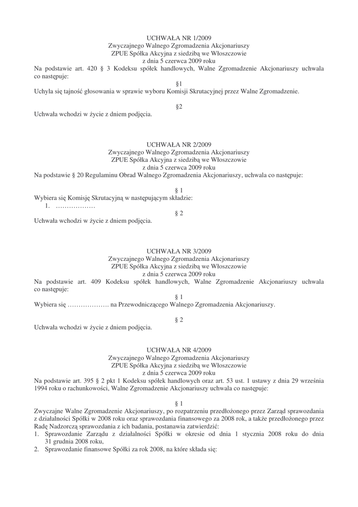 UCHWAŁA NR 1/2009 Zwyczajnego Walnego Zgromadzenia Akcjonariuszy ZPUE Spółka Akcyjna z siedzib we Włoszczowie z dnia 5 czerwca 2009 roku Na podstawie art. 420 § 3 Kodeksu spółek handlowych, Walne Zgromadzenie Akcjonariuszy uchwala co nast puje: §1 Uchyla si tajno głosowania w sprawie wyboru Komisji Skrutacyjnej przez Walne Zgromadzenie. Uchwała wchodzi w ycie z dniem podj cia. §2 UCHWAŁA NR 2/2009 Zwyczajnego Walnego Zgromadzenia Akcjonariuszy ZPUE Spółka Akcyjna z siedzib we Włoszczowie z dnia 5 czerwca 2009 roku Na podstawie § 20 Regulaminu Obrad Walnego Zgromadzenia Akcjonariuszy, uchwala co nast puje: §1 Wybiera si Komisj Skrutacyjn w nast puj cym składzie: 1. ……………… §2 Uchwała wchodzi w ycie z dniem podj cia. UCHWAŁA NR 3/2009 Zwyczajnego Walnego Zgromadzenia Akcjonariuszy ZPUE Spółka Akcyjna z siedzib we Włoszczowie z dnia 5 czerwca 2009 roku Na podstawie art. 409 Kodeksu spółek handlowych, Walne Zgromadzenie Akcjonariuszy uchwala co nast puje: §1 Wybiera si ………………. na Przewodnicz cego Walnego Zgromadzenia Akcjonariuszy. Uchwała wchodzi w ycie z dniem podj cia. §2 UCHWAŁA NR 4/2009 Zwyczajnego Walnego Zgromadzenia Akcjonariuszy ZPUE Spółka Akcyjna z siedzib we Włoszczowie z dnia 5 czerwca 2009 roku Na podstawie art. 395 § 2 pkt 1 Kodeksu spółek handlowych oraz art. 53 ust. 1 ustawy z dnia 29 wrze nia 1994 roku o rachunkowo ci, Walne Zgromadzenie Akcjonariuszy uchwala co nast puje: §1 Zwyczajne Walne Zgromadzenie Akcjonariuszy, po rozpatrzeniu przedło onego przez Zarz d sprawozdania z działalno ci Spółki w 2008 roku oraz sprawozdania finansowego za 2008 rok, a tak e przedło onego przez Rad Nadzorcz sprawozdania z ich badania, postanawia zatwierdzi : 1. Sprawozdanie Zarz du z działalno ci Spółki w okresie od dnia 1 stycznia 2008 roku do dnia 31 grudnia 2008 roku, 2. Sprawozdanie finansowe Spółki za rok 2008, na które składa si : a) bilans za okres od dnia 1 stycznia 2008 roku do dnia 31 grudnia 2008 roku, zamykaj cy si sum bilansow w wysoko ci 180.770.600,47 zł. (słownie: sto osiemdziesi t milionów siedemset siedemdziesi t tysi cy sze set złotych 47/100); b) rachunek zysków i strat za okres od dnia 1 stycznia 2008 roku do dnia 31 grudnia 2008 roku, wykazuj cy zysk netto w wysoko ci 12.246.701,44 zł. (słownie: dwana cie milionów dwie cie czterdzie ci sze tysi cy siedemset jeden złoty 44/100); c) zestawienie zmian w kapitale własnym. d) sprawozdanie z przepływu rodków pieni nych za okres od dnia 1 stycznia 2008 roku do dnia 31 grudnia 2008 roku, wykazuj ce zmniejszenie stanu rodków pieni nych w ci gu roku obrotowego 2008 o kwot 324.654,89 zł. (słownie: trzysta dwadzie cia cztery tysi ce sze set pi dziesi t cztery złote 89/100); e) informacja dodatkowa. §2 Uchwała wchodzi w ycie z dniem podj cia. UCHWAŁA NR 5/2009 Zwyczajnego Walnego Zgromadzenia Akcjonariuszy ZPUE Spółka Akcyjna z siedzib we Włoszczowie z dnia 5 czerwca 2009 roku Na podstawie art. 395 §2 pkt 2 Kodeksu spółek handlowych oraz § 8 ust.2 lit. „d” Statutu Spółki, Walne Zgromadzenie Akcjonariuszy uchwala co nast puje: §1 Walne Zgromadzenie Akcjonariuszy, po rozpatrzeniu i zatwierdzeniu przedło onego przez Zarz d Spółki sprawozdania finansowego za okres od dnia 1 stycznia 2008 roku do dnia 31 grudnia 2008 roku, postanawia wypracowany w 2008 roku zysk netto w wysoko ci 12.246.701,44 zł. (słownie: dwana cie milionów dwie cie czterdzie ci sze tysi cy siedemset jeden złoty 44/100) przeznaczy w cało ci na kapitał zapasowy. §2 Uchwała wchodzi w ycie z dniem podj cia. UCHWAŁA NR 6/2009 Zwyczajnego Walnego Zgromadzenia Akcjonariuszy ZPUE Spółka Akcyjna z siedzib we Włoszczowie z dnia 5 czerwca 2009 roku Na podstawie art. 395 § 2 pkt 3 Kodeksu spółek handlowych, Walne Zgromadzenie Akcjonariuszy postanawia: §1 Udzieli Panu Bogusławowi Wypychewiczowi absolutorium z wykonania przez niego obowi zków Prezesa Zarz du ZPUE S.A. w okresie od dnia 1 stycznia 2008 roku do dnia 31 lipca 2008 roku. §2 Uchwała wchodzi w ycie z dniem podj cia. UCHWAŁA NR 7/2009 Zwyczajnego Walnego Zgromadzenia Akcjonariuszy ZPUE Spółka Akcyjna z siedzib we Włoszczowie z dnia 5 czerwca 2009 roku Na podstawie art. 395 § 2 pkt 3 Kodeksu spółek handlowych, Walne Zgromadzenie Akcjonariuszy postanawia: §1 Udzieli Panu Ryszardowi Iwa czykowi absolutorium z wykonania przez niego obowi zków: − Członka Zarz du ZPUE S.A. w okresie od dnia 1 stycznia 2008 roku do dnia 30 wrze nia 2008 roku, − Prezesa Zarz du ZPUE S.A. w okresie od dnia 1 pa dziernika 2008 roku do dnia 31 grudnia 2008 roku. §2 Uchwała wchodzi w ycie z dniem podj cia. UCHWAŁA NR 8/2009 Zwyczajnego Walnego Zgromadzenia Akcjonariuszy ZPUE Spółka Akcyjna z siedzib we Włoszczowie z dnia 5 czerwca 2009 roku Na podstawie art. 395 § 2 pkt 3 Kodeksu spółek handlowych, Walne Zgromadzenie Akcjonariuszy postanawia: §1 Udzieli Panu Tomaszowi St pniowi absolutorium z wykonania przez niego obowi zków: − Członka Zarz du ZPUE S.A. w okresie od dnia 1 stycznia 2008 roku do dnia 30 wrze nia 2008 roku, − Wiceprezesa Zarz du ZPUE S.A. w okresie od dnia 1 pa dziernika 2008 roku do dnia 31 grudnia 2008 roku. §2 Uchwała wchodzi w ycie z dniem podj cia. UCHWAŁA NR 9/2009 Zwyczajnego Walnego Zgromadzenia Akcjonariuszy ZPUE Spółka Akcyjna z siedzib we Włoszczowie z dnia 5 czerwca 2009 roku Na podstawie art. 395 § 2 pkt 3 Kodeksu spółek handlowych, Walne Zgromadzenie Akcjonariuszy postanawia: §1 Udzieli Panu Krzysztofowi Jamrozowi absolutorium z wykonania przez niego obowi zków Członka Zarz du ZPUE S.A. w okresie od dnia 1 pa dziernika 2008 roku do dnia 31 grudnia 2008 roku. §2 Uchwała wchodzi w ycie z dniem podj cia. UCHWAŁA NR 10/2009 Zwyczajnego Walnego Zgromadzenia Akcjonariuszy ZPUE Spółka Akcyjna z siedzib we Włoszczowie z dnia 5 czerwca 2009 roku Na podstawie art. 395 § 2 pkt 3 Kodeksu spółek handlowych, Walne Zgromadzenie Akcjonariuszy postanawia: §1 Ud