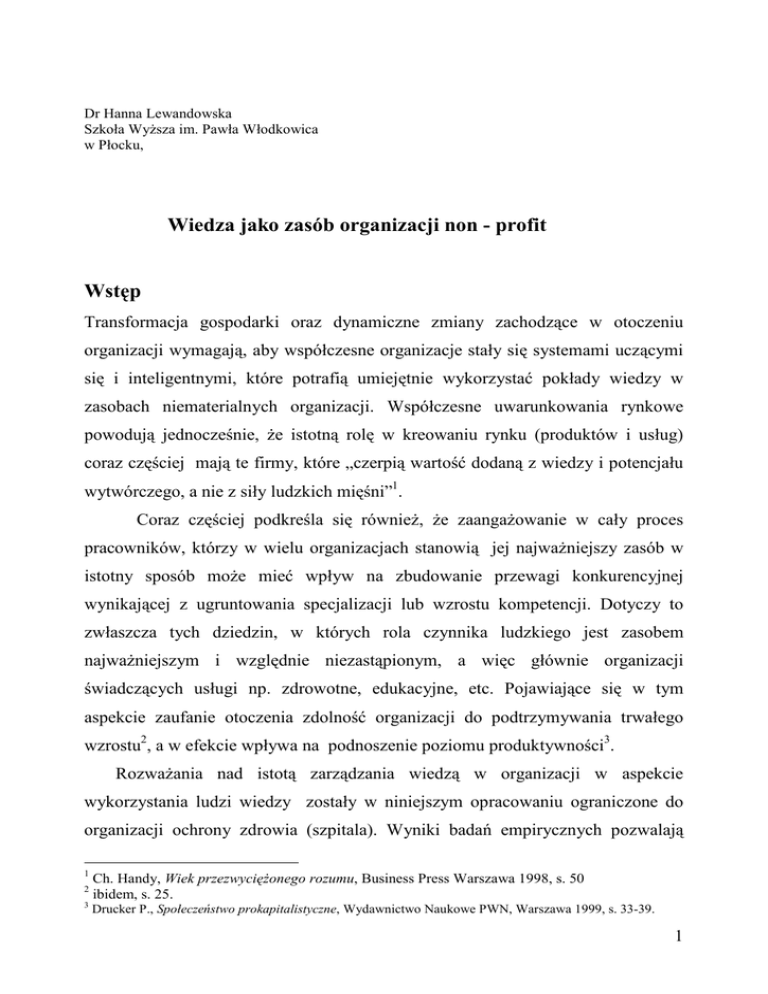 Dr Hanna Lewandowska Szkoła WyŜsza im. Pawła Włodkowica w Płocku, Wiedza jako zasób organizacji non - profit Wstęp Transformacja gospodarki oraz dynamiczne zmiany zachodzące w otoczeniu organizacji wymagają, aby współczesne organizacje stały się systemami uczącymi się i inteligentnymi, które potrafią umiejętnie wykorzystać pokłady wiedzy w zasobach niematerialnych organizacji. Współczesne uwarunkowania rynkowe powodują jednocześnie, Ŝe istotną rolę w kreowaniu rynku (produktów i usług) coraz częściej mają te firmy, które „czerpią wartość dodaną z wiedzy i potencjału wytwórczego, a nie z siły ludzkich mięśni”1. Coraz częściej podkreśla się równieŜ, Ŝe zaangaŜowanie w cały proces pracowników, którzy w wielu organizacjach stanowią jej najwaŜniejszy zasób w istotny sposób moŜe mieć wpływ na zbudowanie przewagi konkurencyjnej wynikającej z ugruntowania specjalizacji lub wzrostu kompetencji. Dotyczy to zwłaszcza tych dziedzin, w których rola czynnika ludzkiego jest zasobem najwaŜniejszym i względnie niezastąpionym, a więc głównie organizacji świadczących usługi np. zdrowotne, edukacyjne, etc. Pojawiające się w tym aspekcie zaufanie otoczenia zdolność organizacji do podtrzymywania trwałego wzrostu2, a w efekcie wpływa na podnoszenie poziomu produktywności3. RozwaŜania nad istotą zarządzania wiedzą w organizacji w aspekcie wykorzystania ludzi wiedzy zostały w niniejszym opracowaniu ograniczone do organizacji ochrony zdrowia (szpitala). Wyniki badań empirycznych pozwalają 1 2 3 Ch. Handy, Wiek przezwycięŜonego rozumu, Business Press Warszawa 1998, s. 50 ibidem, s. 25. Drucker P., Społeczeństwo prokapitalistyczne, Wydawnictwo Naukowe PWN, Warszawa 1999, s. 33-39. 1 jednocześnie odpowiedzieć na pytanie, jak informacje związane z budową kompetencji organizacji w oparciu o ludzi wiedzy wpływają na wzrost zaufania interesariuszy (pacjentów) oraz jak dystrybucja informacji wpływa na postrzeganie organizacji przez otoczenie. Wiedza i wybrane aspekty zarządzanie wiedzą w organizacji. Wiedza tworząc niematerialne wartości dla wielu firm stanowi jeden z najwaŜniejszych jej elementów, poniewaŜ posiadana przez pracodawcę lub pracownika decyduje często o funkcjonowaniu i rozwoju organizacji. W kontekście tym wiedzę moŜna podzielić na wiedzę wykorzystywaną, posiadaną, niewykorzystaną i poŜądaną, wiedzę indywidualną i zespołową, wiedzę metodyczną i techniczną, wiedzę strategiczną i operacyjną, wiedzę jawną i ukrytą. W pierwszym przypadku wiedza moŜe być zastosowana w róŜnych sytuacjach (np. do nawiązywania kontaktów i do negocjacji). Wiedza ta jest potrzebna i poŜądana, choć nie zawsze zdajemy sobie z tego sprawę. Wiedza jednostek (indywidualna) jest ściśle powiązana z wiedzą całej organizacji (zespołową), stanowiąc tym samym składową wiedzy zbiorowej. Podobnie jest z wiedzą metodyczną i techniczną, z tym, Ŝe pierwsza odnosi się do sfery zarządzania (wiedza ogólna o zarządzaniu i wiedza ukierunkowana na zarządzanie), zaś druga do sfery działalności podstawowej tj. produkcji lub świadczenia usług (wiedza o technikach i technologii wytwarzania dóbr materialnych i niematerialnych). Wiedza jawna i ukryta związana jest z doświadczeniem i intuicją, natomiast podział wiedzy na strategiczną i operacyjną wymaga od organizacji uczenia się na zasadzie podwójnej pętli, czyli kwestionowania dotychczas przyjętych załoŜeń w wyniku uaktualniania się informacji zewnętrznych i wewnętrznych4, które są waŜnym elementem zarządzania wiedzą. Na wiedzę składają się równieŜ określone potrzeby 4 Kotarba M., Kotarba W., Model zarządzania wiedzą [w:] Ekonomika i organizacja przedsiębiorstw, Instytut Organizacji i Zarządzania w Przemyśle „ORGMASZ”, sierpień 2003, nr 8 (643), s. 17. 2 informacyjne, ich pozyskiwanie, porządkowanie i przechowywanie oraz dystrybuowanie do otoczenia5. Według kryterium waŜności wiedzy dla procesów wewnętrznych organizacji moŜna wyodrębnić wiedzę podstawową, czyli elementarny poziom wiedzy dla codziennej działalności przedsiębiorstwa, wiedzę zaawansowaną umoŜliwiającą konkurowanie pomiędzy firmami oraz wiedzę innowacyjną pozwalającą na zajęcie i utrzymanie znaczącego miejsca wśród wszystkich organizacji o takim samym profilu działalności. Wymaga to jednak podjęcia przez organizację takich działań jak: pozyskiwanie i dostarczenie wiedzy niezbędnej dla przedsiębiorstwa (i pracowników oraz stworzenia warunków do jej absorpcji. Niezwykle waŜna jest wiedza nie tylko pozyskiwana na bieŜąco, ale wiedza juŜ istniejąca (uświadomiona i nieuświadomiona) przejawiająca się w kompetencjach pracowników. Organizacja, chcąc przyswajać wiedzę i później z niej korzystać musi jednak stworzyć warunki do realizacji przyjętej strategii w taki sposób, aby pracownicy mieli wpływ na produkcję lub proces świadczenia usług. Motywowanie w ten sposób będzie miało wpływ nie tylko na ich rozwój intelektualny, ale wymusi równieŜ współpracę i konieczność przyswajania wiedzy przez innych uczestników organizacji. Organizacja osiąga sukcesy równieŜ wtedy, gdy potrafi wykorzystywać pokłady wiedzy w otoczeniu firmy oraz w odniesieniu do prowadzonej produkcji lub świadczonych usług. Procesy decyzyjne w organizacji wymagają więc usystematyzowania i uporządkowania zgromadzonych i posiadanych informacji dotyczących organizacji i jej otoczenia. 5 R.B.Mellor, G. Coulton, A.Chick, A.Bifuco i in., Entrepreneurship for Everyone. A Student Textbook, SAGE Publications of London, Thousand Oaks, New Delhi and Singapore, 2009, s.125 3 Identyfikacja Badanie przydatności ocena potrzeb adresowanie pozyskiwanie przetwarzanie wykorzystanie Rysunek 1. Powiązanie podstawowych elementów zarządzania wiedzą Źródło: Kotarba M., Kotarba W., Model zarządzania wiedzą [w:] Ekonomika