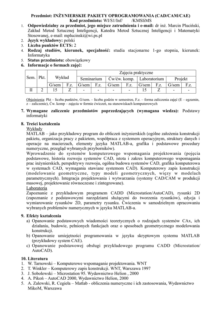 1. 2. 3. 4. 5. 6. Przedmiot: INŻYNIERSKIE PAKIETY OPROGRAMOWANIA (CAD/CAM/CAE) Kod przedmiotu: WI/S1/Inf/ /KMSIiMS Odpowiedzialny za przedmiot, jego miejsce zatrudnienia i e-mail: dr inż. Marcin Pluciński, Zakład Metod Sztucznej Inteligencji, Katedra Metod Sztucznej Inteligencji i Matematyki Stosowanej, e-mail: [email protected] Język wykładowy: polski Liczba punktów ECTS: 2 Rodzaj studiów, kierunek, specjalność: studia stacjonarne 1-go stopnia, kierunek: Informatyka Status przedmiotu: obowiązkowy Informacje o formach zajęć: Sem. Pkt. II 2 Wykład G/sem 15 F.z. Z Seminarium G/sem F.z. - Zajęcia praktyczne Ćw/ćw. komp. Laboratorium Projekt G/sem F.z. G/sem F.z. G/sem F.z. 15 Z - Objaśnienia: Pkt – liczba punktów, G/sem. – liczba godzin w semestrze, F.z. – forma zaliczenia zajęć (E – egzamin, z – zaliczenie), Ćw. komp – zajęcia w formie ćwiczeń, na stanowiskach komputerowych 7. Wymagane zaliczenie przedmiotów poprzedzających (wymagana wiedza): Podstawy informatyki 8. Treści kształcenia Wykłady MATLAB – jako przykładowy program do obliczeń inżynierskich (ogólne założenia konstrukcji pakietu, organizacja pracy z pakietem, współpraca z systemem operacyjnym, struktury danych i operacje na macierzach, elementy języka MATLAB-a, grafika i podstawowe procedury numeryczne, przegląd wybranych przyborników). Wprowadzenie do systemów komputerowego wspomagania projektowania (pojęcia podstawowe, historia rozwoju systemów CAD, istota i zakres komputerowego wspomagania prac inżynierskich, perspektywy rozwoju, ogólna budowa systemów CAD, grafika komputerowa w systemach CAD, wymagania stawiane systemom CAD). Komputerowy zapis konstrukcji (modelowanie geometryczne, typy modeli geometrycznych, więzy w modelach parametrycznych). Integracja projektowania i wytwarzania (systemy CAD/CAM w produkcji masowej, projektowanie równoczesne i zintegrowane). Laboratoria Zapoznanie z przykładowym programem CADD (Microstation/AutoCAD), rysunki 2D (zapoznanie z podstawowymi narzędziami służącymi do tworzenia rysunków), edycja i wymiarowanie rysunków 2D, parametry rysunku. Ćwiczenia w samodzielnym opracowaniu wybranych problemów numerycznych w języku MATLAB-a. 9. Efekty kształcenia a) Opanowanie podstawowych wiadomości teoretycznych o rodzajach systemów CAx, ich działaniu, budowie, pełnionych funkcjach oraz o sposobach geometrycznego modelowania konstrukcji. b) Opanowanie umiejętności programowania w języku skryptowym systemu MATLAB (przykładowy system CAE). c) Opanowanie podstawowej obsługi przykładowego programu CADD (Microstation/ AutoCAD). 10. Literatura 1. W. Tarnowski – Komputerowe wspomaganie projektowania. WNT 2. T. Winkler – Komputerowy zapis konstrukcji. WNT, Warszawa 1997 3. J. Sobolewski – Microstation 95. Wydawnictwo Helion , 2000 4. A. Pikoń – AutoCAD 2000, Wydawnictwo Helion, 2000 5. A. Zalewski, R. Cegieła – Matlab - obliczenia numeryczne i ich zastosowania, Wydawnictwo MikoM, Warszawa