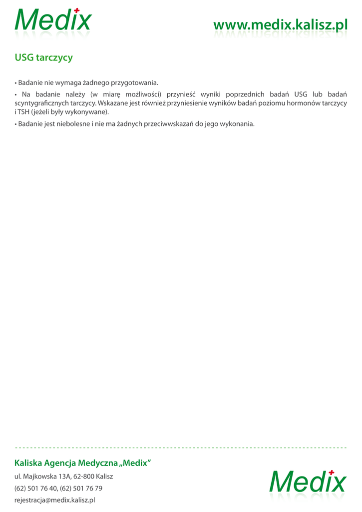 www.medix.kalisz.pl USG tarczycy • Badanie nie wymaga żadnego przygotowania. • Na badanie należy (w miarę możliwości) przynieść wyniki poprzednich badań USG lub badań scyntygraficznych tarczycy. Wskazane jest również przyniesienie wyników badań poziomu hormonów tarczycy i TSH (jeżeli były wykonywane). • Badanie jest niebolesne i nie ma żadnych przeciwwskazań do jego wykonania. ---------------------------------------------------------------------------------------- Kaliska Agencja Medyczna „Medix” ul. Majkowska 13A, 62-800 Kalisz (62) 501 76 40, (62) 501 76 79 [email protected]