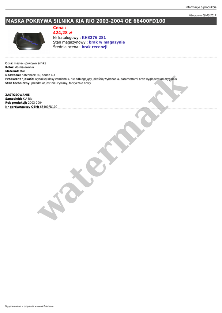 Informacje o produkcie Utworzono 09-03-2017 MASKA POKRYWA SILNIKA KIA RIO 2003-2004 OE 66400FD100 Cena : 424,28 zł Nr katalogowy : KH3276 281 Stan magazynowy : brak w magazynie Średnia ocena : brak recenzji w at ZASTOSOWANIE Samochód: KIA Rio Rok produkcji: 2003-2004 Nr porównawczy OEM: 66400FD100 er m ar k Opis: maska - pokrywa silnika Kolor: do malowania Materiał: stal Nadwozie: hatchback 5D, sedan 4D Producent / jakość: wysokiej klasy zamiennik, nie odbiegający jakością wykonania, parametrami oraz wyglądem od oryginału Stan techniczny: przedmiot jest nieużywany, fabrycznie nowy Wygenerowano w programie www.oscGold.com