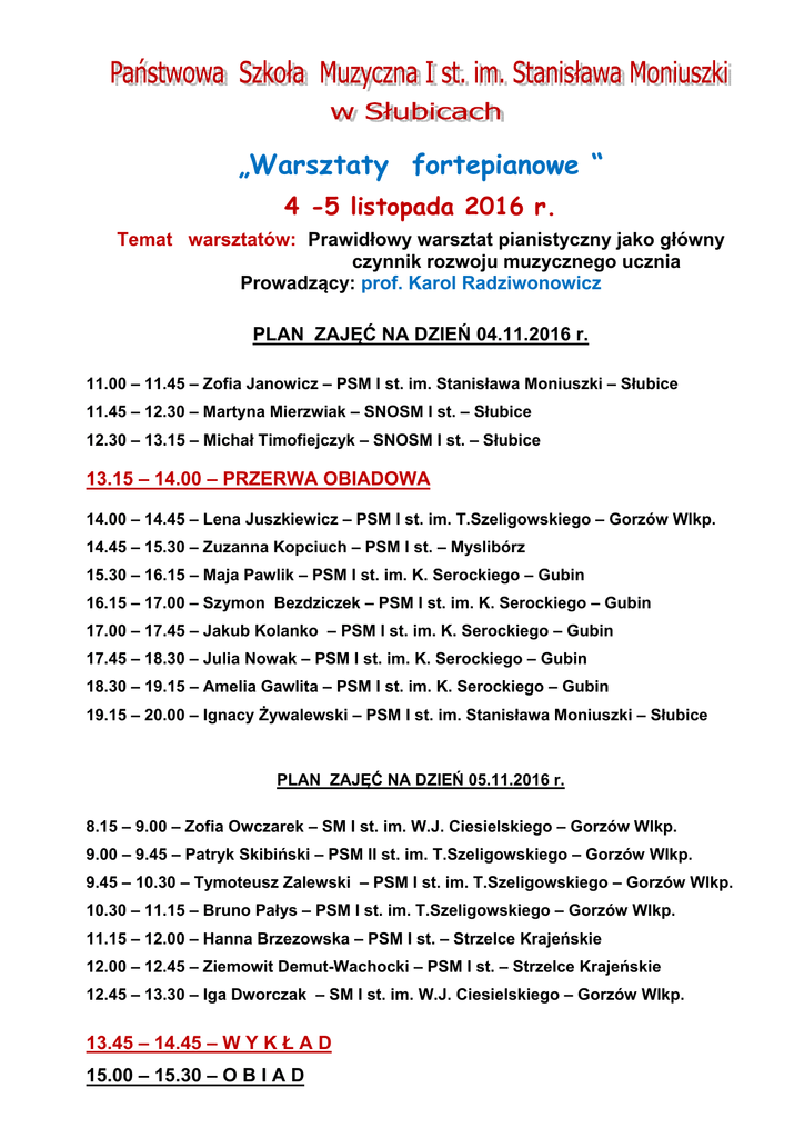 „Warsztaty fortepianowe “ 4 -5 listopada 2016 r. Temat warsztatów: Prawidłowy warsztat pianistyczny jako główny czynnik rozwoju muzycznego ucznia Prowadzący: prof. Karol Radziwonowicz PLAN ZAJĘĆ NA DZIEŃ 04.11.2016 r. 11.00 – 11.45 – Zofia Janowicz – PSM I st. im. Stanisława Moniuszki – Słubice 11.45 – 12.30 – Martyna Mierzwiak – SNOSM I st. – Słubice 12.30 – 13.15 – Michał Timofiejczyk – SNOSM I st. – Słubice 13.15 – 14.00 – PRZERWA OBIADOWA 14.00 – 14.45 – Lena Juszkiewicz – PSM I st. im. T.Szeligowskiego – Gorzów Wlkp. 14.45 – 15.30 – Zuzanna Kopciuch – PSM I st. – Myslibórz 15.30 – 16.15 – Maja Pawlik – PSM I st. im. K. Serockiego – Gubin 16.15 – 17.00 – Szymon Bezdziczek – PSM I st. im. K. Serockiego – Gubin 17.00 – 17.45 – Jakub Kolanko – PSM I st. im. K. Serockiego – Gubin 17.45 – 18.30 – Julia Nowak – PSM I st. im. K. Serockiego – Gubin 18.30 – 19.15 – Amelia Gawlita – PSM I st. im. K. Serockiego – Gubin 19.15 – 20.00 – Ignacy Żywalewski – PSM I st. im. Stanisława Moniuszki – Słubice PLAN ZAJĘĆ NA DZIEŃ 05.11.2016 r. 8.15 – 9.00 – Zofia Owczarek – SM I st. im. W.J. Ciesielskiego – Gorzów Wlkp. 9.00 – 9.45 – Patryk Skibiński – PSM II st. im. T.Szeligowskiego – Gorzów Wlkp. 9.45 – 10.30 – Tymoteusz Zalewski – PSM I st. im. T.Szeligowskiego – Gorzów Wlkp. 10.30 – 11.15 – Bruno Pałys – PSM I st. im. T.Szeligowskiego – Gorzów Wlkp. 11.15 – 12.00 – Hanna Brzezowska – PSM I st. – Strzelce Krajeńskie 12.00 – 12.45 – Ziemowit Demut-Wachocki – PSM I st. – Strzelce Krajeńskie 12.45 – 13.30 – Iga Dworczak – SM I st. im. W.J. Ciesielskiego – Gorzów Wlkp. 13.45 – 14.45 – W Y K Ł A D 15.00 – 15.30 – O B I A D