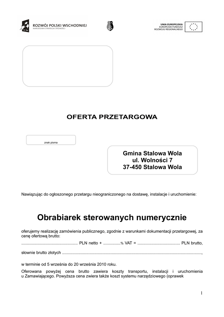 OFERTA PRZETARGOWA znak pisma Gmina Stalowa Wola ul. Wolności 7 37-450 Stalowa Wola Nawiązując do ogłoszonego przetargu nieograniczonego na dostawę, instalacje i uruchomienie: Obrabiarek sterowanych numerycznie oferujemy realizację zamówienia publicznego, zgodnie z warunkami dokumentacji przetargowej, za cenę ofertową brutto: ................................................. PLN netto + ...............% VAT = ..................................... PLN brutto, słownie brutto złotych ........................................................................................................................., w terminie od 5 września do 20 września 2010 roku. Oferowana powyżej cena brutto zawiera koszty transportu, instalacji i uruchomienia u Zamawiającego. Powyższa cena zwiera także koszt systemu narzędziowego (oprawek 1 narzędziowych) oraz systemu CAM (oprogramowanie CAM i sprzęt komputerowy). Oświadczamy, że oferowane obrabiarki oraz pozostałe wyposażenie spełniają wszystkie minimalne wymagania zdefiniowane w Specyfikacji Technicznej. A.1. Parametry techniczne TOKARKI UCHWYTOWEJ Do dostawy oferujemy obrabiarkę1...................................................................................................... posiadającą poniższe parametry techniczne: PODSTAWOWE WYMAGANIA TECHNICZNE Lp. Nazwa parametru 1 2 Wielkość parametru żądana 3 Wielkość parametru oferowana2 4 Przestrzeń robocza 1. Maksymalna średnica toczenia min. 350 mm 2. Maksymalna średnica przelotu nad łożem min. 600 mm 3. Maksymalna długość toczenia min. 500 mm Wrzeciono 4. Średnica uchwytu hydraulicznego, trójszczękowego min. 200 mm 5. Maksymalna średnica obróbki z pręta min. 50 mm 6. Prędkość obrotowa 7. Moc napędu głównego min. 4.000 obr./min min. 22 kW Przeciw-wrzeciono 8. Średnica uchwytu hydraulicznego, trójszczękowego 9. Prędkość obrotowa 10. Moc napędu przeciw-wrzeciona min. 150 mm min. 5.000 obr./min min. 6 kW Głowica narzędziowa 11. Liczba głowic narzędziowych min. 1 12. Liczba stacji narzędziowych w głowicy min. 12 13. Liczba stacji narzędziowych z napędem narzędzi obrotowych min. 6 14. Prędkość obrotowa napędu narzędzi obrotowych 15. Moc napędu narzędzi obrotowych min. 4.000 obr./min min. 5 kW Przejazdy robocze 16. 1 2 Przejazd w osi X min. 200 mm Należy podać nazwę, typ, model urządzenia. Dostawca ma obowiązek wypełnić wszystkie pola kolumny 4. Brak spełnienie któregokolwiek z wymaganych parametrów lub brak wpisu informującego o oferowanych parametrach powoduje odrzucenie oferty. 2 1 17. Przejazd w osi Z Wielkość parametru żądana 3 min. 500 mm 18. Przejazd w osi Y min. 100 mm 19. Przejazd w osi B min. 500 mm Lp. Nazwa parametru 2 Wielkość parametru oferowana 4 Sterowanie CNC 20. System sterowania 21. Menu - interfejs użytkownika 22. Ilość sterowanych osi 23. Wejście/wyjście danych Heidenhain, Fanuc, Sienumerik, lub inne3 język polski 4 USB, LAN Oprócz powyższych parametrów, oferowana tokarka spełnia poniższe wymagania (posiada wyposażenie) dodatkowe: WYMAGANIA DODATKOWE 3 4 Lp. Nazwa Opis wymagania żądany Opis wymagania oferowany4 1 2 3 4 1. Wyrzutnik wiór do pojemników zewnętrznych Tak 2. Całkowicie zabudowana przestrzeń robocza Tak 3. Automatyczny pomiar narzędzia Tak 4. Instalacja oświetleniowa przestrzeni roboczej. Tak 5. Odciąg mgły olejowej z przestrzeni roboczej Tak 6. Zestaw szczęk twardych uniwersalnych (1 kpl.) i miękkich (1 kpl.) do uchwytu hydraulicznego na wrzecionie Tak 7. Zestaw szczęk twardych uniwersalnych (1 kpl.) i miękkich (1 kpl.) do uchwytu hydraulicznego naprzeciw-wrzecionie Tak System sterowania musi być jednakowy dla wszystkich maszyn stanowiących przedmiot przetargu. Dostawca ma obowiązek wypełnić wszystkie pola kolumny 4. Brak spełnienie któregokolwiek z wymaganych parametrów lub brak wpisu informującego o oferowanych parametrach powoduje odrzucenie oferty. 3 Lp. Nazwa Opis wymagania żądany Opis wymagania oferowany 1 2 3 4 8. Szkolenie personelu w zakresie programowania oferowanej obrabiarki oraz obsługi maszyny, w szczególności sond pomiarowych (dla min. 2 osób). Tak 9. Instrukcja obsługi i dokumentacja techniczna w języku polskim. Tak 10. Zestaw oprawek narzędziowych wg poniższego wykazu Tak Oprawka do toczenia, 25×25×150 mm (normalna) 6 szt. Oprawka do toczenia, 25×25×150 mm (odwrotna) 2 szt. Oprawka do toczenia podwójna 25×25×150 3 szt. Oprawka do wytaczaka podwójna d=25 mm 2 szt. Oprawka do planowania 25×25×150 mm 3 szt. Oprawka do odcinaka 1 szt. Oprawka do wytaczaka d = 40 mm 4 szt. Tulejka do wytaczaka Ø 25 mm 3 szt. Tulejka do wytaczaka Ø 32 mm 3 szt. Tulejka do stożka MK2 1 szt. Oprawka w osi X do wiercenia lub frezowania 1 szt. Oprawka w osi Z do wiercenia lub frezowania 2 szt. Tulejka zaciskowa Ø 12 2 szt. Tulejka zaciskowa Ø 16 2 szt. Tulejka zaciskowa Ø 8 2 szt. Tulejka zaciskowa Ø 10 2 szt. 4 Lp. Nazwa Opis wymagania żądany Opis wymagania oferowany 1 2 3 4 Tulejka zaciskowa Ø 20 1 szt. Oprawka w osi X do frezowania Ø 50 1 szt. Tulejka do wytaczaka Ø 16 mm 2 szt. Tulejka do wytaczaka Ø 20 mm 2 szt. Tulejka do wytaczaka Ø 16 mm 1 szt. Tulejka do wytaczaka Ø20 mm 1 szt. A.2. Parametry techniczne CENTRUM TOKARSKO – FREZARSKIEGO Do dostawy oferujemy obrabiarkę5...................................................................................................... posiadającą poniższe parametry techniczne: PODSTAWOWE WYMAGANIA TECHNICZNE Lp. Nazwa parametru 1 Wielkość parametru żądana Wielkość parametru oferowana6 3 4 2 Przestrzeń robocza 1. Maksymalna średnica toczenia min. 600 mm 2. Maksymalna średnica przelotu nad łożem min. 600 mm 3. Maksymalna długość toczenia min. 1.250 mm Wrzeciono 4. Średnica uchwytu hydraulicznego, trójszczękowego 5. Prędkość obrotowa 6. Moc napędu głównego min. 250 mm min. 4.000 obr./min min. 25 kW Dodatkowa głowica frezarska 5 6 7. Prędkość obrotowa wrzeciona 