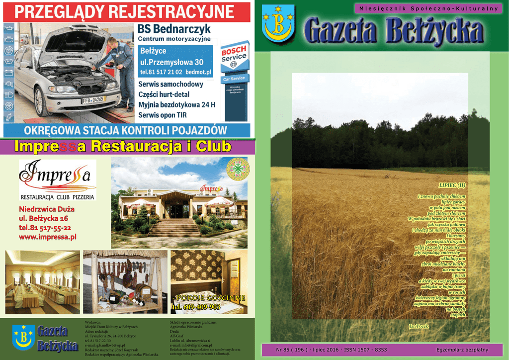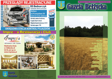 Miesięcznik Społeczno-Kulturalny Impressa Restauracja i Club Niedrzwica Duża ul. Bełżycka 16 tel.81 517-55-22 www.impressa.pl - Pokoje gościnne tel. 609-409-903 Wydawca: Miejski Dom Kultury w Bełżycach Adres redakcji: ul. Tysiąclecia 26, 24-200 Bełżyce tel. 81 517-22-30 e-mail: [email protected] Redaktor naczelny: Józef Kasprzak Redaktor współpracujący: Agnieszka Winiarska Skład i opracowanie graficzne: Agnieszka Winiarska Druk: Alf-Graf Lublin ul. Abramowicka 6 e-mail: [email protected] Redakcja nie zwraca tekstów nie zamówionych oraz zastrzega sobie prawo skracania i adiustacji. LIPIEC (II) i znowu pachnie chlebem lipiec gorący w polu pod niebem pod złotym słońcem W południu brązowi się i złoci jak szyszka jodłowa i chodzą za nim białe obłoki i kurzawy po wiejskich drogach wilgi pszczoły i pszenice — gdy zapadają zmierzchy — wkładają mu zbroi miedziane blachy na ramiona i piersi a kiedy w swej wędrówce zabłądzi w bujne trawy w rosach świerszczy legion ogromny zapina mu srebrne sandały na bosych stopach Jan Pocek Nr 85 ( 196 ) · lipiec 2016 · ISSN 1507 - 8353 Egzemplarz bezpłatny TURNIEJ SOŁECTW 2016 . Zawody wedkarskie z okazji Dni Bełzyc , Foto: Agnieszka Winiarska, Małgorzata Wiślińska, czyt. str.9 Foto: Agnieszka Winiarska, czyt. str.15 1 Gazeta Bełżycka Rada Miejska uchwaliła Uchwała Nr XXIII/137/2016 Rady Miejskiej w Bełżycach z dnia 29 czerwca 2016 roku. W sprawie wyrażenia zgody na ustanowienie służebności gruntowej na nieruchomości będącej własnością Gminy Bełżyce. Wyraża się zgodę na ustanowienie służebności gruntowej na nieruchomości stanowiącej własność Gminy Bełżyce, oznaczonej w ewidencji gruntów jako działka Nr 291/2 o pow. 0,0033 ha, obrębu 4 Bełżyce Centrum. nalnymi uiszcza się miesięcznie, z dołu, bez wezwania, w terminie do 10 dnia miesiąca następującego po miesiącu, w którym powstał obowiązek ponoszenia opłaty. Opłata za gospodarowanie odpadami komunalnymi uiszczana jest w gotówce w kasie Urzędu Miejskiego w Bełżycach lub przelewem na rachunek bankowy Urzędu Miejskiego w Bełżycach, dostępny na stronie Urzędu Miejskiego w Bełżycach: www.belzyce.pl Uchwała Nr XXIII/136/2016 Rady Miejskiej w Bełżycach z dnia 29 czerwca 2016 roku. W sprawie wyrażenia zgody na ustanowienie służebności gruntowej na nieruchomości będącej własnością Gminy Bełżyce. Wyraża się zgodę na ustanowienie służebności gruntowej na nieruchomości stanowiącej własność Gminy Bełżyce, oznaczonej w ewidencji gruntów jako działka Nr 203/2 o pow. 0,0212 ha, obrębu 4 Bełżyce Centrum. Uchwała Nr XXIII/132/2016 Rady Miejskiej w Bełżycach z dnia 29 czerwca 2016 roku w sprawie określenia szczegółowego sposobu i zakresu świadczenia usług w zakresie odbierania odpadów komunalnych od właścicieli nieruchomości i zagospodarowania tych odpadów. Określa się szczegółowy sposób i zakres świadczenia usług odbierania odpadów komunalnych od właścicieli nieruchomosci oraz zagospodarowania tych odpadów, w zamian za uiszczoną opłatę przez właścicieli nieruchomości, a w szczególności: 1. rodzaje i ilość odpadów komunalnych odbieranych od właścicieli nieruchomości; 2. częstotliwość odbierania odpadów; 3. sposób świadczenia usług przez punkty selektywnego zbierania odpadów komunalnych; 4. tryb oraz sposób zgłaszania przez właścicieli nieruchomości przypadków niewłaściwego świadczenia usług przez przedsiębiorcę odbierającego odpady komunalne od właścicieli nieruchomości lub przez prowadzącego punkt selektywnego zbierania odpadów komunalnych. Usługa odbioru odpadów komunalnych realizowana będzie na zasadach określonych w Regulaminie utrzymania czystości i porządku na terenie Gminy Bełżyce. Ustala się, że w zamian za uiszczoną opłatę, odbierane będą w każdej ilości, bezpośrednio od właścicieli nieruchomości zamieszkałych, zgodnie z obowiązującym harmonogramem, następujące frakcje odpadów: a) zmieszane odpady komunalne zbierane jako frakcja mokra, b) selektywnie zebrane odpady komunalne (tj. papier i tektura, metale, tworzywa sztuczne, opakowania wielomateriałowe) zbierane jako frakcja sucha, c) selektywnie zbierane odpady - szkło opakowaniowe, d) selektywnie zbierane odpady zielone, e) selektywnie zbierane odpady wielkogabarytowe, f) zużyty sprzęt elektryczny i elektroniczny. Odpady posegregowane niezgodnie z zasadami określonymi w Regulaminie traktowane będą jako odpady zmieszane natomiast odpady zgromadzone w pojemnikach niespełniających wymogów Regulaminu nie będą odbierane. Uchwała Nr XXIII/135/2016 Rady Miejskiej w Bełżycach z dnia 29 czerwca 2016 roku. W sprawie wyrażenia zgody na ustanowienie służebności przesyłu na nieruchomości będącej własnością Gminy Bełżyce. Wyraża się zgodę na ustanowienie służebności przesyłu na nieruchomości stanowiącej własność Gminy Bełżyce, oznaczonej w ewidencji gruntów jako działka Nr 900/4 o pow. 0,0402 ha, obrębu 1 Bełżyce Rolne. Uchwała Nr XXIII/134/2016 Rady Miejskiej w Bełżycach z dnia 29 czerwca 2016 roku. W sprawie zmiany uchwały Nr XXI/116/2016 Rady Miejskiej w Bełżycach z dnia 20 kwietnia 2016 roku w sprawie wyrażenia zgody na nabycie nieruchomości gruntowej niezabudowanej na rzecz Gminy Bełżyce do gminnego zasobu nieruchomości. W Uchwale nr XXI/116/16 Rady Miejskiej w Bełżycach z dnia 20 kwietnia 2016 roku w sprawie wyrażenia zgody na nabycie nieruchomości gruntowej niezabudowanej na rzecz Gminy Bełżyce do gminnego zasobu nieruchomości, wprowadza się następującą zmianę: - par.1 otrzymuje brzmienie: "Wyraża się zgodę na nabycie nieruchomości gruntowej na rzecz Gminy Bełżyce oznaczonej w ewidencji gruntów i budynków obrębu geodezyjnego 1 Bełżyce Rolne, jako działka Nr 901/2 o pow. 0,1531 ha." Uchwała Nr XXIII/133/2016 Rady Miejskiej w Bełżycach z dnia 29 czerwca 2016 roku. W s