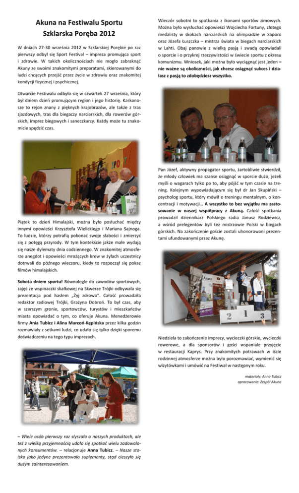 Akuna na Festiwalu Sportu Szklarska Poręba 2012 W dniach 27-30 września 2012 w Szklarskiej Porębie po raz pierwszy odbył się Sport Festival – impreza promująca sport i zdrowie. W takich okolicznościach nie mogło zabraknąć Akuny ze swoimi znakomitymi preparatami, skierowanymi do ludzi chcących przejść przez życie w zdrowiu oraz znakomitej kondycji fizycznej i psychicznej. Wieczór sobotni to spotkania z ikonami sportów zimowych. Można było wysłuchać opowieści Wojciecha Fortuny, złotego medalisty w skokach narciarskich na olimpiadzie w Saporo oraz Józefa Łuszczka – mistrza świata w biegach narciarskich w Lahti. Obaj panowie z wielką pasją i swadą opowiadali o sporcie i o przykrej rzeczywistości w świecie sportu z okresu komunizmu. Wniosek, jaki można było wyciągnąć jest jeden – nie ważne są okoliczności, jak chcesz osiągnąć sukces i działasz z pasją to zdobędziesz wszystko. Otwarcie Festiwalu odbyło się w czwartek 27 września, który był dniem dzień promującym region i jego historię. Karkonosze to rejon znany z pięknych krajobrazów, ale także z tras zjazdowych, tras dla biegaczy narciarskich, dla rowerów górskich, imprez biegowych i saneczkarzy. Każdy może tu znakomicie spędzić czas. Piątek to dzień Himalajski, można było posłuchać między innymi opowieści Krzysztofa Wielickiego i Mariana Sajnoga. To ludzie, którzy potrafią pokonać swoje słabości i zmierzyć się z potęgą przyrody. W tym kontekście jakże małe wydają się nasze dylematy dnia codziennego. W znakomitej atmosferze anegdot i opowieści mrożących krew w żyłach uczestnicy dotrwali do późnego wieczoru, kiedy to rozpoczął się pokaz filmów himalajskich. Sobota dniem sportu! Równolegle do zawodów sportowych, zajęć ze wspinaczki skałkowej na Skwerze Trójki odbywała się prezentacja pod hasłem „Żyj zdrowo”. Całość prowadziła redaktor radiowej Trójki, Grażyna Dobroń. To był czas, aby w szerszym gronie, sportowców, turystów i mieszkańców miasta opowiadać o tym, co oferuje Akuna. Menedżerowie firmy Ania Tubicz i Alina Marcoń-Kępińska przez kilka godzin rozmawiały z setkami ludzi, co udało się tylko dzięki sporemu doświadczeniu na tego typu imprezach. Pan Józef, aktywny propagator sportu, żartobliwie stwierdził, że młody człowiek ma szanse osiągnąć w sporcie dużo, jeżeli myśli o wagarach tylko po to, aby pójść w tym czasie na trening. Kolejnym wypowiadającym się był dr Jan Skupiński – psycholog sportu, który mówił o treningu mentalnym, o koncentracji i motywacji… A wszystko to bez wyjątku ma zastosowanie w naszej współpracy z Akuną. Całość spotkania prowadził dziennikarz Polskiego radia Janusz Rodziewicz, a wśród prelegentów byli tez mistrzowie Polski w biegach górskich. Na zakończenie goście zostali uhonorowani prezentami ufundowanymi przez Akunę. Niedziela to zakończenie imprezy, wycieczki górskie, wycieczki rowerowe, a dla sponsorów i gości wspaniale przyjęcie w restauracji Kaprys. Przy znakomitych potrawach w iście rodzinnej atmosferze można było porozmawiać, wymienić się wizytówkami i umówić na Festiwal w następnym roku. materiały: Anna Tubicz opracowanie: Zespół Akuna – Wiele osób pierwszy raz słyszało o naszych produktach, ale też z wielką przyjemnością udało się spotkać wielu zadowolonych konsumentów. – relacjonuje Anna Tubicz. – Nasze stoisko jako jedyne prezentowało suplementy, stąd cieszyło się dużym zainteresowaniem.