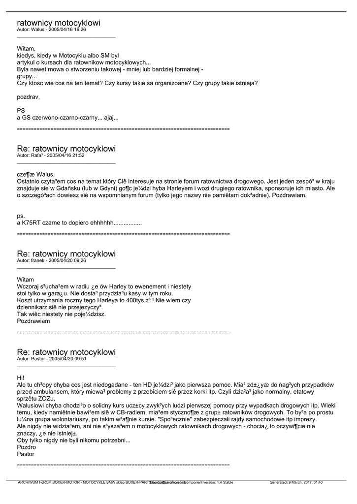 ratownicy motocyklowi Autor: Walus - 2005/04/16 16:26 _____________________________________ Witam, kiedys, kiedy w Motocyklu albo SM byl artykul o kursach dla ratownikow motocyklowych... Byla nawet mowa o stworzeniu takowej - mniej lub bardziej formalnej grupy... Czy ktosc wie cos na ten temat? Czy kursy takie sa organizoane? Czy grupy takie istnieja? pozdrav, PS a GS czerwono-czarno-czarny... ajaj... ============================================================================ Re: ratownicy motocyklowi Autor: Rafa³ - 2005/04/16 21:52 _____________________________________ cze¶æ Walus. Ostatnio czyta³em cos na temat który Ciê interesuje na stronie forum ratownictwa drogowego. Jest jeden zespó³ w kraju znajduje sie w Gdañsku (lub w Gdyni) go¶c je¼dzi hyba Harleyem i wozi drugiego ratownika, sponsoruje ich miasto. Ale o szczegó³ach dowiesz siê na wspomnianym forum (tylko jego nazwy nie pamiêtam dok³adnie). Pozdrawiam. ps. a K75RT czarne to dopiero ehhhhhh................. ============================================================================ Re: ratownicy motocyklowi Autor: franek - 2005/04/20 09:26 _____________________________________ Witam Wczoraj s³ucha³em w radiu ¿e ów Harley to ewenement i niestety stoi tylko w gara¿u. Nie dosta³ przydzia³u kasy w tym roku. Koszt utrzymania roczny tego Harleya to 400tys z³ ! Nie wiem czy dziennikarz siê nie przejezyczy³. Tak wiêc niestety nie poje¼dzisz. Pozdrawiam ============================================================================ Re: ratownicy motocyklowi Autor: Pastor - 2005/04/20 09:51 _____________________________________ Hi! Ale tu ch³opy chyba cos jest niedogadane - ten HD je¼dzi³ jako pierwsza pomoc. Mia³ zd±¿yæ do nag³ych przypadków przed ambulansem, który miewa³ problemy z przebiciem siê przez korki itp. Czyli dzia³a³ jako normalny, etatowy sprzêtu ZOZu. Walusiowi chyba chodzi³o o solidny kurs ucz±cy zwyk³ych ludzi pierwszej pomocy przy wypadkach drogowych itp. Wieki temu, kiedy namiêtnie bawi³em siê w CB-radiem, mia³em styczno¶æ z grup± ratowników drogowych. To by³a po prostu lu¼na grupa wolontariuszy, po takim w³a¶nie kursie. "Spo³ecznie" zabezpieczali rajdy samochodowe itp imprezy. Ale nigdy nie widzia³em, ani nie s³ysza³em o motocyklowych ratownikach drogowych - chocia¿ to oczywi¶cie nie znaczy, ¿e nie istniej±. Oby tylko nigdy nie byli nikomu potrzebni... Pozdro Pastor ============================================================================ ARCHIWUM FoRUM BOXER-MOTOR - MOTOCYKLE BMW sklep BOXER-PARTS.eu MamboBoard czê¶ci i akcesoria Forum Component version: 1.4 Stable Generated: 9 March, 2017, 01:40 Re: ratownicy motocyklowi Autor: Rafa³ - 2005/04/20 18:57 _____________________________________ Czesc. Jak to kogos interesuje polecam poszukaæ forum dot. ratownictwa drogowego i sanitariuszy- hmm adresu nie pamietam. czyta³em tam ¿e w niektórych krajach zachodnich takie "karetki" to norma, w Polsce nic siê nie op³aca (przynajmniej niektórym). ============================================================================ Re: ratownicy motocyklowi Autor: Walus - 2005/04/20 19:26 _____________________________________ Witam, ja to widze tak... ;) Szkole sie jako ratownik drogowy - pomoc przedmedyczna - na dobrym kursie z prosba ze ja motocyklista i np. chce umiec zdejmowac poszkodowanemu kask... Jade - widze - pomagam (wlasciwie pomagm bo umie) Gdyby jeszcze jakas grupa takich byla - to mozna by faktycznie jakies rajdy, zloty zabezpieczac.. A jakby Taka Grupe wlaczyc do krajowego systemu ratownctwa - hmm... Walus PS aj czerwony...! aj! ============================================================================ Re: ratownicy motocyklowi Autor: mazby - 2005/04/20 20:23 _____________________________________ Owszem by³ taki ruch, ale jak kazdy "spo³eczny " zmarl w agonii. Idea jest fajna i mozna ja zrealizowac w prosty sposób. nasz kolega Piotrek W. zgodzil sie poprowadziæ zawodowy kurs I pomocy na najblizszym spotkaniu organizowanym przez pana Wojtak. Piotrek pracuje w pogotowiu od....xxxxlat ( nota bene w pogotowiu w Niemczech), jest ze specjalizacj± anestezjologiem. Myslê, ¿e takie przeszkolenie da wiêksze szanse na prze¿ycie tym których spotkamy w potrzebie w trasie. Sugeruje o delikatny naciska na Panów Piotra i Wojtka by do takiego szkolenia dosz³o. Pozdrawiam Zbyszek ============================================================================ Re: ratownicy motocyklowi Autor: Walus - 2005/04/20 20:32 _____________________________________ Toz to pyszny pomysl! ;) Dajcie tylko wrocic z tych cieplych krajow i odebrac "czerwony na szprychowanych kolach"... Z wielka checia w czyms takim bym uczestniczyl! BMW z krzyzem maltanskim, ha! Widzialem takowe znaczki na forum takich tam japonskich motocykli, z plastikowymi jakimis dodatkami... ;) http://www.varaderoclub.pl/newforum/index.php?t=msg&th=115&start=0&rid=83&S=4922a278a5ed8da12f35717de476cb 57 Taka idea ma sens... ;) AW ============================================================================ ARCHIWUM FoRUM BOXER-MOTOR - MOTOCYKLE BMW sklep BOXER-PARTS.eu MamboBoard czê¶ci i akcesoria Forum Component version: 1.4 Stable Generated: 9 March, 2017, 01:40 Re: ratownicy motocyklowi Autor: Rafa³ - 2005/04/30 21:02 _____________________________________ Witam. Temat troche stary ale.... wczoraj na ul. Ostrobramskiej w kierunku ul. Marsa w Warszawie (pobli¿e salonu BMW Fus) na sygna³ach grza³ motocykl chyba to by³o co¶ serii K kolor bia³y z pomarañczowymi nalepkami odblaskowymi, z ty³u na pa³±ku kogyt chyba by³ czerwony, motocyklista ten jecha³ z uzyciem sygna³ów uprzywilejowania- tylko czy to szalony entuzjasta czy prawdziwy ratownik tego nie wiem. Ale mo¿e w stolicy cos kto¶ wymysli³ w temacie ratownictwa motocyklowego. ============================================================================ Re: ratownicy motocyklowi Autor: Wojciech Olejnik - 2005/06/30 17:32 _____________