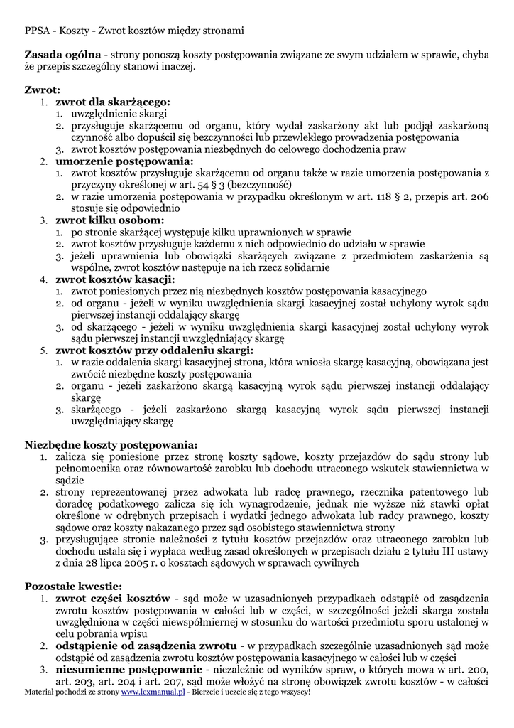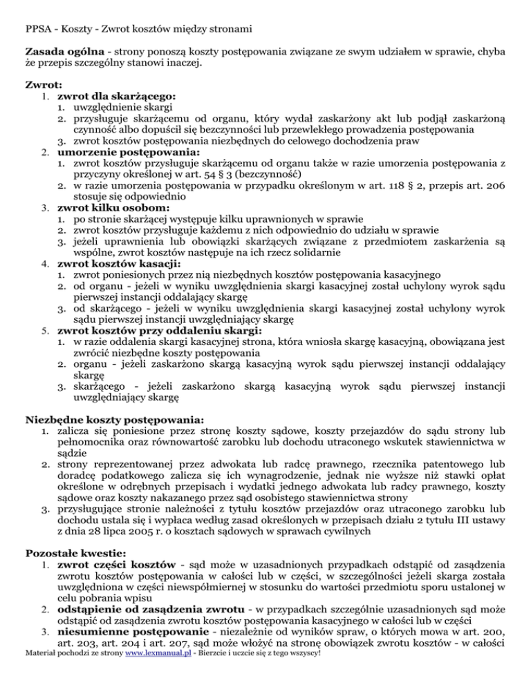 PPSA - Koszty - Zwrot kosztów między stronami Zasada ogólna - strony ponoszą koszty postępowania związane ze swym udziałem w sprawie, chyba że przepis szczególny stanowi inaczej. Zwrot: 1. zwrot dla skarżącego: 1. uwzględnienie skargi 2. przysługuje skarżącemu od organu, który wydał zaskarżony akt lub podjął zaskarżoną czynność albo dopuścił się bezczynności lub przewlekłego prowadzenia postępowania 3. zwrot kosztów postępowania niezbędnych do celowego dochodzenia praw 2. umorzenie postępowania: 1. zwrot kosztów przysługuje skarżącemu od organu także w razie umorzenia postępowania z przyczyny określonej w art. 54 § 3 (bezczynność) 2. w razie umorzenia postępowania w przypadku określonym w art. 118 § 2, przepis art. 206 stosuje się odpowiednio 3. zwrot kilku osobom: 1. po stronie skarżącej występuje kilku uprawnionych w sprawie 2. zwrot kosztów przysługuje każdemu z nich odpowiednio do udziału w sprawie 3. jeżeli uprawnienia lub obowiązki skarżących związane z przedmiotem zaskarżenia są wspólne, zwrot kosztów następuje na ich rzecz solidarnie 4. zwrot kosztów kasacji: 1. zwrot poniesionych przez nią niezbędnych kosztów postępowania kasacyjnego 2. od organu - jeżeli w wyniku uwzględnienia skargi kasacyjnej został uchylony wyrok sądu pierwszej instancji oddalający skargę 3. od skarżącego - jeżeli w wyniku uwzględnienia skargi kasacyjnej został uchylony wyrok sądu pierwszej instancji uwzględniający skargę 5. zwrot kosztów przy oddaleniu skargi: 1. w razie oddalenia skargi kasacyjnej strona, która wniosła skargę kasacyjną, obowiązana jest zwrócić niezbędne koszty postępowania 2. organu - jeżeli zaskarżono skargą kasacyjną wyrok sądu pierwszej instancji oddalający skargę 3. skarżącego - jeżeli zaskarżono skargą kasacyjną wyrok sądu pierwszej instancji uwzględniający skargę Niezbędne koszty postępowania: 1. zalicza się poniesione przez stronę koszty sądowe, koszty przejazdów do sądu strony lub pełnomocnika oraz równowartość zarobku lub dochodu utraconego wskutek stawiennictwa w sądzie 2. strony reprezentowanej przez adwokata lub radcę prawnego, rzecznika patentowego lub doradcę podatkowego zalicza się ich wynagrodzenie, jednak nie wyższe niż stawki opłat określone w odrębnych przepisach i wydatki jednego adwokata lub radcy prawnego, koszty sądowe oraz koszty nakazanego przez sąd osobistego stawiennictwa strony 3. przysługujące stronie należności z tytułu kosztów przejazdów oraz utraconego zarobku lub dochodu ustala się i wypłaca według zasad określonych w przepisach działu 2 tytułu III ustawy z dnia 28 lipca 2005 r. o kosztach sądowych w sprawach cywilnych Pozostałe kwestie: 1. zwrot części kosztów - sąd może w uzasadnionych przypadkach odstąpić od zasądzenia zwrotu kosztów postępowania w całości lub w części, w szczególności jeżeli skarga została uwzględniona w części niewspółmiernej w stosunku do wartości przedmiotu sporu ustalonej w celu pobrania wpisu 2. odstąpienie od zasądzenia zwrotu - w przypadkach szczególnie uzasadnionych sąd może odstąpić od zasądzenia zwrotu kosztów postępowania kasacyjnego w całości lub w części 3. niesumienne postępowanie - niezależnie od wyników spraw, o których mowa w art. 200, art. 203, art. 204 i art. 207, sąd może włożyć na stronę obowiązek zwrotu kosztów - w całości Materiał pochodzi ze strony www.lexmanual.pl - Bierzcie i uczcie się z tego wszyscy! PPSA - Koszty - Zwrot kosztów między stronami lub w części - wywołanych jej niesumiennym lub oczywiście niewłaściwym postępowaniem 4. wniosek o zwrot - wniosek strony o zwrot kosztów sąd rozstrzyga w każdym orzeczeniu uwzględniającym skargę oraz w orzeczeniu, o którym mowa w art. 201, art. 203 i art. 204 5. skutki niezgłoszenia wniosku w terminie: 1. strona traci uprawnienie do żądania zwrotu kosztów, jeżeli najpóźniej przed zamknięciem rozprawy bezpośrednio poprzedzającej wydanie orzeczenia nie zgłosi wniosku o przyznanie należnych kosztów 2. stronę działającą bez adwokata, radcy prawnego, doradcy podatkowego lub rzecznika patentowego sąd powinien pouczyć o skutkach niezgłoszenia wniosku w powyższym terminie 3. nie ma zastosowania w przypadku orzekania na posiedzeniu niejawnym, gdy strona nie jest reprezentowana przez adwokata, radcę prawnego, doradcę podatkowego lub rzecznika patentowego - wtedy sąd orzeka z urzędu Materiał pochodzi ze strony www.lexmanual.pl - Bierzcie i uczcie się z tego wszyscy!
