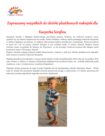 Zapraszamy wszystkich do zbiórki plastikowych nakrętek dla Kacperka Serafina Kacperek Serafin z Majdanu Królewskiego potrzebuje protezę. Rodzice, by uratować synkowi życie, zgodzili się, by lekarze amputowali mu nóżkę. Różne fundacje i dobrzy ludzie pomagają rodzicom Kacperka w zbiórce funduszy na protezę. Co półtora roku proteza będzie musiała być wymieniana. Pierwsza proteza to koszt od 5 do 10 tysięcy złotych. Kolejne to już wydatek rzędu 15 tysięcy złotych. Rodzice muszą również często wyjeżdżać do lekarza, do Warszawy, co też kosztuje. Końcowa proteza dla chłopca może kosztować nawet 150 tysięcy złotych. Państwo Serafin szukają różnych źródeł finansowania i jednym z nich jest zbiórka plastikowych nakrętek. Jeśli możesz to pomóż rodzicom Kacperka. Zbiórka plastikowych nakrętek w naszej szkole będzie trwała od października 2016 roku do 14 grudnia 2016 roku. Pomoc w zbiórce w ramach wolontariatu zadeklarowali uczniowie klasy 2A - technik elektronik profil wojskowy, wraz z wychowawcą Leszkiem Osipiakiem. Nakrętki można przynosić do pana Leszka Osipiaka lub do koordynatora zbiórki Marzanny Mazur - Witek (sala 4). Każdy kto przyniesie nakrętki otrzyma pozytywną uwagę z zachowania, a Ci którzy przyniosą ich najwięcej zostaną nagrodzeni nagrodą rzeczową i dyplomem.