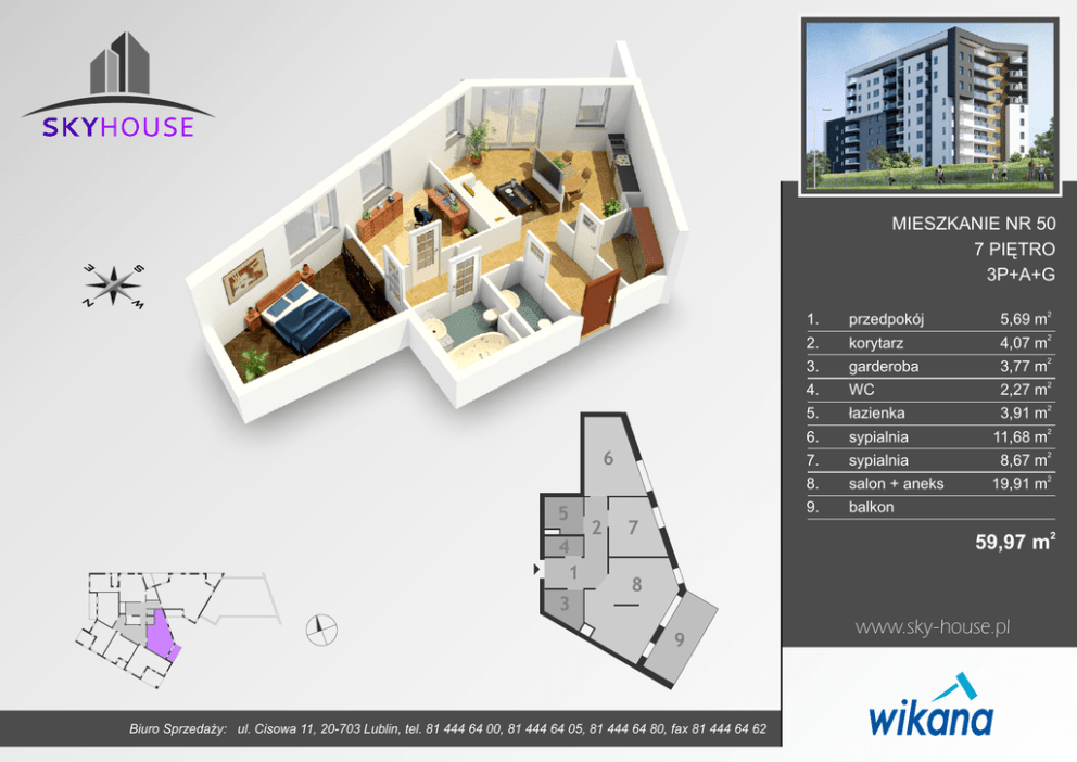 MIESZKANIE NR 50 7 PIĘTRO 3P+A+G 6 5 4 1 2 7 1. przedpokój 5,69 m2 2. korytarz 4,07 m2 3. garderoba 3,77 m 4. WC 2,27 m2 5. łazienka 3,91 m 6. sypialnia 11,68 m 7. sypialnia 8,67 m2 8. salon + aneks 9. balkon 2 2 2 2 19,91 m 59,97 m2 8 3 9 Biuro Sprzedaży: ul. Cisowa 11, 20-703 Lublin, tel. 81 444 64 00, 81 444 64 05, 81 444 64 80, fax 81 444 64 62 www.sky-house.pl