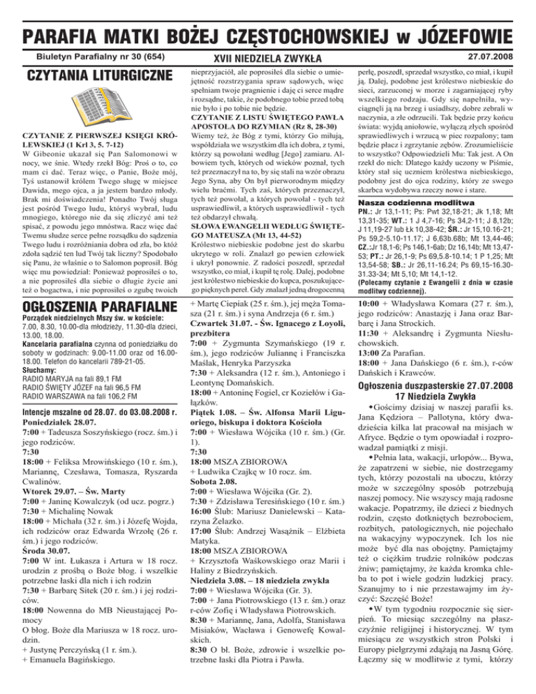 PARAFIA MATKI BOŻEJ CZÊSTOCHOWSKIEJ w JÓZEFOWIE 27.07.2008 Biuletyn Parafialny nr 30 (654) XVII NIEDZIELA ZWYKŁA CZYTANIA LITURGICZNE nieprzyjaciół, ale poprosiłeś dla siebie o umiejętność rozstrzygania spraw sądowych, więc spełniam twoje pragnienie i daję ci serce mądre i rozsądne, takie, że podobnego tobie przed tobą nie było i po tobie nie będzie. CZYTANIE Z LISTU ŚWIĘTEGO PAWŁA APOSTOŁA DO RZYMIAN (Rz 8, 28-30) Wiemy też, że Bóg z tymi, którzy Go miłują, współdziała we wszystkim dla ich dobra, z tymi, którzy są powołani według [Jego] zamiaru. Albowiem tych, których od wieków poznał, tych też przeznaczył na to, by się stali na wzór obrazu Jego Syna, aby On był pierworodnym między wielu braćmi. Tych zaś, których przeznaczył, tych też powołał, a których powołał - tych też usprawiedliwił, a których usprawiedliwił - tych też obdarzył chwałą. SŁOWA EWANGELII WEDŁUG ŚWIĘTEGO MATEUSZA (Mt 13, 44-52) Królestwo niebieskie podobne jest do skarbu ukrytego w roli. Znalazł go pewien człowiek i ukrył ponownie. Z radości poszedł, sprzedał wszystko, co miał, i kupił tę rolę. Dalej, podobne jest królestwo niebieskie do kupca, poszukującego pięknych pereł. Gdy znalazł jedną drogocenną perłę, poszedł, sprzedał wszystko, co miał, i kupił ją. Dalej, podobne jest królestwo niebieskie do sieci, zarzuconej w morze i zagarniającej ryby wszelkiego rodzaju. Gdy się napełniła, wyciągnęli ją na brzeg i usiadłszy, dobre zebrali w naczynia, a złe odrzucili. Tak będzie przy końcu świata: wyjdą aniołowie, wyłączą złych spośród sprawiedliwych i wrzucą w piec rozpalony; tam będzie płacz i zgrzytanie zębów. Zrozumieliście to wszystko? Odpowiedzieli Mu: Tak jest. A On rzekł do nich: Dlatego każdy uczony w Piśmie, który stał się uczniem królestwa niebieskiego, podobny jest do ojca rodziny, który ze swego skarbca wydobywa rzeczy nowe i stare. + Martę Ciepiak (25 r. śm.), jej męża Tomasza (21 r. śm.) i syna Andrzeja (6 r. śm.) Czwartek 31.07. - Św. Ignacego z Loyoli, prezbitera 7:00 + Zygmunta Szymańskiego (19 r. śm.), jego rodziców Juliannę i Franciszka Maślak, Henryka Parzyszka 7:30 + Aleksandra (12 r. śm.), Antoniego i Leontynę Domańskich. 18:00 + Antoninę Fogiel, cr Koziełów i Gałązków. Piątek 1.08. – Św. Alfonsa Marii Liguoriego, biskupa i doktora Kościoła 7:00 + Wiesława Wójcika (10 r. śm.) (Gr. 1). 7:30 18:00 MSZA ZBIOROWA + Ludwika Czajkę w 10 rocz. śm. Sobota 2.08. 7:00 + Wiesława Wójcika (Gr. 2). 7:30 + Zdzisława Teresińskiego (10 r. śm.) 16:00 Ślub: Mariusz Danielewski – Katarzyna Żelazko. 17:00 Ślub: Andrzej Wasążnik – Elżbieta Matyka. 18:00 MSZA ZBIOROWA + Krzysztofa Waśkowskiego oraz Marii i Haliny z Biedrzyńskich. Niedziela 3.08. – 18 niedziela zwykła 7:00 + Wiesława Wójcika (Gr. 3). 7:00 + Jana Piotrowskiego (13 r. śm.) oraz r-ców Zofię i Władysława Piotrowskich. 8:30 + Mariannę, Jana, Adolfa, Stanisława Misiaków, Wacława i Genowefę Kowalskich. 8:30 O bł. Boże, zdrowie i wszelkie potrzebne łaski dla Piotra i Pawła. 10:00 + Władysława Komara (27 r. śm.), jego rodziców: Anastazję i Jana oraz Barbarę i Jana Strockich. 11:30 + Aleksandrę i Zygmunta Niesłuchowskich. 13:00 Za Parafian. 18:00 + Jana Dańskiego (6 r. śm.), r-ców Dańskich i Krawców. CZYTANIE Z PIERWSZEJ KSIĘGI KRÓLEWSKIEJ (1 Krl 3, 5. 7-12) W Gibeonie ukazał się Pan Salomonowi w nocy, we śnie. Wtedy rzekł Bóg: Proś o to, co mam ci dać. Teraz więc, o Panie, Boże mój, Tyś ustanowił królem Twego sługę w miejsce Dawida, mego ojca, a ja jestem bardzo młody. Brak mi doświadczenia! Ponadto Twój sługa jest pośród Twego ludu, któryś wybrał, ludu mnogiego, którego nie da się zliczyć ani też spisać, z powodu jego mnóstwa. Racz więc dać Twemu słudze serce pełne rozsądku do sądzenia Twego ludu i rozróżniania dobra od zła, bo któż zdoła sądzić ten lud Twój tak liczny? Spodobało się Panu, że właśnie o to Salomon poprosił. Bóg więc mu powiedział: Ponieważ poprosiłeś o to, a nie poprosiłeś dla siebie o długie życie ani też o bogactwa, i nie poprosiłeś o zgubę twoich OG£OSZENIA PARAFIALNE Porz¹dek niedzielnych Mszy œw. w koœciele: 7.00, 8.30, 10.00-dla m³odzie¿y, 11.30-dla dzieci, 13.00, 18.00. Kancelaria parafialna czynna od poniedzia³ku do soboty w godzinach: 9.00-11.00 oraz od 16.0018.00. Telefon do kancelarii 789-21-05. S³uchamy: RADIO MARYJA na fali 89,1 FM RADIO ŒWIÊTY JÓZEF na fali 96,5 FM RADIO WARSZAWA na fali 106,2 FM Intencje mszalne od 28.07. do 03.08.2008 r. Poniedziałek 28.07. 7:00 + Tadeusza Soszyńskiego (rocz. śm.) i jego rodziców. 7:30 18:00 + Feliksa Mrowińskiego (10 r. śm.), Mariannę, Czesława, Tomasza, Ryszarda Cwalinów. Wtorek 29.07. – Św. Marty 7:00 + Janinę Kowalczyk (od ucz. pogrz.) 7:30 + Michalinę Nowak 18:00 + Michała (32 r. śm.) i Józefę Wojda, ich rodziców oraz Edwarda Wrzołę (26 r. śm.) i jego rodziców. Środa 30.07. 7:00 W int. Łukasza i Artura w 18 rocz. urodzin z prośbą o Boże błog. i wszelkie potrzebne łaski dla nich i ich rodzin 7:30 + Barbarę Sitek (20 r. śm.) i jej rodziców. 18:00 Nowenna do MB Nieustającej Pomocy O błog. Boże dla Mariusza w 18 rocz. urodzin. + Justynę Perczyńską (1 r. śm.). + Emanuela Bagińskiego. Nasza codzienna modlitwa PN.: Jr 13,1-11; Ps: Pwt 32,18-21; Jk 1,18; Mt 13,31-35; WT.: 1 J 4,7-16; Ps 34,2-11; J 8,12b; J 11,19-27 lub Łk 10,38-42; ŚR.: Jr 15,10.16-21; Ps 59,2-5.10-11.17; J 6,63b.68b; Mt 13,44-46; CZ.:Jr 18,1-6; Ps 146,1-6ab; Dz 16,14b; Mt 13,4753; PT.: Jr 26,1-9; Ps 69,5.8-10.14; 1 P 1,25; Mt 13,54-58; SB.: Jr 26,11-16.24; Ps 69,15-16.3031.33-34; Mt 5,10; Mt 14,1-12. (Polecamy czytanie z Ewangelii z dnia w czasie modlitwy codziennej). Ogłoszenia duszpasterskie 27.07.2008 17 Niedziela Zwykła wGościmy dzisiaj w naszej parafii ks. Jana Kędziora – Pallotyna, który dwadzieścia