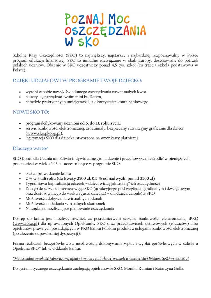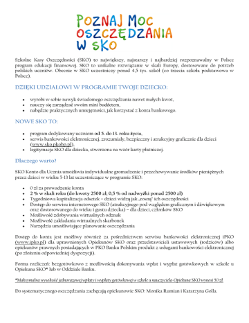 Szkolne Kasy Oszczędności (SKO) to największy, najstarszy i najbardziej rozpoznawalny w Polsce program edukacji finansowej. SKO to unikalne rozwiązanie w skali Europy, dostosowane do potrzeb polskich uczniów. Obecnie w SKO uczestniczy ponad 4,5 tys. szkół (co trzecia szkoła podstawowa w Polsce). DZIĘKI UDZIAŁOWI W PROGRAMIE TWOJE DZIECKO: wyrobi w sobie nawyk świadomego oszczędzania nawet małych kwot, nauczy się zarządzać swoim mini budżetem, nabędzie praktycznych umiejętności, jak korzystać z konta bankowego. NOWE SKO TO: program dedykowany uczniom od 5. do 13. roku życia, serwis bankowości elektronicznej, zrozumiały, bezpieczny i atrakcyjny graficznie dla dzieci (www.sko.pkobp.pl), legitymacja SKO dla dziecka, stworzona na wzór karty płatniczej. Dlaczego warto? SKO Konto dla Ucznia umożliwia indywidualne gromadzenie i przechowywanie środków pieniężnych przez dzieci w wieku 5-13 lat uczestniczące w programie SKO: 0 zł za prowadzenie konta 2 % w skali roku (do kwoty 2500 zł; 0,5 % od nadwyżki ponad 2500 zł) Tygodniowa kapitalizacja odsetek – dzieci widzą jak „rosną” ich oszczędności Dostęp do serwisu internetowego SKO (atrakcyjnego pod względem graficznym i dźwiękowym oraz dostosowanego do wieku i gustu dziecka) – dla dzieci, członków SKO Możliwość zdobywania wirtualnych odznak Możliwość zakładania wirtualnych skarbonek Narzędzia umożliwiające planowanie oszczędzania Dostęp do konta jest możliwy również za pośrednictwem serwisu bankowości elektronicznej iPKO (www.ipko.pl) dla uprawnionych Opiekunów SKO oraz przedstawicieli ustawowych (rodziców) albo opiekunów prawnych posiadających w PKO Banku Polskim produkt z usługami bankowości elektronicznej (po złożeniu odpowiedniej dyspozycji). Forma rozliczeń: bezgotówkowo z możliwością dokonywania wpłat i wypłat gotówkowych w szkole u Opiekuna SKO* lub w Oddziale Banku. *Maksymalna wysokość jednorazowej wpłaty i wypłaty gotówkowej w szkole u nauczyciela-Opiekuna SKO wynosi 50 zł. Do systematycznego oszczędzania zachęcają opiekunowie SKO: Monika Rumian i Katarzyna Golla.
