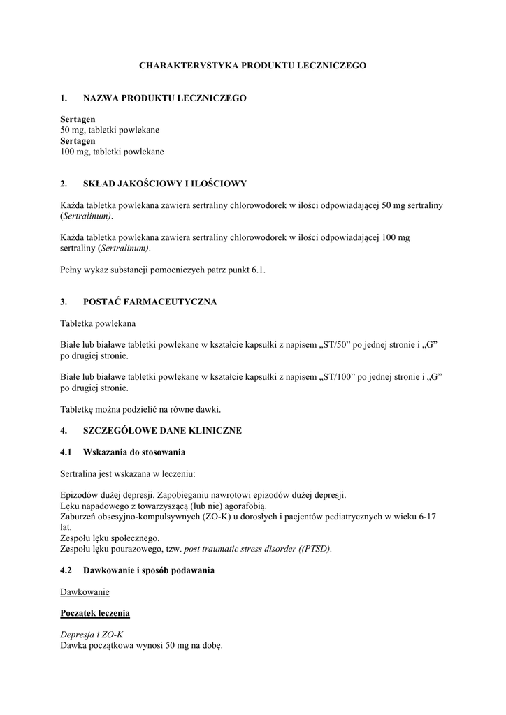 CHARAKTERYSTYKA PRODUKTU LECZNICZEGO 1. NAZWA PRODUKTU LECZNICZEGO Sertagen 50 mg, tabletki powlekane Sertagen 100 mg, tabletki powlekane 2. SKŁAD JAKOŚCIOWY I ILOŚCIOWY Każda tabletka powlekana zawiera sertraliny chlorowodorek w ilości odpowiadającej 50 mg sertraliny (Sertralinum). Każda tabletka powlekana zawiera sertraliny chlorowodorek w ilości odpowiadającej 100 mg sertraliny (Sertralinum). Pełny wykaz substancji pomocniczych patrz punkt 6.1. 3. POSTAĆ FARMACEUTYCZNA Tabletka powlekana Białe lub białawe tabletki powlekane w kształcie kapsułki z napisem „ST/50” po jednej stronie i „G” po drugiej stronie. Białe lub białawe tabletki powlekane w kształcie kapsułki z napisem „ST/100” po jednej stronie i „G” po drugiej stronie. Tabletkę można podzielić na równe dawki. 4. SZCZEGÓŁOWE DANE KLINICZNE 4.1 Wskazania do stosowania Sertralina jest wskazana w leczeniu: Epizodów dużej depresji. Zapobieganiu nawrotowi epizodów dużej depresji. Lęku napadowego z towarzyszącą (lub nie) agorafobią. Zaburzeń obsesyjno-kompulsywnych (ZO-K) u dorosłych i pacjentów pediatrycznych w wieku 6-17 lat. Zespołu lęku społecznego. Zespołu lęku pourazowego, tzw. post traumatic stress disorder ((PTSD). 4.2 Dawkowanie i sposób podawania Dawkowanie Początek leczenia Depresja i ZO-K Dawka początkowa wynosi 50 mg na dobę. Lęk napadowy, PTSD i zespół lęku społecznego Dawka początkowa wynosi 25 mg na dobę. Po tygodniu dawkę należy zwiększyć do 50 mg raz na dobę. Wykazano, że ten schemat dawkowania zmniejsza częstotliwość pojawiających się na początku leczenia działań niepożądanych, charakterystycznych dla lęku napadowego. Dostosowanie dawki Depresja, ZO-K, lęk napadowy, zespół lęku społecznego, PTSD Pacjenci niereagujący na dawkę 50 mg mogą wymagać jej zwiększenia. Zmian dawkowania należy dokonywać w odstępach co najmniej jednego tygodnia, każdorazowo o 50 mg, aż do maksymalnej dawki 200 mg na dobę. Biorąc pod uwagę okres półtrwania eliminacji sertraliny (wynoszący 24 h), nie należy zmieniać dawkowania częściej niż raz na tydzień. Początek działania terapeutycznego powinien by c zauważalny w ciągu 7 dni, jednakże zwykle potrzeba więcej czasu do osiągnięcia efektu terapeutycznego, szczególnie w przypadku ZO-K. Leczenie podtrzymujące W okresie długotrwałego leczenia podtrzymującego dawkowanie powinno być utrzymywane na najniższym poziomie zapewniającym efekt terapeutyczny, a następnie dostosowywane w zależności od potrzeby. Depresja Długotrwałe leczenie może być również konieczne w celu zapobiegania nawrotom epizodów dużej depresji (MDE – ang. Major Depression Episodes). W większości przypadków, w zapobieganiu MDE zalecana jest taka sama dawka, jaka jest stosowana w trakcie bieżącego epizodu. Chorzy na depresję powinni być leczeni wystarczająco długo, co najmniej 6 miesięcy, aby zapewnić ustąpienie objawów choroby. Lęk napadowy i ZO-K W przypadku lęku napadowego i ZO-K należy regularnie oceniać konieczność kontynuowania leczenia, ponieważ w przypadku tych zaburzeń zdolność zapobiegania nawrotom nie zostałą udowodniona. Dzieci i młodzież Dzieci i młodzież z ZO-K Wiek 13-17 lat: początkowo 50 mg raz na dobę. Wiek 6-12 lat: początkowo 25 mg raz na dobę. Po tygodniu dawka może być zwiększona do 50 mg raz na dobę. Gdy brak spodziewanego efektu po dawce 50 mg na dobę, kolejne dawki mogą być zwiększane w zależności od potrzeb w kolejnych tygodniach. Dawka maksymalna wynosi 200 mg na dobę. Zwiększając dawkę dobową powyżej 50 mg należy wziąć pod uwagę mniejszą masę ciała u dzieci w porównaniu z dorosłymi. Nie należy zmieniać dawkowania w odstępach mniejszych niż tydzień. Nie wykazano skuteczności w przypadkach dużej depresji u dzieci. Brak dostępnych danych dotyczących stosowania u dzieci poniżej 6 roku życia (patrz punkt 4.4) Stosowanie u pacjentów w podeszłym wieku Ze względu na zwiększone ryzyko hiponatremii u pacjentów w wieku podeszłym lek należy ostrożnie stosować (patrz punkt 4.4) Stosowanie u pacjentów z niewydolnością wątroby. Należy ostrożnie stosować sertralinę u pacjentów z chorobami wątroby. Należy stosować mniejsze dawki lub zmniejszyć częstość podawania leku u pacjentów z zaburzeniami czynności wątroby (patrz punkt 4.4). Ze względu na brak danych klinicznych nie należy stosować sertraliny u pacjentów z ciężką niewydolnością wątroby (patrz punkt 4.4) Stosowanie u pacjentów z niewydolnością nerek U pacjentów z niewydolnością nerek dostosowanie dawki nie jest wymagane (patrz punkt 4.4) Objawy z odstawienia po przerwaniu leczenia sertraliną Należy unikać nagłego odstawienia. Zaprzestając leczenia sertraliną, dawka powinna być zmniejszana stopniowo przez okres co najmniej jednego lub dwóch tygodni w celu zmniejszenia ryzyka wystąpienia reakcji z odstawienia (patrz punkty 4.4 i 4.8). Jeżeli po zmniejszeniu dawki lub po zakończeniu leczenia wystąpią objawy z odstawienia leku, należy rozważyć ponowne podanie zaleconej dawki. Następnie lekarz może kontynuować zmniejszanie dawki, ale w wolniejszym tempie. Sposób podawania Sertralinę należy stosować w pojedynczej dawce dobowej, rano lub wieczorem. Tabletki sertraliny można podawać z posiłkiem lub niezależnie od posiłku. 4.3 Przeciwwskazania Nadwrażliwość na substancję czynną lub którąkolwiek substancję pomocniczą wymienioną w punkcie 6.1. Przeciwskazane jest jednoczesne stosowanie nieodwracalnych inhibitorów monoaminooksydazy (MAO) z uwagi na ryzyko zespołu serotoninowego z objawami takimi jak pobudzenie psychoruchowe, drżenie mięśniowe i hipertermia. Nie należy rozpoczynać stosowania sertraliny w ciągu co najmniej 14 dni od zakończenia leczenia nieodwracalnym inhibitorem MAO. Sertralinę należy odstawić na co najmniej 7 dni przed rozpoczęciem leczenia nieodwracalnym inhibitorem M