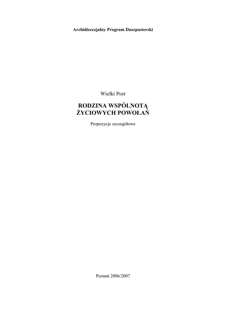 Archidiecezjalny Program Duszpasterski Wielki Post RODZINA WSPÓLNOTĄ śYCIOWYCH POWOŁAŃ Propozycje szczegółowe Poznań 2006/2007 MISTYKA Zakorzenienie w Tajemnicę Boga Rodzina Kościołem domowym MałŜeństwo i rodzina chrześcijańska budują Kościół. W rodzinie bowiem osoba ludzka nie tylko rodzi się i stopniowo, poprzez wychowanie, wprowadzana jest we wspólnotę ludzką, ale takŜe poprzez odrodzenie chrzcielne i wychowanie w wierze wprowadzana jest w rodzinę BoŜą, jaką jest Kościół. MałŜeństwo chrześcijańskie, uczestnicząc w zbawczych skutkach tajemnicy śmierci i zmartwychwstania Chrystusa, stanowi naturalne środowisko, w którym dokonuje się włączenie osoby ludzkiej do wielkiej rodziny Kościoła. Tak więc Kościół znajduje w rodzinie, zrodzonej z sakramentu, swoją kolebkę i miejsce, w którym wchodzi w pokolenia ludzkie, a one - w Kościół (FC 15). Moc krzyŜa Wielu ludzi, wiele rodzin nie potrafi dzisiaj przyjąć i przeŜywać po chrześcijańsku trudności, które się pojawiają. Wielki Post jest czasem szczególnego przylgnięcia do Chrystusowego krzyŜa. Zachęcajmy wiernych do odkrywania mocy krzyŜa poprzez naboŜeństwa Gorzkich śali z kazaniami pasyjnymi, Drogi krzyŜowej czy prywatne praktyki pokutne. Pokazujmy potrzebę zakorzenienia się w krzyŜu, która prowadzi do umiejętności przyjęcia krzyŜa w swoimi Ŝyciu. Rodzina rozmodlona Rodzina, jako wspólnota Ŝycia i miłości, winna pielęgnować wspólną domową modlitwę. Gdy dzieci są małe, rodzice uczą je znaku krzyŜa i podstawowych modlitw oraz towarzyszą im w przygotowaniu do sakramentów inicjacji chrześcijańskiej. ZaangaŜowanie rodziców w okresie przygotowania do pierwszej Komunii św. ich dziecka jest zwykle największe. Przy bierzmowaniu młodzieŜy, niestety, trudno juŜ nawiązać podobny kontakt z ich rodzicami. Przypominajmy rodzicom, Ŝe to oni, świadectwem własnej modlitwy, mają zachęcać swe dzieci do wytrwałości w codziennej rozmowie z Bogiem. Pokazujmy im Rytuał rodzinny, modlitewniki dla młodzieŜy i dorosłych, umoŜliwiajmy ich zakup, by dorośli ludzie nie korzystali, jak to – niestety - często bywa, z ksiąŜeczek do naboŜeństwa z dzieciństwa. Wprowadzajmy w parafiach zwyczaj Mszy świętych w intencji pierwszej i osiemnastej rocznicy urodzin dzieci. W wielu wspólnotach przyjęła się taka, godna naśladowania, tradycja. Jest to okazja do modlitwy o odkrywanie przez dzieci ich Ŝyciowych powołań. Zachęcajmy takŜe do rodzinnej modlitwy na róŜańcu. Więzi rodzinne Dostrzegamy, jak często członkowie rodzin Ŝyją w konfliktach i sporach. Wskazujmy na moc płynącą z sakramentów, BoŜego słowa i osobistej modlitwy. Podkreślajmy znaczenie sakramentu pokuty i pojednania, który uzdalnia człowieka do przebaczenia na wzór miłosiernego Boga odpuszczającego nam nasze grzechy. Zachęcajmy wiernych do udziału w naboŜeństwach pasyjnych Wielkiego Postu. One wzywają wierzącego do nawrócenia oraz stają się dla niego źródłem mocy. Wskazujmy teŜ na potrzebę pielęgnowania rozmowy w rodzinie. Trzeba walczyć dzisiaj o czas na to, by móc razem usiąść do stołu, do wspólnego posiłku, podzielić się radościami i smutkami. Bez takiej praktyki nie da się zachować więzi rodzinnych. 2 Dzień Pański Niełatwo dzisiaj uczyć ludzi przeŜywania niedzieli, jako Dnia Pańskiego. Konsumpcyjny styl Ŝycia, otwarte sklepy, wykonywanie pracy zawodowej w niedzielę, to tylko niektóre problemy, które utrudniają odkrywanie prawdy o niedzieli i jej znaczenia w Ŝyciu chrześcijanina. Wykorzystajmy wszelkie moŜliwości, by przypominać wiernym o chrześcijańskim przeŜywaniu niedzieli. Niech słuŜą temu takŜe róŜne formy katechezy dorosłych w parafii, np. narzeczonych, rodziców przed chrztem dziecka, rodziców dzieci pierwszokomunijnych czy młodzieŜy przed bierzmowaniem. Podkreślajmy takŜe fakt, Ŝe to nam, ludziom potrzebny jest ten dzień, by móc pielęgnować rodzinne i sąsiedzkie więzi. Rodzinna Eucharystia W większych parafiach naszej Archidiecezji celebruje się w niedziele Msze święte z udziałem dzieci i Msze święte młodzieŜowe. Gromadząc dzieci na niedzielnej Eucharystii, trzeba dzisiaj myśleć takŜe o rodzicach i innych osobach dorosłych, które wraz z nimi przychodzą do kościoła. Bardzo istotny jest postulat organizowania Mszy świętych rodzinnych, gdzie akcenty rozłoŜone są zarówno na dorosłych, jak i na dzieci. Twórzmy wokół tych Eucharystii zespoły liturgiczne kierowane przez duszpasterza czy katechetę, które gromadzić będą dzieci wraz z rodzicami, osoby gotowe włączyć się w przygotowanie liturgii. Zwracajmy uwagę na to, by słowo BoŜe czytali dorośli, natomiast prośby, komentarze i procesje z darami pozostawmy dzieciom. Dobrą pomocą słuŜącą przygotowaniu niedzielnej Mszy świętej jest dodatek do miesięcznika „Katecheta” – Katecheta na niedzielę. Zawiera on gotowy do wykorzystania scenariusz liturgii Mszy świętej, w który mogą włączyć się dorośli oraz dzieci. W parafiach, w których jest tylko jeden kapłan, warto zastanowić się czy nie moŜna raz w miesiącu celebrować Mszy świętej rodzinnej z mocnym akcentem na obecność dzieci. Tradycyjnie Program zawiera komentarze do niedzielnych czytań oraz propozycje tematycznych śpiewów. Wykorzystajmy je w przygotowaniu liturgii Eucharystii. Parafialne Święto Młodych Niedziela Palmowa winna być przeŜywana w naszych parafiach jako dzień młodych. Po udanym doświadczeniu wrześniowego Archidiecezjalnego Święta Młodych w Poznaniu, podejmijmy wysiłek, by w kaŜdej parafii Niedziela Palmowa stała się, w łączności z Ojcem Świętym Benedyktem XVI, Parafialnym Świętem Młodych. Wykorzystajmy materiały przygotowane przez Duszpasterstwo Młodych naszej Archidiecezji, które dotrą do naszych parafii. Droga krzyŜowa Droga krzyŜowa ulicami miasta Poznania przejdzie 3 kwietni