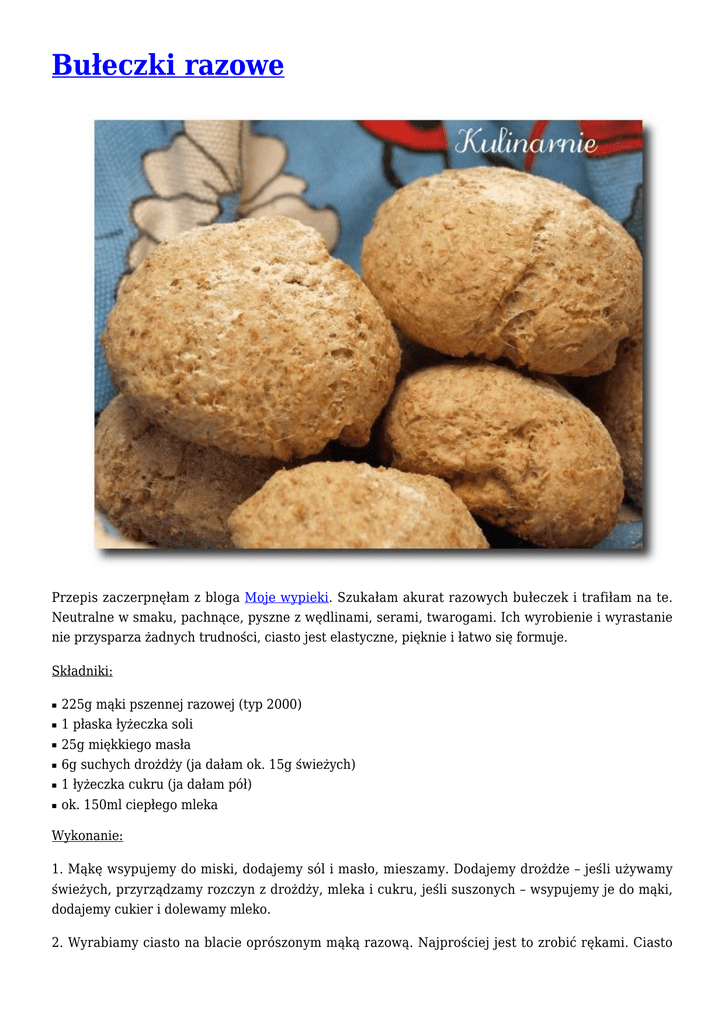 Bułeczki razowe Przepis zaczerpnęłam z bloga Moje wypieki. Szukałam akurat razowych bułeczek i trafiłam na te. Neutralne w smaku, pachnące, pyszne z wędlinami, serami, twarogami. Ich wyrobienie i wyrastanie nie przysparza żadnych trudności, ciasto jest elastyczne, pięknie i łatwo się formuje. Składniki: ■ ■ ■ ■ ■ ■ 225g mąki pszennej razowej (typ 2000) 1 płaska łyżeczka soli 25g miękkiego masła 6g suchych drożdży (ja dałam ok. 15g świeżych) 1 łyżeczka cukru (ja dałam pół) ok. 150ml ciepłego mleka Wykonanie: 1. Mąkę wsypujemy do miski, dodajemy sól i masło, mieszamy. Dodajemy drożdże – jeśli używamy świeżych, przyrządzamy rozczyn z drożdży, mleka i cukru, jeśli suszonych – wsypujemy je do mąki, dodajemy cukier i dolewamy mleko. 2. Wyrabiamy ciasto na blacie oprószonym mąką razową. Najprościej jest to zrobić rękami. Ciasto powinno być elastyczne i powinno bez problemu odchodzić od rąk. 3. Z ciasta formujemy kulę, wkładamy do miski, przykrywamy ściereczką i odstawiamy w ciepłe miejsce na około godzinę. 4. Gdy ciasto wyrośnie, chwilę je zagniatamy i dzielimy na 8 części. Z każdej formujemy okrągłą bułeczkę i układać na blasze wyłożonej papierem do pieczenia. Przykryć i odstawić do wyrośnięcia na pół godziny. 5. Bułeczki oprószamy mąką razową i pieczemy w nagrzanym do 220 stopni Celsjusza piekarniku przez około 20 minut. Studzimy na kratce. Zdrowe bułeczki orkiszowo-żytnie Chciałam upiec jakieś w miarę zdrowe pieczywo specjalnie dla siebie i wybór padł na bułeczki orkiszowo-żytnie mojego pomysłu. Wyszły niewysokie, podobne z wyglądu do pszennych ciabattek. Są zrobione w połowie z mąki, w połowie z zaparzonych ziaren, dość dietetycznie, zdrowo, mnóstwo błonnika, do tego chrupiąca skórka, pyszne z masłem i rzodkiewką. Polecam Wam, jeśli jesteście na niezbyt restrykcyjnym Dukanie. Składniki: ■ ■ ■ ■ ■ ■ ■ ■ ■ ■ ■ ■ 220g mąki orkiszowej (typ 700) 50g mąki żytniej (typ 720) 50g mąki żytniej razowej (typ 2000) szklanka otrębów owsianych szklanka płatków owsianych pół szklanki ziaren sezamu (+ trochę do posypania) 1 łyżeczka soli 1 płaska łyżeczka cukru 20g świeżych drożdży 1 płaska łyżka masła półtorej szklanki wrzątku 1/4 szklanki letniego mleka (+ trochę do posmarowania) Wykonanie: 1. Mąki wsypujemy do miski. 2. Płatki owsiane, otręby, sezam, masło, sól i pół łyżeczki cukru wsypujemy do drugiej miski i zalewamy wrzątkiem. Mieszamy i odstawiamy na 10 minut, by napęczniały. 3. Drożdże rozcieramy z połową łyżeczki cukru w letnim mleku i odstawiamy na kilka minut. 4. Do miski z mąką wlewamy zaczyn z drożdży oraz zaparzone ziarna i wyrabiamy mikserem z hakami przez kilka minut. Ciasto będzie luźne i raczej nie uformujemy go w kulę. Przykrywamy ściereczką i odstawiamy na pół godziny do wyrośnięcia. 5. Blat posypujemy mąką razową lub otrębami i wyjmujemy na nie ciasto. Odgazowujemy je i umączonymi dłońmi odrywamy po kawałku ciasta, toczymy z niego wałeczki (obtaczając je w razowej mące) i układamy na blasze wyłożonej papierem do pieczenia. Z podanych proporcji wychodzi 6-7 bułeczek. Przykrywamy je ściereczką i odstawiamy na kolejne pół godziny do wyrośnięcia. 6. Piekarnik nagrzewamy do 220 stopni Celsjusza. Bułki smarujemy letnim mlekiem, posypujemy sezamem i wkładamy do piekarnika. Zmniejszamy temperaturę do 200 stopni Celsjusza i pieczemy bułki około 35 minut. Studzimy na kratce. Zdrowe bułeczki mieszane Powstały z tej prostej przyczyny, że trzeba było upiec jakieś pieczywo, ale zabrakło mi pszennej mąki. Tak więc upiekłam mieszane bułki pszenno-razowo-żytnie z płatkami i otrębami. Dla mnie najlepsze z twarożkiem. Są mięciutkie i pyszne. Jeśli stosujecie dietę Dukana, lecz nie przestrzegacie jej bardzo kategorycznie, możecie śmiało wypróbować te bułeczki. Składniki: ■ ■ ■ ■ ■ ■ ■ ■ ■ ■ ■ 90g mąki pszennej (typ 650) 170g mąki pszennej razowej (typ 2000) 65g mąki żytniej (typ 720) 1 łyżeczka cukru 1 łyżeczka soli 1 łyżka masła 1 szklanka wrzącej wody 20g świeżych drożdży odrobina mleka do posmarowania 3/4 szklanki płatków owsianych (+ trochę do posypania) 3/4 szklanki otrębów (po pół pszennych i owsianych) Wykonanie: 1. Płatki owsiane, otręby, pół łyżeczki cukru, masło oraz sól wsypać do miseczki i zalać szklanką wrzątku. Odstawić na 15 minut do lekkiego napęcznienia. 2. Do dużej miski wsypujemy trzy rodzaje mąki, lekko mieszamy. 3. Drożdże wkruszamy do połowy szklanki ciepłej wody, dodajemy pół łyżeczki cukru, rozcieramy. 4. Do miski z mąkami wlewamy rozczyn z drożdży oraz namoknięte płatki i otręby. Mikserem wyposażonym w haki do wyrobu ciasta drożdżowego wyrabiamy ciasto. Ponieważ zawiera ono mąkę żytnią, będzie się kleiło, można dosypać odrobinę mąki, ale lepiej tego uniknąć. Ciasto przykrywamy ściereczką i odstawiamy do wyrośnięcia na około 30 minut. 5. Blat posypujemy mąką pszenną razową. Ciasto odgazowujemy i formujemy z niego bułeczki (z podanych proporcji wychodzi 7-8 sztuk). Toczymy je po wysypanym blacie, by obkleiły się mąką razową, po czym układamy na blasze wyłożonej papierem do pieczenia, zachowując odstępy. Ponownie przykrywamy i odstawiamy do wyrośnięcia na pół godziny. 6. Piekarnik nagrzewamy do 200 stopni. Bułki smarujemy z wierzchu letnim mlekiem i posypujemy płatkami owsianymi. Pieczemy około 25 minut w temperaturze 180 stopni Celsjusza. Studzimy na kratce.