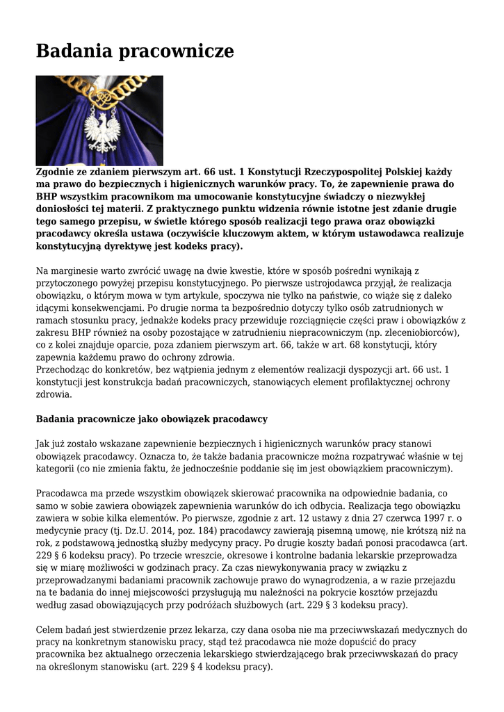 Badania pracownicze Zgodnie ze zdaniem pierwszym art. 66 ust. 1 Konstytucji Rzeczypospolitej Polskiej każdy ma prawo do bezpiecznych i higienicznych warunków pracy. To, że zapewnienie prawa do BHP wszystkim pracownikom ma umocowanie konstytucyjne świadczy o niezwykłej doniosłości tej materii. Z praktycznego punktu widzenia równie istotne jest zdanie drugie tego samego przepisu, w świetle którego sposób realizacji tego prawa oraz obowiązki pracodawcy określa ustawa (oczywiście kluczowym aktem, w którym ustawodawca realizuje konstytucyjną dyrektywę jest kodeks pracy). Na marginesie warto zwrócić uwagę na dwie kwestie, które w sposób pośredni wynikają z przytoczonego powyżej przepisu konstytucyjnego. Po pierwsze ustrojodawca przyjął, że realizacja obowiązku, o którym mowa w tym artykule, spoczywa nie tylko na państwie, co wiąże się z daleko idącymi konsekwencjami. Po drugie norma ta bezpośrednio dotyczy tylko osób zatrudnionych w ramach stosunku pracy, jednakże kodeks pracy przewiduje rozciągnięcie części praw i obowiązków z zakresu BHP również na osoby pozostające w zatrudnieniu niepracowniczym (np. zleceniobiorców), co z kolei znajduje oparcie, poza zdaniem pierwszym art. 66, także w art. 68 konstytucji, który zapewnia każdemu prawo do ochrony zdrowia. Przechodząc do konkretów, bez wątpienia jednym z elementów realizacji dyspozycji art. 66 ust. 1 konstytucji jest konstrukcja badań pracowniczych, stanowiących element profilaktycznej ochrony zdrowia. Badania pracownicze jako obowiązek pracodawcy Jak już zostało wskazane zapewnienie bezpiecznych i higienicznych warunków pracy stanowi obowiązek pracodawcy. Oznacza to, że także badania pracownicze można rozpatrywać właśnie w tej kategorii (co nie zmienia faktu, że jednocześnie poddanie się im jest obowiązkiem pracowniczym). Pracodawca ma przede wszystkim obowiązek skierować pracownika na odpowiednie badania, co samo w sobie zawiera obowiązek zapewnienia warunków do ich odbycia. Realizacja tego obowiązku zawiera w sobie kilka elementów. Po pierwsze, zgodnie z art. 12 ustawy z dnia 27 czerwca 1997 r. o medycynie pracy (tj. Dz.U. 2014, poz. 184) pracodawcy zawierają pisemną umowę, nie krótszą niż na rok, z podstawową jednostką służby medycyny pracy. Po drugie koszty badań ponosi pracodawca (art. 229 § 6 kodeksu pracy). Po trzecie wreszcie, okresowe i kontrolne badania lekarskie przeprowadza się w miarę możliwości w godzinach pracy. Za czas niewykonywania pracy w związku z przeprowadzanymi badaniami pracownik zachowuje prawo do wynagrodzenia, a w razie przejazdu na te badania do innej miejscowości przysługują mu należności na pokrycie kosztów przejazdu według zasad obowiązujących przy podróżach służbowych (art. 229 § 3 kodeksu pracy). Celem badań jest stwierdzenie przez lekarza, czy dana osoba nie ma przeciwwskazań medycznych do pracy na konkretnym stanowisku pracy, stąd też pracodawca nie może dopuścić do pracy pracownika bez aktualnego orzeczenia lekarskiego stwierdzającego brak przeciwwskazań do pracy na określonym stanowisku (art. 229 § 4 kodeksu pracy). Rodzaje badań pracowniczych Ustawodawca przewidział trzy rodzaje badań pracowniczych, z których każde ma nieco inną funkcje. Jako pierwsze wskazane zostały badania wstępne, na które kierowane są przede wszystkim osoby przyjmowane do pracy, ale także pracownicy młodociani przenoszeni na inne stanowiska pracy i inni pracownicy przenoszeni na stanowiska pracy, na których występują czynniki szkodliwe dla zdrowia lub warunki uciążliwe. Warto zauważyć, że sformułowanie „osoby przyjmowane do pracy” formalnie wskazuje, że badania te powinny być przeprowadzane jeszcze przed nawiązaniem stosunku pracy, czyli podlegać im powinni kandydaci do pracy. Potwierdzeniem tego jest przywoływany już zakaz dopuszczenia do pracy osoby bez zaświadczenia lekarskiego. Tym samym w przypadku skierowana na badanie wstępne już po podpisaniu umowy mogłoby powodować sytuację, w której pracodawca nie mógłby korzystać z pracy osoby, którą już zatrudnił. Od 21 marca 2011 r. badaniom wstępnym nie podlegają jednak osoby przyjmowane ponownie do pracy u danego pracodawcy na to samo stanowisko lub na stanowisko o takich samych warunkach pracy, na podstawie kolejnej umowy o pracę zawartej w ciągu 30 dni po rozwiązaniu lub wygaśnięciu poprzedniej umowy o pracę z tym pracodawcą. Uprzednio zwolnienie z badań dotyczyło jedynie sytuacji, gdy kolejna praca podejmowana była „bezpośrednio” po zakończeniu poprzedniego zatrudnienia. Wydaje się, że okres 30 dni jest rozsądnym rozwiązaniem, uwzględniającym zarówno interes pracownika (zapewnienie profilaktyki zdrowotnej) jak i pracodawcy (niższe koszty, zwłaszcza gdy pracownik podejmuje identyczną pracę jak dotychczas, np. po tygodniu przerwy w zatrudnieniu). Oprócz badań wstępnych ustawodawca przewidział jeszcze badania okresowe oraz kontrolne. Pierwsze, jak sama nazwa wskazuje, odbywają się regularnie, co pewien czas, a ich częstotliwość zależy od rodzaju czynników szkodliwych lub uciążliwych występujących w środowisku pracy. Z kolei badaniom kontrolnym pracownik podlega w przypadku niezdolności do pracy trwającej dłużej niż 30 dni, spowodowanej chorobą, a ich celem jest ustalenie zdolności do wykonywania pracy na dotychczasowym stanowisku. Dr Jakub Szmit to starszy specjalista w Zespole Prawnym KK NSZZ Solidarność