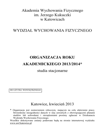 Akademia Wychowania Fizycznego im. Jerzego Kukuczki w Katowicach WYDZIAŁ WYCHOWANIA FIZYCZNEGO ORGANIZACJA ROKU AKADEMICKIEGO 2013/2014* studia stacjonarne DO UŻYTKU WEWNĘTRZNEGO Katowice, kwiecień 2013 * Organizacja jest zestawieniem roboczym, mającym na celu ułatwienie pracy. Stwierdzone niezgodności danych w niej zawartych z obowiązującymi planami studiów lub uchwałami i zarządzeniami prosimy zgłaszać w Dziekanacie Wydziału Wychowania Fizycznego. Wszelkie dokonywane zmiany podawane będą na stronie internetowej wydziału: www.awf.katowice.pl Dziekanat Wydziału Wychowania Fizycznego Akademia Wychowania Fizycznego im. Jerzego Kukuczki w Katowicach AWWF - 40-065 Katowice, ul. Mikołowska 72a / 2013 W załączeniu przekazuję organizację roku akademickiego 2013/2014 studiów stacjonarnych realizowanych na Wydziale Wychowania Fizycznego do wykorzystania w jednostkach organizacyjnych uczelni. Dziekan Wydziału Wychowania Fizycznego dr Wiesław Garbaciak, doc. Katowice, dnia 26.04.2013 r. Za zgodność: Kierownik Dziekanatu Wydziału Wychowania Fizycznego mgr Magdalena Dudek 1 studia stacjonarne 2013/2014 Liczba grup studenckich Liczba grup Rodzaj studiów Rok dziekańskie ćwiczeniowe WYCHOWANIE FIZYCZNE I Katowice 7* 14* Iab, IIab, IIIab, IVab, Vab, VIab, VIIab Zabrze 2 4 VIIIab, IXab specjalność: wychowanie fizyczne i gimnastyka korekcyjna II III 3-letnie studia pierwszego stopnia Katowice 4 7 Zabrze 1 1 Katowice 2 3 Vab, VIa Zabrze 1 1 Xa Iab, IIab, IIIab IVa b VIIa IXa b specjalność: wychowanie fizyczne i przyroda II III Katowice 2 3 Zabrze 1 1 Katowice 1 2 VIIab Zabrze - - - IVab, Vab, VIa VIIIa Xa b specjalność: wychowanie fizyczne i edukacja dla bezpieczeństwa III Katowice 3 6 Iab, IIab, IIIab, IVa Zabrze 1 2 VIIIab 6* 12* Iab, IIab. IIIab. IVab, Vab, VIab, VIIab, VIIIab sem. 1 Edukacja dla bezpieczeństwa 2-letnie studia drugiego stopnia I Trening sportowy sem. 2*** Taniec Edukacja dla bezpieczeństwa 5 1,5-roczne lub 2-letnie studia drugiego stopnia II 9 Iab, IIab, IIIab, IVab, Va Trening sportowy 2 3 VIab, VIIa Taniec 1 2 VIIIab * Liczba grup wg limitów przyjęć ** Specjalności realizowane są wspólnie dla Katowic i Zabrza w Katowicach *** Liczba grup zostanie ustalona po wyborach w sem. 1. 2 WYCHOWANIE FIZYCZNE stacjonarne 3-letnie studia pierwszego stopnia - rok I semestr 1 Dzień szkoleniowo-organizacyjny Zajęcia w semestrze zimowym Przerwa świąteczna Sesja egzaminacyjna Sesja poprawkowa Przerwa międzysemestralna 30.09.2013 01.10.2013 – 10.01.2014 21.12.2013 – 05.01.2014 13.01.2014 – 17.01.2014 20.01.2014 – 24.01.2014 27.01.2014 – 28.02.2014 Końcowy termin wpisu ocen w USOS 27.01.2014 Egzaminy Przedmiot Iab Anatomia Teoria wychowania fizycznego Historia kultury fizycznej i olimpizm IIab IIIab IVab Vab VIab VIIab VIIIab IXab Popr. 13.01 15.01 17.01 20.01 15.01 17.01 13.01 22.01 17.01 13.01 15.01 24.01 semestr 2 Zajęcia w semestrze letnim Termin wyboru specjalności Termin wyboru obozu szkoleniowego Przerwa świąteczna Przerwa majowa Sesja egzaminacyjna 03.03.2014 – 13.06.2014 3 tydzień zajęć 3 tydzień zajęć 17.04.2014 – 23.04.2014 28.04.2014 – 04.05.2014 16.06.2014 – 20.06.2014 Końcowy termin wpisu ocen w USOS dla sesji egz. 23.06.2014 Sesja poprawkowa 08.09.2014 – 12.09.2014 Końcowy termin wpisu ocen w USOS dla sesji popr. 15.09.2014 Egzaminy Przedmiot Iab IIab IIIab IVab Vab VIab VIIab VIIIab IXab Popr. Biochemia 16.06. 20.06. 18.06. 08.09. Antropomotoryka 18.06. 16.06. 20.06. 10.09. Sporty indywidualne: Gimnastyka 20.06. 18.06. 16.06. 12.09 3 WYCHOWANIE FIZYCZNE stacjonarne 3-letnie studia pierwszego stopnia - rok I semestr 1 Przedmiot Lp. semestr 2 13 tygodni w. ćw. ECTS grupy 13 tygodni w. ćw. ECTS E/Z 1. Anatomia 26 26 4 0 0 0 W/Ć ZO/E-1 2. Biochemia 0 0 0 26 26 4 W/Ć ZO/E-2 3. Antropomotoryka 0 0 0 26 26 4 W/Ć ZO/E-2 4. Filozofia – elementy etyki 0 0 0 26 13 3 W/D ZO-2 5. Historia kultury fizycznej i olimpizm 26 13 3 0 0 0 W/D ZO/E-1 6. Teoria wychowania fizycznego 26 26 4 0 0 0 W/D ZO/E-1 7. Higiena szkolna 13 13 2 0 0 0 W/Ć ZO-1 8. Ćwiczenia korekcyjno-kompensacyjne 13 13 2 0 0 0 W/Ć ZO-1 9. Sporty indywidualne: 0 0 0 0 0 0 – – a). Gimnastyka 0 26 2 0 26 2 Ć ZO/E-2 b). Lekka atletyka 0 13 1 0 26 2 Ć ZO/E-3 c). Pływanie 0 13 1 0 26 2 Ć ZO/E-3 10. Sporty zespołowe: 0 0 0 0 0 0 – – a). Koszykówka 0 26 2 0 0 0 Ć ZO/E-5 b). Piłka ręczna 0 0 0 0 26 2 Ć ZO/E-5 11. Język obcy 0 26 2 0 26 2 Ć ZO/E-5 12. Technologia informacyjna 0 13 1 0 13 1 D ZO-2 13. Pedagogika 26 13 3 26 13 3 W/D ZO-2 14. Psychologia 26 13 3 26 13 3 W/D ZO-2 15. Emisja głosu 0 0 0 13 13 2 W/Ć ZO-2 16. Szkolenie BHP 4 godziny w sem. 1 0 0 0 0 0 0 – ZZ-1 156 234 30 143 247 30 Razem 4 WYCHOWANIE FIZYCZNE stacjonarne 3-letnie studia pierwszego stopnia - rok II specjalność: wychowanie fizyczne i gimnastyka korekcyjna oraz specjalność: wychowanie fizyczne i przyroda semestr 3 Praktyka w ramach przygotowania psychologiczno – pedagogicznego (30 godz.) 23.09.2013 – 04.10.2013 Zajęcia w semestrze zimowym 07.10.2013 – 31.01.2014 Obóz szkoleniowy zimowy (do wyboru) rozpoczynający się w semestrze 3 z zaliczeniem w semestrze 4 04.01.2014 – 18.01.2014 04.01.2014 – 18.01.2014 Narciarstwo zjazdowe; Narciarstwo biegowe; Snowboard Przerwa świąteczna Sesja egzaminacyjna Sesja poprawkowa Przerwa międzysemestralna Termin złożenia indeksu w dziekanacie 21.12.2013 – 05.01.2014 03.02.2014 – 07.02.2014 10.02.2014 – 14.02.2014 17.02.2014 – 28.02.2014 17.02.2014 Egzaminy Gimnastyka korekcyjna Przyroda Przedmiot Popr. Iab Fizjologia Sporty indywidualne: Lekka atletyka Sporty indywidualne: Pływanie IIab IIIab IVa b IXa b Vab VIa Xa b 03.02 07.02 10.02 05.02 03.02 12.02 07.02 05.02 14.02 5 WYCHOWANIE FIZYCZNE stacjonarne 3-letnie studia pierwszego stopnia - rok II specjalność: wychowanie fizyczne i gimnastyka korekcyjna oraz specjalność: wychowanie fizyczne i przyroda semestr 4 Zajęcia w semestrze letnim 03