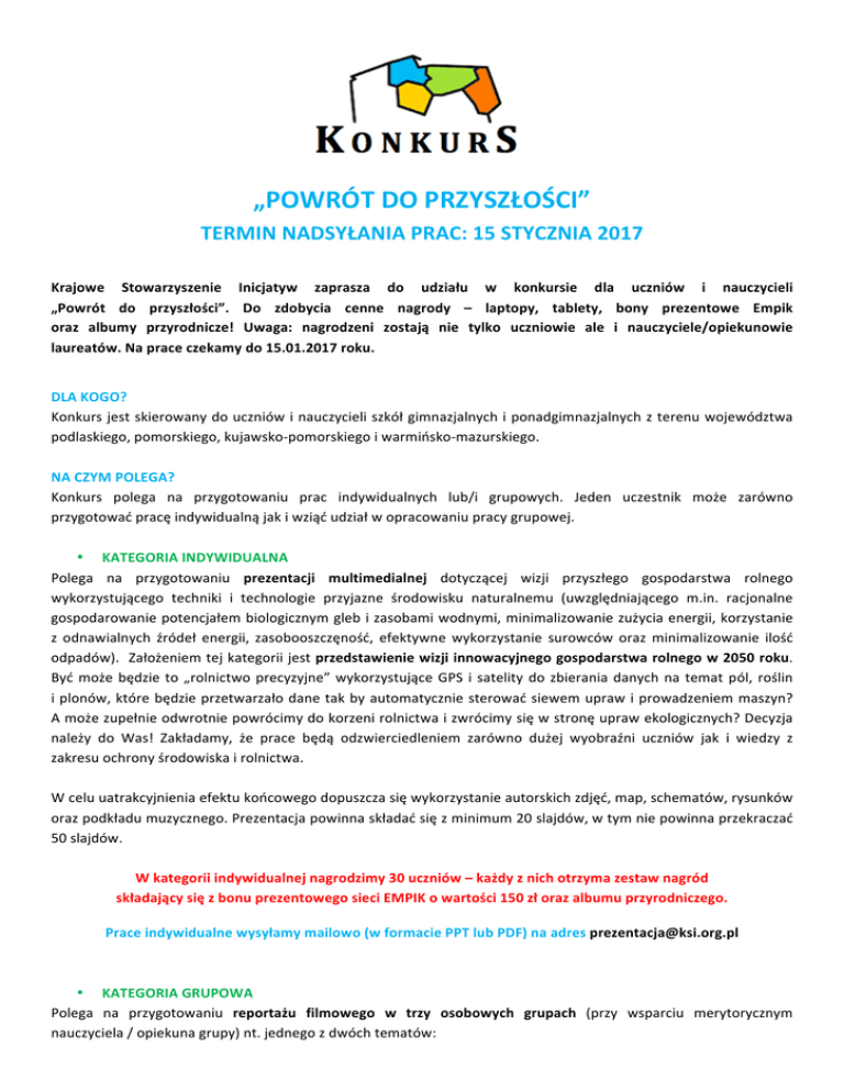 „POWRÓT DO PRZYSZŁOŚCI” TERMIN NADSYŁANIA PRAC: 15 STYCZNIA 2017 Krajowe Stowarzyszenie Inicjatyw zaprasza do udziału w konkursie dla uczniów i nauczycieli „Powrót do przyszłości”. Do zdobycia cenne nagrody – laptopy, tablety, bony prezentowe Empik oraz albumy przyrodnicze! Uwaga: nagrodzeni zostają nie tylko uczniowie ale i nauczyciele/opiekunowie laureatów. Na prace czekamy do 15.01.2017 roku. DLA KOGO? Konkurs jest skierowany do uczniów i nauczycieli szkół gimnazjalnych i ponadgimnazjalnych z terenu województwa podlaskiego, pomorskiego, kujawsko-‐pomorskiego i warmińsko-‐mazurskiego. NA CZYM POLEGA? Konkurs polega na przygotowaniu prac indywidualnych lub/i grupowych. Jeden uczestnik może zarówno przygotować pracę indywidualną jak i wziąć udział w opracowaniu pracy grupowej. • KATEGORIA INDYWIDUALNA Polega na przygotowaniu prezentacji multimedialnej dotyczącej wizji przyszłego gospodarstwa rolnego wykorzystującego techniki i technologie przyjazne środowisku naturalnemu (uwzględniającego m.in. racjonalne gospodarowanie potencjałem biologicznym gleb i zasobami wodnymi, minimalizowanie zużycia energii, korzystanie z odnawialnych źródeł energii, zasobooszczęność, efektywne wykorzystanie surowców oraz minimalizowanie ilość odpadów). Założeniem tej kategorii jest przedstawienie wizji innowacyjnego gospodarstwa rolnego w 2050 roku. Być może będzie to „rolnictwo precyzyjne” wykorzystujące GPS i satelity do zbierania danych na temat pól, roślin i plonów, które będzie przetwarzało dane tak by automatycznie sterować siewem upraw i prowadzeniem maszyn? A może zupełnie odwrotnie powrócimy do korzeni rolnictwa i zwrócimy się w stronę upraw ekologicznych? Decyzja należy do Was! Zakładamy, że prace będą odzwierciedleniem zarówno dużej wyobraźni uczniów jak i wiedzy z zakresu ochrony środowiska i rolnictwa. W celu uatrakcyjnienia efektu końcowego dopuszcza się wykorzystanie autorskich zdjęć, map, schematów, rysunków oraz podkładu muzycznego. Prezentacja powinna składać się z minimum 20 slajdów, w tym nie powinna przekraczać 50 slajdów. W kategorii indywidualnej nagrodzimy 30 uczniów – każdy z nich otrzyma zestaw nagród składający się z bonu prezentowego sieci EMPIK o wartości 150 zł oraz albumu przyrodniczego. Prace indywidualne wysyłamy mailowo (w formacie PPT lub PDF) na adres [email protected] • KATEGORIA GRUPOWA Polega na przygotowaniu reportażu filmowego w trzy osobowych grupach (przy wsparciu merytorycznym nauczyciela / opiekuna grupy) nt. jednego z dwóch tematów: 1.) Obecnie stosowanych innowacyjnych rozwiązań w lokalnych gospodarstwach rolnych, w szczególności uwzgledniających nowoczesne rozwiązania w procesie produkcyjnym w kontekście ochrony różnorodności biologicznej. Warunkiem niezbędnym w przygotowaniu filmu będzie: o Wyszukanie gospodarstwa rolnego stosującego innowacyjne techniki i technologie przyjazne środowisku naturalnemu oraz nawiązanie kontaktu z rolnikiem, który umożliwi prezentacje swoich rozwiązań rolniczych i produkcyjnych; o Nakręcenie krótkiego wstępu, w którym uczniowie wprowadzą widzów w temat; o Nakręcenie scen filmowych obrazujących gospodarstwo rolne i zastosowane w nim rozwiązania oraz przeprowadzenie rozmowy z rolnikiem, który w kilku zdaniach opowie o stosowanych rozwiązaniach oraz źródłach finansowania. o Nakręcenie podsumowania, w tym wskazania pozytywnych stron inwestowania w innowacyjne rozwiązania technologiczne. 2.) Obecnie realizowanych inicjatyw lokalnych o charakterze ochrony różnorodności biologicznej lub zaproponowania własnych inicjatyw (jeśli w danym regionie nie są ̨ realizowane). Warunkiem niezbędnym przygotowania filmu będzie: o Wyszukanie inicjatyw lokalnych o charakterze ochrony różnorodności biologicznej, realizowanych w ciągu ostatnich 5 lat; o Nakręcenie krótkiego wstępu, wprowadzającego w temat. o Nakręcenie scen filmowych przedstawiających inicjatywę ̨ wraz z komentarzem. Wskazanie źródeł finansowania, autorów itp. o Podsumowanie i zachęcenie potencjalnych widzów do podejmowania podobnych inicjatyw wraz ze wskazaniem pozytywnych aspektów. Prace grupowe wysyłamy nagrane na płytę CD/DVD w formacie AVI, MOV, WML lub MP4 na adres Krajowego Stowarzyszenia Inicjatyw ul. Poniatowskiego 109, 05-‐220 Zielonka. Decyduje data stempla pocztowego. W kategorii grupowej nagrodzimy 8 zespołów – każdy zespół otrzyma 3 tablety (po 1 tablecie dla każdego ucznia) oraz 1 laptopa (dla Opiekuna grupy). NAJWAŻNIEJSZE INFORMACJE Z REGULAMINU KONKURSU • Każdy uczestnik konkursu zostaje zgłoszony do udziału w konkursie przez swojego Opiekuna (Nauczyciela, Wychowawcę lub Opiekuna reprezentującego Szkołę Gimnazjalną lub Ponadgimnazjalną); • Każda z Placówek może być reprezentowana przez więcej niż jednego Opiekuna; • Jeden Opiekun może zgłosić do konkursu maksymalnie 30 prac w kategorii indywidualnej oraz 10 prac w kategorii grupowej; • Każda z prac musi być opisana: Tytułem pracy; Imieniem i nazwiskiem uczestnika konkursu; Nazwą, numerem i adresem placówki szkolnej; Imieniem i nazwiskiem Opiekuna; Numerem telefonu Opiekuna. Szczegółowe warunki udziału w konkursie są dostępne w Regulaminie Konkursu dostępnym na stronie www.psorb.pl Szczegółowych informacji o konkursie udziela Zespół Zarządzający Projektem pn. „Północna Strategia Ochrony Różnorodności Biologicznej: Dariusz Chmiel (tel.: 668 391 591, e-‐mail: [email protected]) oraz Magdalena Hyska (tel.: 604 822 886, e-‐mail: [email protected]). Konkurs wspierają: Stachursky, Maciej Smoliński, Marcin Siegieńczuk, Zespół Basta oraz najsłynniejszy rolnik w Polsce – Adam Kraśko, którzy przekażą niespodzianki muzyczne dla laureatów.